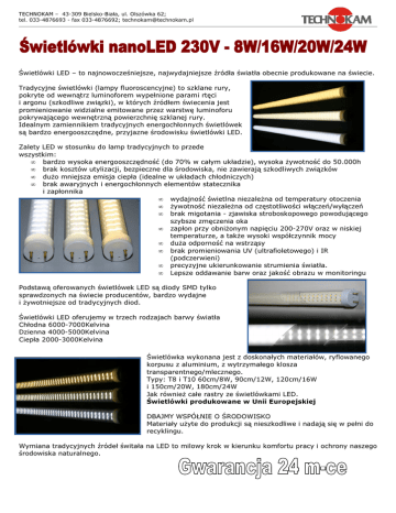 TECHNOKAM – 43-309 Bielsko-Biała, ul. Olszówka 62; tel. 033-4876693 - fax 033-4876692; [email protected] Świetlówki LED – to najnowocześniejsze, najwydajniejsze źródła światła obecnie produkowane na świecie. Tradycyjne świetlówki (lampy fluoroscencyjne) to szklane rury, pokryte od wewnątrz luminoforem wypełnione parami rtęci i argonu (szkodliwe związki), w których źródłem świecenia jest promieniowanie widzialne emitowane przez warstwę luminoforu pokrywającego wewnętrzną powierzchnię szklanej rury. Idealnym zamiennikiem tradycyjnych energochłonnych świetlówek są bardzo energooszczędne, przyjazne środowisku świetlówki LED. Zalety LED w stosunku do lamp tradycyjnych to przede wszystkim: • bardzo wysoka energooszczędność (do 70% w całym układzie), wysoka żywotność do 50.000h • brak kosztów utylizacji, bezpieczne dla środowiska, nie zawierają szkodliwych związków • dużo mniejsza emisja ciepła (idealne w układach chłodniczych) • brak awaryjnych i energochłonnych elementów statecznika i zapłonnika • wydajność świetlna niezależna od temperatury otoczenia • żywotność niezależna od częstotliwości włączeń/wyłączeń • brak migotania - zjawiska stroboskopowego powodującego szybsze zmęczenia oka • zapłon przy obniżonym napięciu 200-270V oraz w niskiej temperaturze, a także wysoki współczynnik mocy • duża odporność na wstrząsy • brak promieniowania UV (ultrafioletowego) i IR (podczerwieni) • precyzyjne ukierunkowanie strumienia światła. • Lepsze oddawanie barw oraz jakość obrazu w monitoringu Podstawą oferowanych świetlówek LED są diody SMD tylko sprawdzonych na świecie producentów, bardzo wydajne i żywotniejsze od tradycyjnych diod. Świetlówki LED oferujemy w trzech rodzajach barwy światła Chłodna 6000-7000Kelvina Dzienna 4000-5000Kelvina Ciepła 2000-3000Kelvina Świetlówka wykonana jest z doskonałych materiałów, ryflowanego korpusu z aluminium, z wytrzymałego klosza transparentnego/mlecznego. Typy: T8 i T10 60cm/8W, 90cm/12W, 120cm/16W i 150cm/20W, 180cm/24W Jak również całe rastry ze świetlówkami LED. Świetlówki produkowane w Unii Europejskiej DBAJMY WSPÓŁNIE O ŚRODOWISKO Materiały użyte do produkcji są nieszkodliwe i nadają się w pełni do recyklingu. Wymiana tradycyjnych źródeł świtała na LED to milowy krok w kierunku komfortu pracy i ochrony naszego środowiska naturalnego.