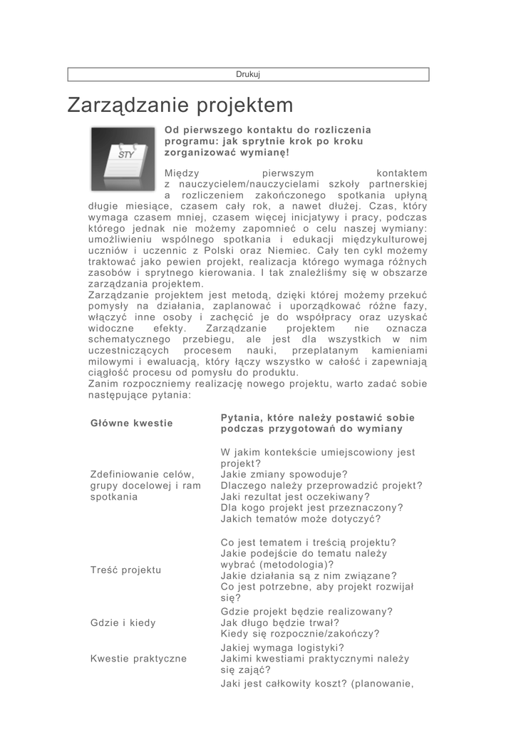 Drukuj Zarządzanie projektem Od pierwszego kontaktu do rozliczenia programu: jak sprytnie krok po kroku zorganizować wymianę! Między pierwszym kontaktem z nauczycielem/nauczycielami szkoły partnerskiej a rozliczeniem zakończonego spotkania upłyną długie miesiące, czasem cały rok, a nawet dłużej. Czas, który wymaga czasem mniej, czasem więcej inicjatywy i pracy, podczas którego jednak nie możemy zapomnieć o celu naszej wymiany: umożliwieniu wspólnego spotkania i edukacji międzykulturowej uczniów i uczennic z Polski oraz Niemiec. Cały ten cykl możemy traktować jako pewien projekt, realizacja którego wymaga różnych zasobów i sprytnego kierowania. I tak znaleźliśmy się w obszarze zarządzania projektem. Zarządzanie projektem jest metodą, dzięki której możemy przekuć pomysły na działania, zaplanować i uporządkować różne fazy, włączyć inne osoby i zachęcić je do współpracy oraz uzyskać widoczne efekty. Zarządzanie projektem nie oznacza schematycznego przebiegu, ale jest dla wszystkich w nim uczestniczących procesem nauki, przeplatanym kamieniami milowymi i ewaluacją, który łączy wszystko w całość i zapewniają ciągłość procesu od pomysłu do produktu. Zanim rozpoczniemy realizację nowego projektu, warto zadać sobie następujące pytania: Główne kwestie Pytania, które należy postawić sobie podczas przygotowań do wymiany Zdefiniowanie celów, grupy docelowej i ram spotkania W jakim kontekście umiejscowiony jest projekt ? Jakie zmiany spowoduje? Dlaczego należy przeprowadzić projekt ? Jaki rezultat jest oczekiwany ? Dla kogo projekt jest przeznaczony ? Jakich tematów może dotyczyć ? Treść projektu Gdzie i kiedy Kwestie praktyczne Co jest tematem i treścią projektu? Jakie podejście do tematu należy wybrać (metodologia) ? Jakie działania są z nim związane ? Co jest potrzebne, aby projekt rozwijał się? Gdzie projekt będzie realizowany? Jak długo będzie trwał ? Kiedy się rozpocznie/zakończy? Jakiej wymaga logistyki? Jakimi kwestiami praktycznymi należy się zająć? Jaki jest całkowity koszt? (planowanie, Fundusze Partner Środki działania Komunikacja Ewaluacja i kontynuacja przeprowadzenie, ewaluacja) Skąd będą pochodziły niezbędne fundusze? Kim są partnerzy ? Jaka jest ich rola ? Jak trzeba przygotować się do koordynowania działań ? Czy projekt kwalifikuje się do jakiejś pomocy finansowej ? Czy można wykorzystać istniejące zaplecze (warunki) ? Komunikacja wewnętrzna: Jaki jest obieg informacji w obrębie zespołu projektu? Komunikacja zewnętrzna: Czy projekt potrzebuje wsparcia mediów ? (dlaczego? w jaki sposób ? które aspekty ?) Jak i kiedy projekt powinien zostać poddany ewaluacji ? Które jego aspekty ? Dlaczego ? Jaka faza kontynuacji jest planowana według © Rada Europy i Komisja Europejska, Zarządzanie projektem, Pakiet szkoleniowy, T -KIT 3, 2000, ISBN 83 -914928-85 Po rozpoczęciu projektu ‚zarządzanie’ wszystkim potrzebnych zasobów: ● Czasu ● pieniędzy ● pomieszczeń, materiałów, techniki ● osób uczestniczących nim dotyczy przede do tego dochodzi ewaluacja podczas całego czasu trwania projektu (czy nadal idziemy obraną drogą, czy mieścimy się w harmonogramie, w budżecie, czy wszyscy są poinformowani i zmotywowani ?) oraz końcowe podsumowanie ze spojrzeniem na wyniki i konsekwencje projektu także dla ew. dalszych programów oraz projektów. Czas jest jedynym niezmiennym zasobem: niezależnie od tego, jak dobrze się nim ‚zarządza’ każdy dzień ma tylko 24 godziny, a rok 12 miesięcy. Ile czasu możemy poświęcić na projekt ‘wymiana szkół’ zależy jednak od wielu czynników: kiedy rozpoczynają się przygotowania ? Jak długo trwać będzie sama wymiana ? Do kiedy musimy zrobić podsumowanie i rozliczenie programu? I podczas całego projektu: jaki może być wkład czasowy nauczycieli odpowiedzialnych za wymianę ? Poniższy model „planowanie harmonogramu działań“ odnosi się do sytuacji, w której nie działa jeszcze partnerstwo szkół i nie ma wcześniejszych doświadczeń, z których można by skorzystać; przy realizacji spotkań w istniejącym partnerstwie niektóre z przedziałów czasowych mogą ulec znacznej redukcji: Planowanie harmonogramu działań Rysujemy oś czasu, od -12 do +2, jednostka podziału to miesiące, zero to termin rozpoczęcia wymiany. Nanosimy święta i dni wolne, zarówno we własnej szkole jak i u partnera (w różnych kolorach) .w tych przedziałach komunikacja może być trudniejsza, główne działania warto zaplanować poza tymi terminami. -12 do 10 -10 do 8 -8 do 6 -8 do 4 -6 do 3 -6 do 3 -4 do 2 szukanie szkoły partnerskiej, pierwszy kontakt, ustalenie celu, grupy i terminu spotkania poznanie nauczycieli ze szkoły partnerskiej, ew. wizyta w szkole partnerskiej, uzyskanie zgody dyrekcji szkół, ew. w formie pisemnego 'porozumienia' informacja dla uczniów i nauczycieli o planowanej wymianie, wstępny projekt programu, plan kosztów zaplanowanie zakwaterowania i ew. rezerwacji noclegów (jeśli grupa nie będzie zakwaterowana w rodzinach) złożenie wspólnego wniosku do PNWM (im szybciej, tym lepiej, niektóre jednostki centralne mają wewnętrzne, wcześniejsze terminy) planowanie podróży, rezerwacja autobusu bądź biletów kolejowych, wyjaśnienie kwestii wizowych (dot. uczniów innego niż niemieckie lub polskie pochodzenie) wiążące zgłoszenia uczestników, organizacja zakwaterowania w rodzinach spotkanie przygotowawcze kadry prowadzącej (przy pierwszym wspólnym programie), szczegółowe planowanie -3 programu, informacje dla grona pedagogicznego, włączenie do - innych nauczycieli i zewnętrznych partnerów kooperacyjnych, 1 spotkanie przygotowawcze i omówienie ważnych kwestii z uczestnikami, nawiązanie kontaktu mailowego między polskimi i niemieckimi uczniami, organizacja wycieczek zebranie opłaty za udział, wywiadówka i list informacyjny dla -1 rodziców, zgoda