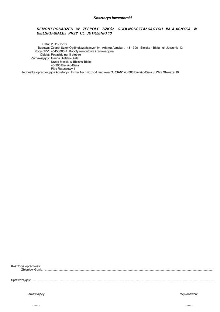 Kosztorys inwestorski REMONT POSADZEK W ZESPOLE SZKÓŁ OGÓLNOKSZTAŁCĄCYCH IM. A.ASNYKA W BIELSKU-BIAŁEJ PRZY UL. JUTRZENKI 13 Data: Budowa: Kody CPV: Obiekt: Zamawiający: 2011-03-18 Zespół Szkół Ogólnokształcących im. Adama Asnyka , 43 - 300 Bielsko - Biała ul. Jutrzenki 13 45453000-7 Roboty remontowe i renowacyjne Posadzki na II piętrze Gmina Bielsko-Biała Urząd Miejski w Bielsku-Białej 43-300 Bielsko-Biała Plac Ratuszowy 1 Jednostka opracowująca kosztorys: Firma Techniczno-Handlowa "ARSAN" 43-300 Bielsko-Biała ul.Wita Stwosza 10 Kosztorys opracowali: Zbigniew Gunia, ................................................................................................................................................................................................................ Sprawdzający: ................................................................................................................................................................................................................................ Zamawiający: Wykonawca: .......... .......... Przedmiar robót Podstawa nakładu, opis pozycji, wyliczenie ilości robót Ilość Krot. Jedn. 1 CHODNIKI 1 KNR 401/212/1 Roboty rozbiórkowe, elementy betonowe niezbrojone, grubości do 15·cm (5,9*8,1-2,8*0,55)*0,15 = 6,937500 6,94 2 KNR 231/815/2 Rozebranie chodników, wysepek przystankowych i przejść dla pieszych, płyty betonowe 50x50x7·cm na podsypce piaskowej 2,0*24,0 = 48,000000 48,00 3 KNR 231/102/5 Koryta wykonywane na poszerzeniach, na chodnikach, grunt kategorii II-IV, głębokość 10·cm 4 KNR 231/102/6 Koryta wykonywane na poszerzeniach, na chodnikach, grunt kategorii II-IV, dodatek kaŜde dalsze 5·cm głębokości 5 KNR 401/108/6 Wywóz samochodami samowyładowczymi do 1·km, grunt kategorii III 48,0*0,2 = 9,600000 9,60 6 KNR 401/108/11 Wywóz gruzu spryzmowanego samochodami samowyładowczymi do 1·km 48,0*0,07+6,94 = 10,300000 10,30 7 KNR 401/108/12 Wywóz gruzu spryzmowanego samochodami samowyładowczymi na kaŜdy następny 1·km 8 KALKULACJA WŁASNA - opłata za składowanie gruzu betonowego 10,3*2,0 = 20,600000 20,60 9 KNR 231/103/2 Profilowanie i zagęszczanie podłoŜa pod warstwy konstrukcyjne nawierzchni, ręcznie, grunt kategorii III-IV 10 KNR 231/114/1 Podbudowy z kruszyw, pospółka, warstwa dolna, grubość warstwy po zagęszczeniu 20·cm 11 KNR 231/114/2 Podbudowy z kruszyw, pospółka, warstwa dolna, dodatek za kaŜdy dalszy 1·cm grubości 12 KNR 231/104/1 Warstwy odsączające, w korycie i na poszerzeniach, zagęszczenie ręczne, grubość warstwy po zagęszczeniu·10·cm 13 KNR 231/105/1 Warstwy podsypkowe, podsypka piaskowa, zagęszczenie ręczne grubość warstwy po zagęszczeniu 3·cm 14 KNR 231/511/2 (1) Nawierzchnie z kostki brukowej betonowej, grubość 6·cm, na podsypce cementowo-piaskowej, kostka szara 55,5+(5,9*8,1-2,8*0,55) = 101,750000 101,75 15 KNR 231/402/4 Ławy pod krawęŜniki, betonowa z oporem -B-15 48,0*0,2*0,1 = 0,960000 0,96 16 KNR 231/407/4 ObrzeŜa betonowe, 30x8·cm na podsypce piaskowej z wypełnieniem spoin zaprawą cementową 24,0*2 = 48,000000 48,00 6,94 m3 48,00 m2 48,00 m2 48,00 2 m2 9,60 m3 10,30 m3 10,30 5 m3 20,60 t 48,00 m2 48,00 m2 48,00 -10 m2 48,00 m2 48,00 m2 101,75 m2 0,96 m3 48,00 m 2 REMONT POSADZEK Budynek I 17 KNR 401/807/4 Zerwanie posadzek lub okładzin z masy lastrykowej cokoliki II piętro (19,55*2+2,57*5-2,73+7,5*2+9,74*2-2,62-2,0+ 15,9*2+2,58*2-2,7-9*0,95)*0,15 Cokoliki klatka schodow ((2*10*(0,16+0,31)+1,5*2+2,67)*2+((10+11)* (0,16+0,31)+1,5*2+2,67)*2)*0,15 OSTATNI BIEG 0,3*2,67*2 = 15,718500 = = 9,183000 1,602000 26,50 26,50 m2 168,606300 68,436000 0,000000 237,04 237,04 m2 68,436000 68,44 68,44 m2 68,44 m2 68,44 8 m2 68,44 m2 18 KNNRW 3/808/3 Szlifowanie, pastowanie i froterowanie posadzek lastrykowych, pomieszczenie o powierzchni ponad 8·m2 II posadzka 2,67*19,55+0,46*2,73+7,5*9,74+15,9*2,58+2,7*0,4 = Klatki schodowe (2,67*1,50+(21)*(0,32+0,16)*1,3)*4 = = 19 BC 2/415/1 Podkład posadzkowy szybkowiąŜący , warstwa sczepna - klatka schodowa Klatki schodowe (2,67*1,50+(21)*(0,32+0,16)*1,3)*4 = 20 KNRW 202/1105/1 (3) Warstwy wyrównawcze i wygładzające, niwelacyjno-wyrównawcza cementowa grubości 2·mm, zatarta na gładko 21 KNRW 202/1105/2 (3) Warstwy wyrównawcze i wygładzające, dodatek za pogrubienie o 1·mm 22 ORGB 202/2810/5 (2) Okładziny schodów z płytek kamionkowych "Gres" na zaprawach klejowych, warstwa kleju grubości 5·mm, płytki 30x30, zaprawa "Ceresit" Płytki Schodowe ANTYPOŚLIZGOWE klasy min. R 10 strona nr: 2 REMONT POSADZEK W ZESPOLE SZKÓŁ OGÓLNOKSZTAŁCĄCYCH IM. A.ASNYKA W BIELSKU-BIAŁEJ PRZY UL. JUTRZENKI 13 Podstawa nakładu, opis pozycji, wyliczenie ilości robót 23 KNR 202/1122/2 Cokoliki na schodach z płytek układanych na klej, metoda kombinowana, przygotowanie podłoŜa, cokolik wysokości 15·cm ((2*10*(0,16+0,31)+1,5*2+2,67)*2+((10+11)* (0,16+0,31)+1,5*2+2,67)*2) = 61,220000 61,22 24 KNR 202/1122/8 Cokoliki na schodach z płytek układanych na klej, metoda kombinowana, z przycinaniem płytek, cokolik wysokości 15·cm 25 BC 2/415/1 Podkład posadzkowy szybkowiąŜący , warstwa sczepna 2,67*19,55+0,46*2,73+7,5*9,74+15,9*2,58+2,7*0,4 = 168,606300 168,61 26 KNR 202/1118/1 Posadzki płytkowe z kamieni sztucznych układanych na klej, przygotowanie podłoŜa 27 ORGB 202/2806/5 (2) Posadzki jednobarwne z płytek kamionkowych "Gres" na zaprawach klejowych w pomieszczeniach ponad 10 m2, warstwa kleju grubości 5·mm, płytki 30x30,Płytki GRES ANTYPOŚLIZGOWE klasy min. R 10 28 KNR 202/1120/4 Cokoliki płytkowe z kamieni sztucznych na klej - z przycinaniem płytek, płytki 30x30·cm, cokolik 15·cm, przygotowanie podłoŜa cokoliki II pietro (19,55*2+2,57*5-2,73+7,5*2+9,74*2-2,62-2,0+ 15,9*2+2,58*2-2,7-9*0,95) = 104,790000 104,79 29 KNR 202/1120/5 Cokoliki płytkowe z kamieni sztucznych na klej - z przycinaniem płytek, płytki 30x30·cm, cokolik 15·cm, metoda zwykła 30 KNNR 2/805/7 Analogi