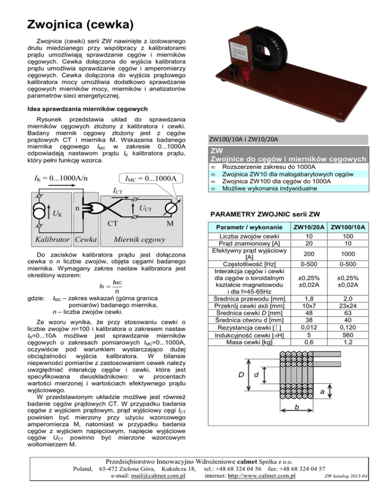 Zwojnica (cewka) Zwojnice (cewki) serii ZW nawinięte z izolowanego drutu miedzianego przy współpracy z kalibratorami prądu umożliwiają sprawdzanie cęgów i mierników cęgowych. Cewka dołączona do wyjścia kalibratora prądu umożliwia sprawdzanie cęgów i amperomierzy cęgowych. Cewka dołączona do wyjścia prądowego kalibratora mocy umożliwia dodatkowo sprawdzanie cęgowych mierników mocy, mierników i analizatorów parametrów sieci energetycznej. Idea sprawdzania mierników cęgowych Rysunek przedstawia układ do sprawdzania mierników cęgowych złożony z kalibratora i cewki. Badany miernik cęgowy złożony jest z cęgów prądowych CT i miernika M. Wskazania badanego miernika cęgowego IMC w zakresie 0...1000A odpowiadają nastawom prądu IK kalibratora prądu, który pełni funkcję wzorca. IK = 0...1000A/n IMC = 0...1000A ICT UK n UCT CT Kalibrator Cewka ZW Zwojnice do cęgów i mierników cęgowych • • • • Rozszerzenie zakresu do 1000A Zwojnica ZW10 dla małogabarytowych cęgów Zwojnica ZW100 dla cęgów do 1000A Możliwe wykonania indywidualne PARAMETRY ZWOJNIC serii ZW M Miernik cęgowy Do zacisków kalibratora prądu jest dołączona cewka o n liczbie zwojów, objęta cęgami badanego miernika. Wymagany zakres nastaw kalibratora jest określony wzorem: IMC IK = n gdzie: ZW100/10A i ZW10/20A IMC – zakres wskazań (górna granica pomiarów) badanego miernika, n – liczba zwojów cewki. Ze wzoru wynika, że przy stosowaniu cewki o liczbie zwojów n=100 i kalibratora o zakresem nastaw IK=0...10A możliwe jest sprawdzanie mierników cęgowych o zakresach pomiarowych IMC=0...1000A, oczywiście pod warunkiem wystarczająco dużej obciążalności wyjścia kalibratora. W bilansie niepewności pomiarów z zastosowaniem cewek należy uwzględniać interakcję cęgów i cewki, która jest specyfikowana dwuskładnikowo: w procentach wartości mierzonej i wartościach efektywnego prądu wyjściowego. W przedstawionym układzie możliwe jest również badanie cęgów prądowych CT. W przypadku badania cęgów z wyjściem prądowym, prąd wyjściowy cęgi ICT powinien być mierzony przy użyciu wzorcowego amperomierza M, natomiast w przypadku badania cęgów z wyjściem napięciowym, napięcie wyjściowe cęgów UCT powinno być mierzone wzorcowym woltomierzem M. Parametr / wykonanie Liczba zwojów cewki Prąd znamionowy [A] Efektywny prąd wyjściowy [A] Częstotliwość [Hz] Interakcja cęgów i cewki dla cęgów o toroidalnym kształcie magnetowodu i dla f=45-65Hz Średnica przewodu [mm] Przekrój cewki axb [mm] Średnica cewki D [mm] Średnica otworu d [mm] Rezystancja cewki [Ω] Indukcyjność cewki [µH] Masa cewki [kg] D ZW10/20A ZW100/10A 10 20 100 10 200 1000 0-500 0-500 ±0,25% ±0,02A ±0,25% ±0,02A 1,8 10x7 48 38 0,012 5 0,6 2,0 23x24 63 40 0,120 560 1,2 d a b Przedsiębiorstwo Innowacyjno Wdrożeniowe calmet Spółka z o.o. Poland, 65-472 Zielona Góra, Kukułcza 18, e-mail: [email protected] tel.: +48 68 324 04 56 fax: +48 68 324 04 57 internet: http://www.calmet.com.pl ZW katalog 2013-04