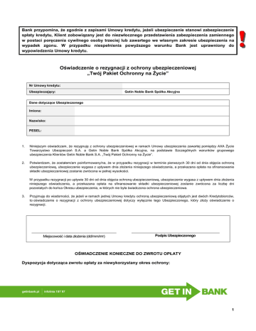 Bank przypomina, że zgodnie z zapisami Umowy kredytu, jeżeli ubezpieczenie stanowi zabezpieczenie spłaty kredytu, Klient zobowiązany jest do niezwłocznego przedstawienia zabezpieczenia zamiennego w postaci poręczenia cywilnego osoby trzeciej lub zawartego we własnym zakresie ubezpieczenia na wypadek zgonu. W przypadku niespełnienia powyższego warunku Bank jest uprawniony do wypowiedzenia Umowy kredytu. Oświadczenie o rezygnacji z ochrony ubezpieczeniowej „Twój Pakiet Ochronny na Życie” Nr Umowy kredytu: Ubezpieczający: Getin Noble Bank Spółka Akcyjna Dane dotyczące Ubezpieczonego Imiona: Nazwisko: PESEL: 1. Niniejszym oświadczam, że rezygnuję z ochrony ubezpieczeniowej w ramach Umowy ubezpieczenia zawartej pomiędzy AXA Życie Towarzystwo Ubezpieczeń S.A. a Getin Noble Bank Spółka Akcyjna, na podstawie Szczególnych warunków grupowego ubezpieczenia Klientów Getin Noble Bank S.A. „Twój Pakiet Ochronny na Życie”. 2. Potwierdzam, że zostałem/am poinformowany/na, że w przypadku rezygnacji w terminie pierwszych 30 dni od dnia objęcia ochroną ubezpieczeniową, ubezpieczenie wygasa z upływem dnia złożenia niniejszego oświadczenia, a przekazana opłata na sfinansowanie składki ubezpieczeniowej zostanie zwrócona w pełnej wysokości. W przypadku rezygnacji po upływie 30 dni od dnia objęcia ochroną ubezpieczeniową, ubezpieczenie wygasa z upływem dnia złożenia niniejszego oświadczenia, a przekazana opłata na sfinansowanie składki ubezpieczeniowej zostanie zwrócona za liczbę dni pozostałych do końca Okresu ubezpieczenia, w których nie była świadczona ochrona ubezpieczeniowa. 3. Przyjmuję do wiadomości, że jeżeli w ramach jednej Umowy kredytu ochroną ubezpieczeniową objętych jest dwóch Kredytobiorców, to oświadczenie o rezygnacji z ochrony ubezpieczeniowej dotyczy wyłącznie tego Ubezpieczonego, który złoży oświadczenie o rezygnacji. Miejscowość i data złożenia (dd/mm/rrrr) Podpis Ubezpieczonego OŚWIADCZENIE KONIECZNE DO ZWROTU OPŁATY Dyspozycja dotycząca zwrotu opłaty za niewykorzystany okres ochrony: 1 Nr Umowy kredytu: --------------------------------------------------------------------------------------------------------------------------------------Zwrotu opłaty ubezpieczeniowej za niewykorzystany okres ubezpieczenia w zakresie rezygnacji z ochrony ubezpieczeniowej należy dokonać: * na NRB do spłaty kredytu, celem: * zmniejszenia wysokości pozostałych do spłaty rat i zachowania pierwotnego okresu kredytowania, * skrócenia okresu kredytowania i pozostawienie wysokości rat na tym samym poziomie lub * na NRB rachunku bankowego o numerze: -------------------------------------------------------------------------------------------- dane właściciela rachunku bankowego (niezbędne do przelewu): ---------------------------------------------------------------- ------------------------------------------------------------------------------------------------------------------------------------------------------------- UWAGA! W przypadku, gdy składający niniejszą dyspozycję jest jednym z Kredytobiorców, w celu realizacji zwrotu opłaty za niewykorzystany okres ochrony, oświadczenie powinno być podpisane przez wszystkich Kredytobiorców. _________________________________________________________ Miejscowość i data złożenia dyspozycji (dd/mm/rrrr) ____________________________________________ ____________________________________________ Podpis Ubezpieczonego/Kredytobiorcy 1 Podpis Kredytobiorcy 2 Wypełniane w przypadku, gdy oświadczenie składane jest za pośrednictwem Ubezpieczającego: Wypełnia Ubezpieczający – Bank (osoba upoważniona przez Bank) Stwierdza się zgodność danych z okazanym dokumentem tożsamości oraz potwierdza własnoręczność złożonego podpisu. ---------------------------------------------------Miejscowość i data ___________________________ ------------------------------------------------------------------Podpis i pieczęć przedstawiciela Banku 2