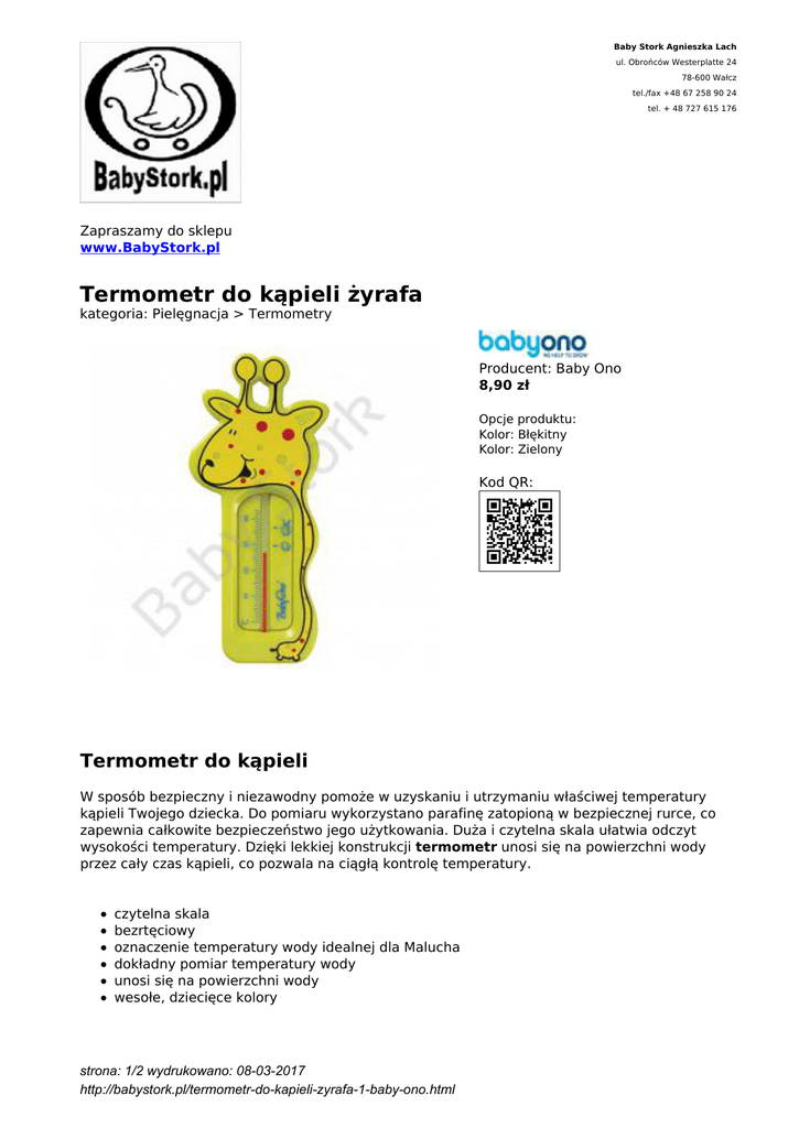 Baby Stork Agnieszka Lach ul. Obrońców Westerplatte 24 78-600 Wałcz tel./fax +48 67 258 90 24 tel. + 48 727 615 176 Zapraszamy do sklepu www.BabyStork.pl Termometr do kąpieli żyrafa kategoria: Pielęgnacja > Termometry Producent: Baby Ono 8,90 zł Opcje produktu: Kolor: Błękitny Kolor: Zielony Kod QR: Termometr do kąpieli W sposób bezpieczny i niezawodny pomoże w uzyskaniu i utrzymaniu właściwej temperatury kąpieli Twojego dziecka. Do pomiaru wykorzystano parafinę zatopioną w bezpiecznej rurce, co zapewnia całkowite bezpieczeństwo jego użytkowania. Duża i czytelna skala ułatwia odczyt wysokości temperatury. Dzięki lekkiej konstrukcji termometr unosi się na powierzchni wody przez cały czas kąpieli, co pozwala na ciągłą kontrolę temperatury. czytelna skala bezrtęciowy oznaczenie temperatury wody idealnej dla Malucha dokładny pomiar temperatury wody unosi się na powierzchni wody wesołe, dziecięce kolory strona: 1/2 wydrukowano: 08-03-2017 http://babystork.pl/termometr-do-kapieli-zyrafa-1-baby-ono.html strona: 2/2 wydrukowano: 08-03-2017 http://babystork.pl/termometr-do-kapieli-zyrafa-1-baby-ono.html
