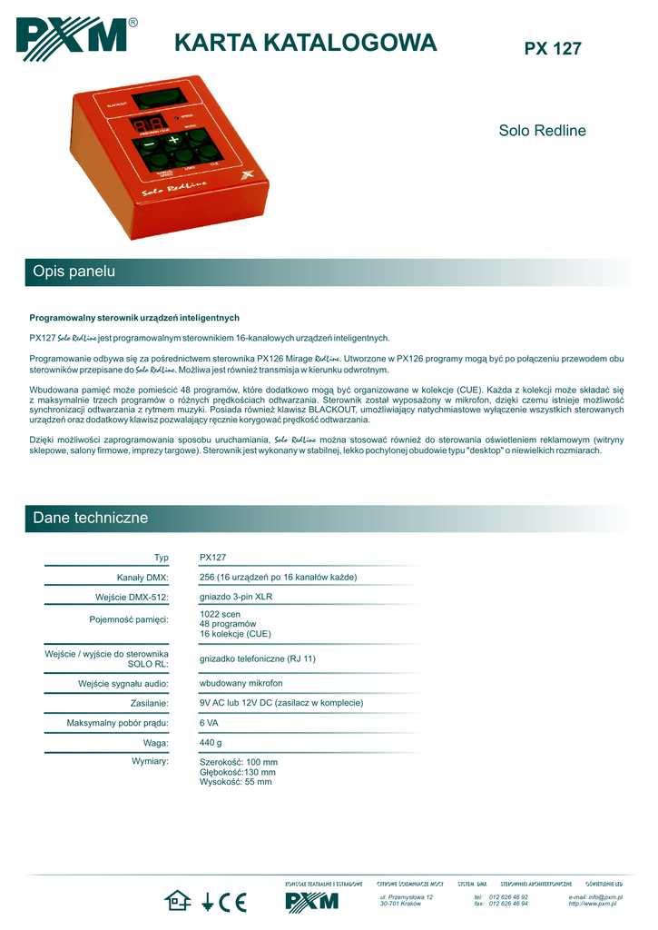 R KARTA KATALOGOWA PX 127 Solo Redline Opis panelu Programowalny sterownik urządzeń inteligentnych PX127 Solo RedLine jest programowalnym sterownikiem 16-kanałowych urządzeń inteligentnych. Programowanie odbywa się za pośrednictwem sterownika PX126 Mirage RedLine. Utworzone w PX126 programy mogą być po połączeniu przewodem obu sterowników przepisane do Solo RedLine. Możliwa jest również transmisja w kierunku odwrotnym. Wbudowana pamięć może pomieścić 48 programów, które dodatkowo mogą być organizowane w kolekcje (CUE). Każda z kolekcji może składać się z maksymalnie trzech programów o różnych prędkościach odtwarzania. Sterownik został wyposażony w mikrofon, dzięki czemu istnieje możliwość synchronizacji odtwarzania z rytmem muzyki. Posiada również klawisz BLACKOUT, umożliwiający natychmiastowe wyłączenie wszystkich sterowanych urządzeń oraz dodatkowy klawisz pozwalający ręcznie korygować prędkość odtwarzania. Dzięki możliwości zaprogramowania sposobu uruchamiania, Solo RedLine można stosować również do sterowania oświetleniem reklamowym (witryny sklepowe, salony firmowe, imprezy targowe). Sterownik jest wykonany w stabilnej, lekko pochylonej obudowie typu "desktop" o niewielkich rozmiarach. Dane techniczne Typ Kanały DMX: Wejście DMX-512: Pojemność pamięci: Wejście / wyjście do sterownika SOLO RL: Wejście sygnału audio: Zasilanie: Maksymalny pobór prądu: Waga: Wymiary: PX127 256 (16 urządzeń po 16 kanałów każde) gniazdo 3-pin XLR 1022 scen 48 programów 16 kolekcje (CUE) gnizadko telefoniczne (RJ 11) wbudowany mikrofon 9V AC lub 12V DC (zasilacz w komplecie) 6 VA 440 g Szerokość: 100 mm Głębokość:130 mm Wysokość: 55 mm Konsole teatralne i estradowE Cyfrowe ściemniacze mocy ul. Przemysłowa 12 30-701 Kraków SYSTEM dmx Sterowniki ARCHITEKTONICZNE tel: 012 626 46 92 fax: 012 626 46 94 OŚWIETLENIE LED e-mail: [email protected] http://www.pxm.pl R PX 127 Schemat podłączenia Gniazdo do podłączenia sterownika Mirage RedLine PRODUCT No. SERIAL No. MIRAGE RL LINK PX127 www.proxima.eu DMX OUT PUSH OFF MAINS 9V AC / 12 V DC ON Wyjście DMX Zasilanie sterownika (zasilacz zewnętrzny dostarczany jest w komplecie ze sterownikiem). Rysunek techniczny PRODUCT No. SERIAL No. MIRAGE RL LINK PX127 www.proxima.eu 55 mm DMX OUT PUSH OFF MAINS 9V AC / 12 V DC ON BLACKOUT - PROGRAM + - + MANUAL SPEED LOAD SoLo RedLine 130 mm SPEED MUSIC CUE PX 127 100 mm Konsole teatralne i estradowE Cyfrowe ściemniacze mocy ul. Przemysłowa 12 30-701 Kraków SYSTEM dmx Sterowniki ARCHITEKTONICZNE tel: 012 626 46 92 fax: 012 626 46 94 OŚWIETLENIE LED e-mail: [email protected] http://www.pxm.pl