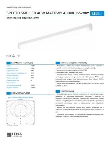 SZCZEGÓŁOWA KARTA PRODUKTU SPECTO SMD LED 40W MATOWY 4000K 1552mm OŚWIETLENIE PRZEMYSŁOWE PARAMETRY TECHNICZNE indeks : 343711 - Natynkowa, sufitowa lub ścienna kompaktowa oprawa diodowa o Napięcie zasilajace : 230V wysokich parametrach, charakteryzująca się zwartą konstrukcją. Częstotliwość linii : 50Hz - Wyposażona w energooszczędne panele LED GO! Moc nominalna źródła światła : 40W - Podstawa stalowa, malowana proszkowo. Stopień ochrony IK : IK02 Stopień ochrony IP : IP40 Klasa energetyczna : A Klasa ochrony : I Temperatura barwowa : 4000K Strumień świetlny : 3750lm - Specjalistyczny, wysoce sprawny, wielowarstwowy, pryzmatyczny klosz zawierający odporną na promieniowanie UV osłonę PMMA oraz polipropylenową optykę, bądź jednowarstwowy klosz mleczny PMMA wysoce odporny na promieniowanie UV. - Temperatura barwowa 4000K, CRI>80, trwałość paneli LED 50 000 godzin (L70B50) ta= 25 ºC. CHARAKTERYSTYKA PRODUKTU KRZYWE ŚWIATŁOŚCI SPECTO SMD LED 40W MATOWY 4000K 1552mm ZASTOSOWANIE - Wielozadaniowa oprawa diodowa przeznaczona do stosowania wewnątrz budynków, do oświetlenia pomieszczeń użytkowych i korytarzy w budynkach użyteczności publicznej (administracja, szkolnictwo, służba zdrowia), szczególnie polecana do zastosowania w miejscach o ograniczonej przestrzeni montażowej oraz w zastosowaniu jako oświetlenie uzupełniające. - Oprawa do zastosowania zarówno przy nowych aplikacjach jak i zamianach tradycyjnych opraw T8 i T5 na energooszczędne rozwiązania LED GO!. - Konstrukcja przystosowana do montażu natynkowego (sufitowego bądź ściennego) za pomocą standardowego wyposażenia. SZCZEGÓŁOWA KARTA PRODUKTU SPECTO SMD LED 40W MATOWY 4000K 1552mm OŚWIETLENIE PRZEMYSŁOWE TABELA PARAMETRÓW TECHNICZNYCH indeks: 343711 Napięcie zasilajace: 230V Źródło światła: LED GO! Źródło światła wymienne: Nie Częstotliwość linii: 50Hz Moc nominalna źródła światła: 40W Stopień ochrony IK: IK02 Stopień ochrony IP: IP40 Skuteczność świetlna: 94lm/W Klasa energetyczna: A Klasa ochrony: I Wymiary: 1552/84/45mm Waga: 2,1kg Materiał korpusu: Blacha stalowa malowana proszkowo Temperatura barwowa: 4000K Temperatura pracy oprawy: -17°C +35°C Strumień świetlny: 3750lm Moc znamionowa oprawy: 44W Współczynnik mocy lampy: 0,9 Kod EAN: 5905963343711 Materiał klosza: PMMA Rodzaj klosza: PRM MAT Nominalny okres trwałości lampy: 50 000 h Znamionowa trwałość lampy: 50 000 h Współczynnik zachowania strumienia świetlnego na zakończenie nominalnego okresu 0,8 trwałości: Awaryjność 5000h: ≤1% Liczba cykli włącz / wyłącz poprzedzająca przedwczesny koniec 25000 eksploatacji: Czas nagrzewania się lampy do 60% pełnego strumienia świetlnego: pomijalny Współpraca z ściemniaczami: Brak możliwości ściemniania Do zastosowań zewnętrznych: Tak Rozkład widmowy mocy: (0,38; 0,38) Oddawanie barw: Ra>80 Jednolitość barwy: (0,38; 0,38) Nominalny kąt promieniowania: 120° www.lenalighting.pl | Strona 2 SZCZEGÓŁOWA KARTA PRODUKTU SPECTO SMD LED 40W MATOWY 4000K 1552mm OŚWIETLENIE PRZEMYSŁOWE RYSUNKI TECHNICZNE A=1552 B=84 C=45 SZCZEGÓŁY TECHNICZNE Data aktualizacji karty: 2016-01-27 54/2013 www.lenalighting.pl | Strona 3