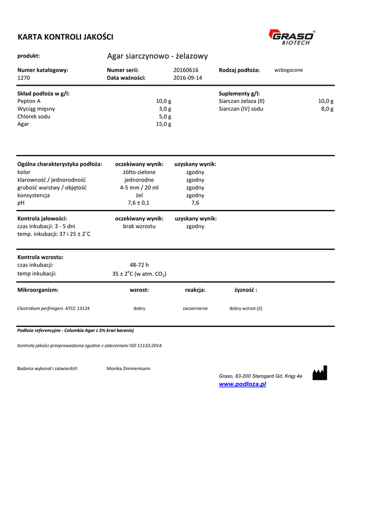 KARTA KONTROLI JAKOŚCI produkt: Agar siarczynowo - żelazowy Numer katalogowy: 1270 Numer serii: Data ważności: Skład podłoża w g/l: Pepton A Wyciąg mięsny Chlorek sodu Agar 20160616 2016-09-14 oczekiwany wynik: żółto-zielone jednorodne 4-5 mm / 20 ml żel 7,6 ± 0,1 uzyskany wynik: zgodny zgodny zgodny zgodny 7,6 Kontrola jałowości: czas inkubacji: 3 - 5 dni temp. inkubacji: 37 i 25 ± 2˚C oczekiwany wynik: brak wzrostu uzyskany wynik: zgodny Mikroorganizm: Clostridium perfringers ATCC 13124 wzbogacone Suplementy g/l: Siarczan żelaza (II) Siarczan (IV) sodu 10,0 g 3,0 g 5,0 g 15,0 g Ogólna charakterystyka podłoża: kolor klarowność / jednorodność grubość warstwy / objętość konsystencja pH Kontrola wzrostu: czas inkubacji: temp inkubacji: Rodzaj podłoża: 48-72 h 35 ± 2 C (w atm. CO2) o wzrost: reakcja: żyzność : dobry zaczernienie dobry wzrost (2) Podłoże referencyjne - Columbia Agar z 5% krwi baraniej Kontrola jakości przeprowadzona zgodnie z zaleceniami ISO 11133:2014. Badania wykonał i zatwierdził: Monika Zimmermann Graso, 83-200 Starogard Gd, Krąg 4a www.podloza.pl 10,0 g 8,0 g