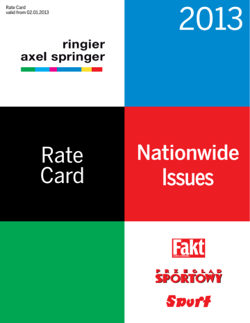 Rate Card valid from 02.01.2013 Rate Card 2013 Nationwide Issues Contens General Information 2 FAKT, Przegląd Sportowy + Sport 3 GRPower, PressPower, PressPack 4 Formats 5 FAKT TV, GWIAZDY 6 Tygodnik PS, Skarb Kibica 7 Technical Specifications 8 Other Forms of Advertising, Printing Houses 9 General Conditions 10 General Information Publisher Ringier Axel Springer Polska Sp. z o.o., ul. Domaniewska 52, -672 Warszawa www.ringieraxelspringer.pl President: Edyta Sadowska Financial Details Bank Account Number: Deutsche Bank Polska SA, nr NIP --- For International Clients: SWIFT CODE: DEUTPLPX IBAN: Deadlines Orders Materials FAKT, Przegląd Sportowy, Sport 3 working days 2 working days FAKT TV, Skarb Kibica 11 working days 8 working days Magazyn Sportowy 7 working days 3 working days GWIAZDY 10 working days 7 working days FAKT Mieszkanie, Motoryzacja, Zdrowie, Zakupy i inne 4 working days 3 working days FAKT Flat, Motorisation, Health, Shopping and others GRPower Sales Rules GRPower is a package of rating points whose cost depends on the package choice and ad’s format. Basic rating packages are GRPower 35, GRPower 45 and GRPower 50. The offer focuses on four dailies of Ringier Axel Springer Polska: FAKT, Przegląd Sportowy and Sport. It includes advertising formats: Junior Page (205 x 248 mm) and Full Page DE6 (246 x 362 mm). The basis of the GRPower package sale is the average level of readership (AIR) in a group: all, aged 16-49 during the last three months since the date of booking the campaign. Using this type of sale, the Dailies Sales Department decides on the ad placement and the day of publication, however it is the advertiser who defines duration of the campaign – minimum 8 days, maximum 30 days. PressPower Package offers publication of the ads in the same format and on the same day in all dailies of Ringier Axel Springer Polska. The offer guarantees minimum level of co-readership and the greatest reach due to the publication on the same day. Dailies Advertising Sales Department – Contact Phone: + 48 232 13 83; Fax: + 48 232 55 34 www.ringieraxelspringer.pl e-mail: [email protected] e-mail: [email protected] 2 Dailies Rate Card – Nationwide Issues Editorial and Advertising Pages in the Nationwide Issues FAKT Advert Placement Available Formats Size w x h mm Monday Tuesday Wednesday Thursday Friday Saturday Other Editorial Pages DE6 – Full Page Junior Page DA1 – 1 module 246 x 362 205 x 248 38 x 42 95 000 61 750 2 270 75 000 48 750 1 800 75 000 48 750 1 800 115 000 75 000 2 750 95 000 61 750 2 270 75 000 48 750 1 800 DS1 DS2 DS3 DS1A DS2A 85 x 30 246 x 26 246 x 50 123 x 50 80 x 50 60 000 50 000 95 000 45 000 35 000 53 500 45 000 85 000 40 000 32 000 53 500 45 000 85 000 40 000 32 000 70 000 60 000 110 000 50 000 45 000 60 000 50 000 95 000 45 000 35 000 53 500 45 000 85 000 40 000 32 000 Page 3 DE6 – Full Page Junior Page 246 x 362 205 x 248 150 000 105 000 120 000 84 000 120 000 84 000 185 000 130 000 150 000 105 000 120 000 84 000 Pages 4 - 5 DE6 – Full Page Junior Page DA1 – 1 module 246 x 362 205 x 248 38 x 42 126 000 81 900 3 020 99 000 64 300 2 380 99 000 64 300 2 380 152 000 99 000 3 650 126 000 81 900 3 020 99 000 64 300 2 380 Pages 6 - 7 DE6 – Full Page Junior Page DA1 – 1 module 246 x 362 205 x 248 38 x 42 120 000 78 000 2 870 94 500 61 500 2 270 94 500 61 500 2 270 145 000 94 500 3 480 120 000 78 000 2 870 94 500 61 500 2 270 Pages 8 - 9 DE6 – Full Page Junior Page DA1 – 1 module 246 x 362 205 x 248 38 x 42 115 000 74 800 2 750 90 000 58 500 2 150 90 000 58 500 2 150 138 000 90 000 3 300 115 000 74 800 2 750 90 000 58 500 2 150 Thusday Friday Saturday 121 600 117 800 76 800 81 100 101 600 100 800 66 900 67 850 81 600 79 800 54 900 54 850 Basic Offer Page Premium 1 Offer + Multimedia Offer Other Editorial Pages + ROS efakt.pl 1/1 full page + Double billboard (50 tys. PV CAPP 3) 1/1 full page + Rectangle (50 tys. PV CAPP 3) junior page + Double billboard (50 tys. PV CAAP 3) junior page + Rectangle (50 tys. PV CAAP 3) Monday Tuesday 101 600 100 800 66 900 67 850 81 600 79 800 54 900 54 850 Wednesday 81 600 79 800 54 900 54 850 Editorial and Advertising Pages in the Nationwide Issues Przegląd Sportowy + Sport Advert Placement Available Formats Size w x h mm Monday Tuesday Wednesday Thursday Friday Saturday DE6 – Full Page Junior Page DA1 – 1 module 246 x 362 205 x 248 38 x 42 55 000 36 000 1 320 35 000 22 800 840 35 000 22 800 840 35 000 22 800 840 40 000 27 000 960 35 000 22 800 840 DS1 DS2 DS3 DS1A DS2A 85 x 30 246 x 26 246 x 50 123 x 50 80 x 50 12 500 16 500 23 000 13 000 9 500 8 500 11 500 15 500 8 500 5 500 8 500 11 500 15 500 8 500 5 500 8 500 11 500 15 500 8 500 5 500 10 000 14 500 20 000 11 000 8 000 8 500 11 500 15 500 8 500 5 500 Page 3 DE6 – Full Page Junior Page 246 x 362 205 x 248 76 300 50 000 51 100 33 200 51 100 33 200 51 100 33 200 58 500 38 000 51 100 33 200 Pages 4 - 5 DE6 – Full Page Junior Page DA1 – 1 module 246 x 362 205 x 248 38 x 42 72 700 47 200 1 740 46 300 30 000 1 100 46 300 30 000 1 100 46 300 30 000 1 100 53 000 34 500 1 270 46 300 30 000 1 100 Pages 6 - 7 DE6 – Full Page Junior Page DA1 – 1 module 246 x 362 205 x 248 38 x 42 69 300 45 000 1 660 44 100 28 700 1 050 44 100 28 700 1 050 44 100 28 700 1 050 50 400 32 700 1 200 44 100 28 700 1 050 Pages 8 - 9 DE6 – Full Page Junior Page DA1 – 1 module 246 x 362 205 x 248 38 x 42 66 000 43 200 1 580 42 000 27 300 1 000 42 000 27 300 1 000 42 000 27 300 1 000 48 000 31 200 1 150 42 000 27 300 1 000 DE6 – Full Page 246 x 362 76 300 51 100 51 100 51 100 58 000 51 100 Wednesday Thusday Friday Saturday 42 000 40 800 29 300 28 400 47 000 45 800 34 300 32 600 42 000 40 800 29 300 28 400 Other Basic Editorial Offer Pages Page Premium 1 Offer Last page + Multimedia Offer Other Editorial Pages + ROS przegladsportowy.pl Monday 1/1 full page + Double billboard (50 tys. PV CAPP 3) 1/1 full page + Rectangle (50 tys. PV CAPP 3) junior page + Double billboard (50 tys. PV 