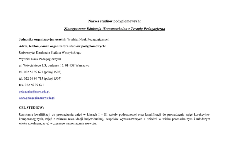 Nazwa studiów podyplomowych: Zintegrowana Edukacja Wczesnoszkolna z Terapią Pedagogiczną Jednostka organizacyjna uczelni: Wydział Nauk Pedagogicznych Adres, telefon, e-mail organizatora studiów podyplomowych: Uniwersytet Kardynała Stefana Wyszyńskiego Wydział Nauk Pedagogicznych ul. Wóycickiego 1/3, budynek 15, 01-938 Warszawa tel. 022 56 99 677 (pokój 1508) tel. 022 56 99 715 (pokój 1507) fax. 022 56 99 671 [email protected], www.pedagogika.uksw.edu.pl CEL STUDIÓW: Uzyskanie kwalifikacji do prowadzenia zajęć w klasach I – III szkoły podstawowej oraz kwalifikacji do prowadzenia zajęć korekcyjnokompensacyjnych, zajęć z zakresu rewalidacji indywidualnej, zespołów wyrównawczych z dziećmi w wieku przedszkolnym i młodszym wieku szkolnym, zajęć wczesnego wspomagania rozwoju. ADRESACI: Osoby posiadające dyplom ukończenia studiów wyższych (magisterskich lub zawodowych) na kierunku „pedagogika”, nie posiadające uprawnień do wykonywania zawodu nauczyciela zintegrowanej edukacji wczesnoszkolnej. Osoby posiadające dyplom ukończenia studiów wyższych (I lub II stopnia) na kierunku „psychologia” i „socjologia” wraz z przygotowaniem pedagogicznym – ukończone studia podyplomowe, kurs kwalifikacyjny lub studium pedagogizacji (dyplom). CZAS TRWANIA STUDIÓW 3 semestry, zajęcia w trybie piątkowo-sobotnim (zjazdy dwa razy w miesiącu) PLANOWANY TERMIN ROZPOCZĘCIA ZAJĘĆ październik 2013 (minimalna liczba uczestników – 30 osób, maksymalna – 70 osób) lub luty 2014 ( w przypadku nie skompletowania grupy w pierwszym terminie) WYSOKOŚĆ CZESNEGO 1850 zł za semestr FORMA UKOŃCZENIA STUDIÓW Praca dyplomowa SYLWETKA ABSOLWENTA Absolwent studiów posiada wiedzę teoretyczną z zakresu psychologii dziecka w wieku wczesnoszkolnym oraz wiedzą i umiejętnościami praktycznymi w zakresie planowania, organizowania, realizowania i ewaluacji procesu wychowawczo-dydaktycznego na etapie edukacji wczesnoszkolnej (klasy I – III szkoły podstawowej). Wykazuje się metodycznym przygotowaniem w zakresie organizowania i prowadzenia zajęć zintegrowanych w obszarach edukacji: polonistycznej, matematycznej, przyrodniczej, plastycznej, technicznej, ruchowej i medialnej. Absolwent umie w sposób refleksyjny i twórczy posługiwać się metodami, środkami oraz formami procesu kształcenia charakterystycznymi dla edukacji elementarnej. Posiada przygotowanie w zakresie diagnozowania potrzeb i organizowania procesu opiekuńczo-wychowawczego na etapie klas początkowych. Umie organizować i doskonalić swój warsztat pracy, rozwiązywać problemy i przeciwdziałać trudnościom wychowawczo-dydaktycznym, w tym niepowodzeniom szkolnym; współpracować z rodzicami dziecka i instytucjami, wspierającymi jego rozwój. Absolwent studiów jest także przygotowany do organizacji i prowadzenia zajęć o charakterze stymulacyjnym, wspomagającym i korekcyjno-kompensacyjnym z dziećmi przejawiającymi specyficzne trudności w uczeniu się, uniemożliwiające uzyskanie osiągnięć wynikających z podstawy programowej dla danego etapu edukacyjnego. Ponadto absolwent jest przygotowany do prowadzenia zajęć stymulujących rozwój dzieci uzdolnionych. Program studiów umożliwia absolwentom zdobycie przygotowania w zakresie posługiwania się środkami pedagogicznymi niezbędnymi w procesie diagnozy, poradnictwa i terapii oraz interdyscyplinarnej współpracy ze specjalistami, niosącymi pomoc w sytuacji trudnej dla dziecka i rodziny. Absolwent uzyskuje więc również kompetencje pedagoga – terapeuty, umożliwiające mu podejmowanie profesjonalnych zabiegów profilaktycznych, wspomagających i terapeutycznych w procesie dydaktycznowychowawczym realizowanym wgrupach przedszkolnych i klasach szkolnych. Jest zatem przygotowany do prowadzenia zajęć korekcyjno kompensacyjnych, socjoterapeutycznych, porad i konsultacji dla uczniów, rodziców i nauczycieli. ECTS Nazwa przedmiotu 2 Psychologiczne aspekty rozwoju dziecka w wieku wczesnoszkolnym – mgr A. Grzeszczuk Podstawy edukacji obywatelskiej – mgr B. Sapiejewska-Dąbrowska Pedagogika wczesnoszkolna – dr E. Kulawska Teoretyczne podstawy terapii pedagogicznej – mgr A. Czekalska Komunikacja interpersonalna w edukacji wczesnoszkolnej – mgr K. Malinowska Praca wychowawcza i współpraca z rodziną - dr Z. Babicki, dwiczenia mgr E. Śmiechowska-Petrovskij Profilaktyka w szkole – dr B. Skowrooski Kształcenie zintegrowane w klasach I – III – dr E. Kulawska Diagnostyka pedagogiczna – dr B. Skowrooski Środowisko wychowawcze rodziny i szkoły – dr Z. Babicki Edukacja literacko-językowa w systemie zintegrowanym – wykład: dr E. 1 3 3 1 3 1 3 3 1 3 Forma zal. Godziny zajęć W tym razem W Ć Rozkład godzin zajęć I semestr II semestr III semestr W Ć W Ć W Ć E 10 10 10 z/o E E z/o 10 10 10 10 10 10 10 10 z/o 20 10 z/o z/o E z/o z/o 10 10 10 5 22 10 10 10 5 7 10 10 10 10 10 10 10 10 10 10 5 15 7 15 3 2 2 1 2 2 2 2 1 1 1 2 4 2 2 1 1 1 3 Kulawska, dwiczenia mgr A. Karpioska Edukacja matematyczna w systemie zintegrowanym – wykład: dr E. Kulawska, dw. mgr I. Szurała Metodyka pracy z uczniem zdolnym w edukacji zintegrowanej – mgr A. Karpioska Edukacja w zakresie ekspresji twórczej w systemie zintegrowanym – mgr A. Karpioska Metodyka zajęd muzyczno-ruchowych w edukacji zintegrowanej – mgr O. Kaczyoska Edukacja zdrowotna w systemie zintegrowanym – dr P. Abramczyk Metodyka zajęd korekcyjno-kompensacyjnych z dziedmi z dysfunkcją wzroku – mgr E. Śmiechowska-Petrovskij Metodyka zajęd korekcyjno-kompensacyjnych z dziedmi z dysfunkcją słuchu – dr K. Wereszka Metodyka zajęd korekcyjno-kompensacyjnych z dziedmi z zaburzeniami rozwoju ruchowego – dr K. Krawiecka Techniki multimedialne w edukacji zintegrowanej – mgr E. ŚmiechowskaPetrovskij Warsztat pracy nauczyciela edukacji zintegrowanej – mgr I. Szurała Programy i podręczniki w edukacji zintegrowanej – mgr A. Karpioska Metodyka zajęd korekcyjn