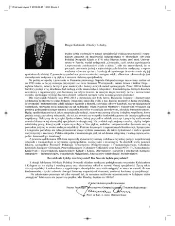 111 list kusz:Layout 1 2013-06-07 16:59 Strona 1 Drogie Koleżanki i Drodzy Koledzy, trudno sobie wyobrazić w naszej specjalności większą uroczystość i wspanialszy zaszczyt od możliwości uczestniczenia w obchodach 100-lecia Polskiej Ortopedii. Kiedy w 1741 roku Nicolas Andry, prof. med. Uniwersytetu w Paryżu, wydał podręcznik „Ortopedia, czyli sztuka zapobiegania i poprawiania zniekształceń ciała u dzieci”, nikt nie przewidywał, że to początek powstania jednej z najważniejszych dziedzin medycyny, a wprowadzona wówczas rycina z korekcją skrzywionego drzewka stanie się jej symbolem do dzisiaj. Z pewnością symbol ten przetrwa również następne wieki, albowiem rekonstrukcja jest nierozłącznie związana z tą piękną i zarazem niełatwą specjalnością. Na polską ortopedię i powstanie w Poznaniu pierwszego Szpitala Ortopedycznego musieliśmy czekać aż do 1913 roku, a do jej rozwoju przyczynili się m.in. Ireneusz Wierzejewski, Adam Gruca i Wiktor Dega – wybitni lekarze, autorzy licznych prac naukowych i twórcy nowych metod operacyjnych. Przez 100 lat historii burzliwy postęp w tej dziedzinie był zasługą wielu znamienitych ortopedów i traumatologów, których dorobek zawodowy i organizacyjny jest doceniany na całym świecie. W naszym kraju powstały liczne i nowoczesne ośrodki, spełniające wymogi leczenia chorób i obrażeń narządu ruchu na najwyższym poziomie. Dla wszystkich Polaków lata 1913-2013 z pewnością nie były łatwe. Działania wojenne i dramatyczne wydarzenia polityczne to okres bolesny i tragiczny także dla wielu z nas. Dzisiaj możemy z dumą stwierdzić, że ortopedzi i traumatolodzy zdali celująco egzamin z historii, stawiając sobie w każdych, nawet najcięższych warunkach, ratowanie życia ludzkiego za cel nadrzędny. Wielu Naszych Mistrzów i Nauczycieli wykazało się postawą godną najwyższego uznania i szacunku, nie tylko w aspekcie zawodowym, ale także humanistycznym. Będąc spadkobiercami tych jakże przepięknych tradycji, stanowimy pewną elitarną i odrębną wspólnotę, która posiada swoją zawodową tożsamość, ale też jest otwarta na wszystkie środowiska gotowe do interdyscyplinarnej współpracy. Należymy do tej części Społeczeństwa, której przypadł w udziale zaszczyt i przywilej realizowania zawodu lekarza w tej niezwykłej specjalności chirurgicznej. Na co dzień wykonujemy rzetelną, ciężką i odpowiedzialną pracę, której wyniki często wywołują w Nas piękne, unikalne i niepowtarzalne doznania oraz są powodem jedynej w swoim rodzaju satysfakcji. Podczas krajowych i zagranicznych Konferencji, Sympozjów i Kongresów potrafimy nie tylko prezentować swoje wybitne dokonania, ale także dyskutować o nich w sposób merytoryczny i rzeczowy. Polska ortopedia i traumatologia jest już od dawna integralną i ważną częścią ortopedii i traumatologii światowej! Z pewnością dokonania 100-lecia zapewniły dynamiczny rozwój i zdobycie wysokiej pozycji współczesnej ortopedii i traumatologii w wymiarze ogólnopolskim, europejskim i światowym. To dorobek wielu pokoleń lekarzy, szczególnie Prezesów Polskiego Towarzystwa Ortopedycznego i Traumatologicznego, Członków kolejnych Zarządów Głównych, Przewodniczących i Członków Oddziałów oraz Sekcji PTO i Tr., Konsultantów Krajowych i Wojewódzkich, Kierowników Katedr i Klinik, Ordynatorów, starszych i młodszych Kolegów Ortopedów – Traumatologów, wspaniałych Pielęgniarek, Specjalistów rehabilitacji i bioinżynierów. Bez nich nie byłoby teraźniejszości! Bez Nas nie będzie przyszłości! Z okazji Jubileuszu 100-lecia Polskiej Ortopedii składam serdeczne podziękowania wszystkim Koleżankom i Kolegom za ich ciężką i rzetelną pracę oraz nieoceniony wkład w rozwój Naszej specjalności. Życzę także dalszej satysfakcji i zadowolenia z wypełnianych obowiązków oraz wielu osiągnięć w trosce o wartość dla nas fundamentalną – życie i zdrowie chorego! Jesteśmy wspaniałymi lekarzami, ponieważ kochamy tę specjalizację! Na zakończenie pozostaje mi tylko wyrazić żal, że następna możliwość uczestniczenia w kolejnym takim „okrągłym” Jubileuszu nie pojawi się prędko. Moi Drodzy, dopiero za 100 lat! Z koleżeńskimi pozdrowieniami Prezes Polskiego Towarzystwa Ortopedycznego i Traumatologicznego Prof. dr hab. n. med. Damian Kusz 1