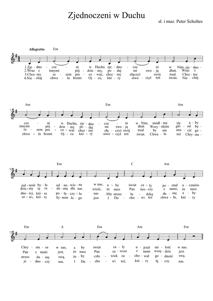 Zjednoczeni w Duchu sł. i muz. Peter Scholtes Em Allegretto 4 1.Zje dno 2.Wraz z 3.Chce my 4.Nie chaj cze innymi ra chwa ni pój zem pra ła brzmi w Duchu zje dno dzie my, po daj co wać, chce my Oj cu, któ ry Am 5 cze mi złączyć stwo ni ją swój rzył ten swo w Nim, zje dno dłoń. Wraz z trud. Chce my świat. Nie chaj Em Am cze innymi ra chwa ni pój zem pra ła brzmi w Duchu, zje dno dzie my po daj co wać chce my Oj cu któ ry w Nim, módl my dłoń Wszy stkim trud by nie świat. Chwa ła ni swo ją czyć swój rzył ten cze mi złą stwo Em C się gło stra też a sić cić Chry by bę go stu Am 10 jed dzie dno so ność by my tę ści, któ wi, któ ła ra ra ry Em od do po Sy no sną łą nem wio dla czy Je na nas ła go A w nas, a wieść, że nas Aby jest I by nasz strzec Du Em świat Pan lu cho ca ły kro czy dzką wi też po znał u czniów z nami, że nasz by du mę a chwa ła, któ ry Am Em 15 Chry Pan strzec je stu sa z nami du mę dno czy w nas, jest, swą, nas. a by że nasz że by I Du świat Pan czło cho ca ły za wsze wiek za wi też, u jrzał mi łość z nami wszę dzie cho wał go dność któ ry łą czy w nas. jest. swą. nas.