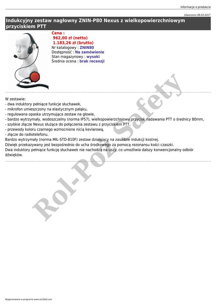 Informacje o produkcie Utworzono 08-03-2017 Indukcyjny zestaw nagłowny ZNIN-P80 Nexus z wielkopowierzchniowym przyciskiem PTT Cena : 962,00 zł (netto) 1.183,26 zł (brutto) fe ty Nr katalogowy : ZNIN80 Dostępność : Na zamówienie Stan magazynowy : wysoki Średnia ocena : brak recenzji R ol -P oż Sa W zestawie: - dwa induktory pełniące funkcje słuchawek, - mikrofon umieszczony na elastycznym pałąku, - regulowana opaska utrzymująca zestaw na głowie, - bardzo wytrzymały, wodoszczelny (norma IP57), wielkopowierzchniowy przycisk nadawania PTT o średnicy 80mm, - szybkie złącze Nexus służące do połączenia zestawu z przyciskiem PTT, - przewody koloru czarnego wzmocnione nicią kevlarową, - złącze do radiotelefonu. Bardzo wytrzymały (norma MIL-STD-810F) zestaw działający na zasadzie indukcji kostnej. Dźwięk przekazywany jest bezpośrednio do ucha środkowego za pomocą rezonansu kości czaszki. Dwa induktory pełniące funkcję słuchawek nie nachodzą na uszy, co umożliwia dalszy konwencjonalny odbiór dźwięków. Wygenerowano w programie www.oscGold.com