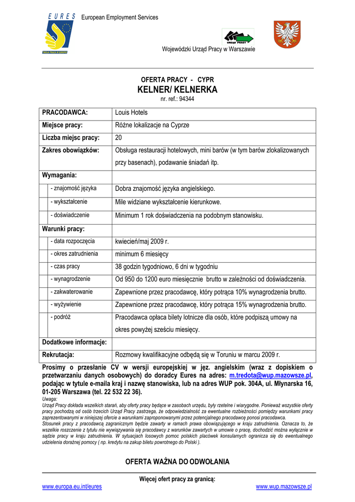 European Employment Services Wojewódzki Urząd Pracy w Warszawie OFERTA PRACY - CYPR KELNER/ KELNERKA nr. ref.: 94344 PRACODAWCA: Louis Hotels Miejsce pracy: RóŜne lokalizacje na Cyprze Liczba miejsc pracy: 20 Zakres obowiązków: Obsługa restauracji hotelowych, mini barów (w tym barów zlokalizowanych przy basenach), podawanie śniadań itp. Wymagania: - znajomość języka Dobra znajomość języka angielskiego. - wykształcenie Mile widziane wykształcenie kierunkowe. - doświadczenie Minimum 1 rok doświadczenia na podobnym stanowisku. Warunki pracy: - data rozpoczęcia kwiecień/maj 2009 r. - okres zatrudnienia minimum 6 miesięcy - czas pracy 38 godzin tygodniowo, 6 dni w tygodniu - wynagrodzenie Od 950 do 1200 euro miesięcznie brutto w zaleŜności od doświadczenia. - zakwaterowanie Zapewnione przez pracodawcę, który potrąca 10% wynagrodzenia brutto. - wyŜywienie Zapewnione przez pracodawcę, który potrąca 15% wynagrodzenia brutto. - podróŜ Pracodawca opłaca bilety lotnicze dla osób, które podpiszą umowy na okres powyŜej sześciu miesięcy. Dodatkowe informacje: Rekrutacja: Rozmowy kwalifikacyjne odbędą się w Toruniu w marcu 2009 r. Prosimy o przesłanie CV w wersji europejskiej w jęz. angielskim (wraz z dopiskiem o przetwarzaniu danych osobowych) do doradcy Eures na adres: [email protected], podając w tytule e-maila kraj i nazwę stanowiska, lub na adres WUP pok. 304A, ul. Młynarska 16, 01-205 Warszawa (tel. 22 532 22 36). Uwaga: Urząd Pracy dokłada wszelkich starań, aby oferty pracy będące w zasobach urzędu, były rzetelne i wiarygodne. PoniewaŜ wszystkie oferty pracy pochodzą od osób trzecich Urząd Pracy zastrzega, Ŝe odpowiedzialność za ewentualne rozbieŜności pomiędzy warunkami pracy zaprezentowanymi w niniejszej ofercie a warunkami zaproponowanymi przez potencjalnego pracodawcę ponosi pracodawca. Stosunek pracy z pracodawcą zagranicznym będzie zawarty w ramach prawa obowiązującego w kraju zatrudnienia. Oznacza to, Ŝe wszelkie roszczenie z tytułu nie wywiązywania się pracodawcy z warunków zawartych w umowie o pracę, dochodzić moŜna wyłącznie w sądzie pracy w kraju zatrudnienia. W sytuacjach losowych pomoc polskich placówek konsularnych ogranicza się do ewentualnego udzielenia doraźnej pomocy ( np. kredytu na zakup biletu powrotnego do Polski ). OFERTA WAśNA DO ODWOŁANIA Więcej ofert pracy za granicą: www.europa.eu.int/eures www.wup.mazowsze.pl