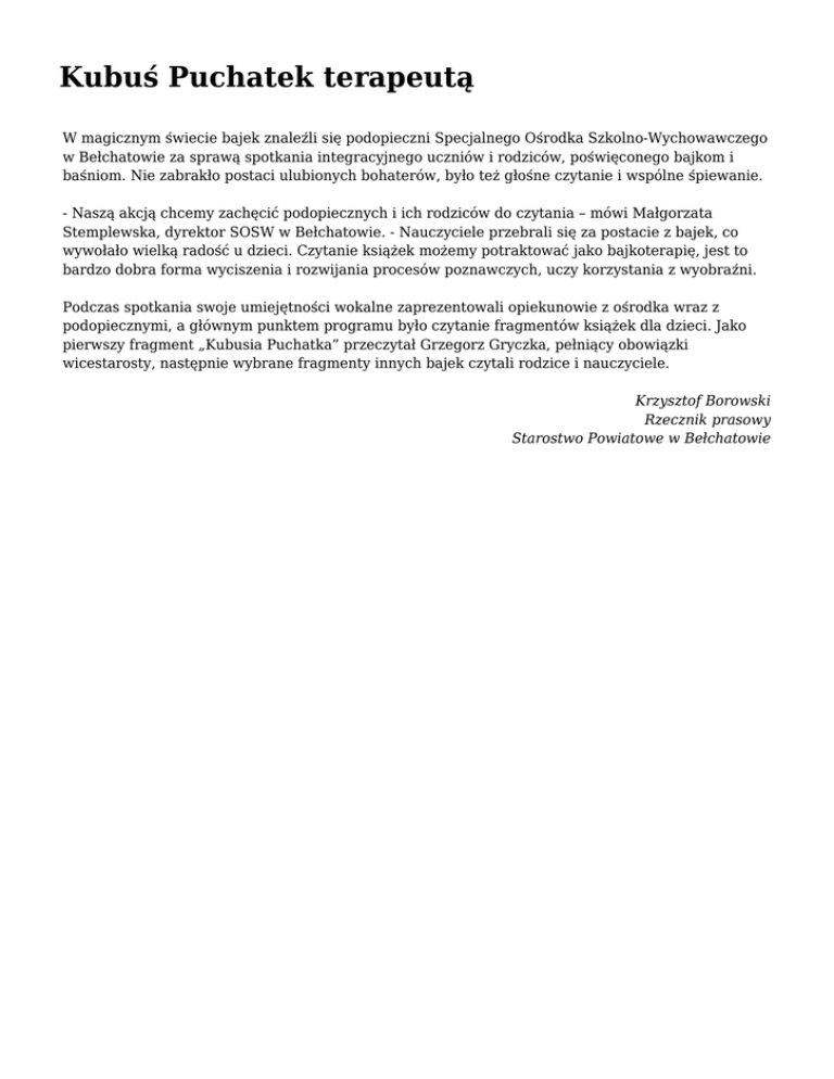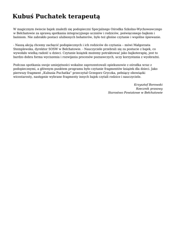 Kubuś Puchatek terapeutą W magicznym świecie bajek znaleźli się podopieczni Specjalnego Ośrodka Szkolno-Wychowawczego w Bełchatowie za sprawą spotkania integracyjnego uczniów i rodziców, poświęconego bajkom i baśniom. Nie zabrakło postaci ulubionych bohaterów, było też głośne czytanie i wspólne śpiewanie. - Naszą akcją chcemy zachęcić podopiecznych i ich rodziców do czytania – mówi Małgorzata Stemplewska, dyrektor SOSW w Bełchatowie. - Nauczyciele przebrali się za postacie z bajek, co wywołało wielką radość u dzieci. Czytanie książek możemy potraktować jako bajkoterapię, jest to bardzo dobra forma wyciszenia i rozwijania procesów poznawczych, uczy korzystania z wyobraźni. Podczas spotkania swoje umiejętności wokalne zaprezentowali opiekunowie z ośrodka wraz z podopiecznymi, a głównym punktem programu było czytanie fragmentów książek dla dzieci. Jako pierwszy fragment „Kubusia Puchatka” przeczytał Grzegorz Gryczka, pełniący obowiązki wicestarosty, następnie wybrane fragmenty innych bajek czytali rodzice i nauczyciele. Krzysztof Borowski Rzecznik prasowy Starostwo Powiatowe w Bełchatowie