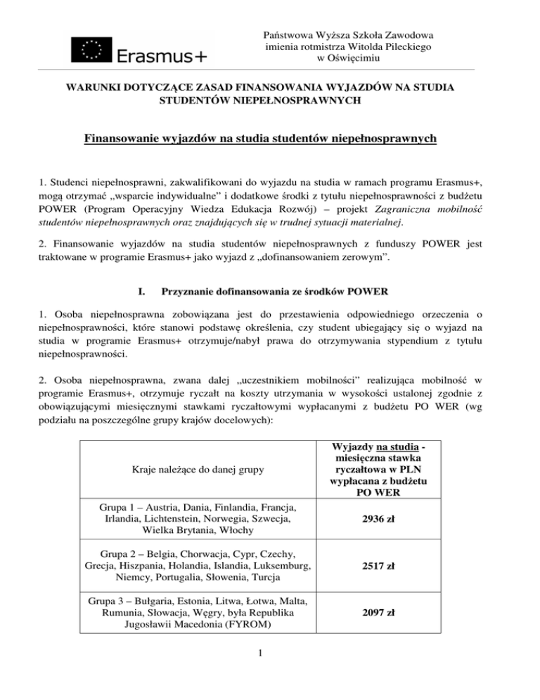 Państwowa Wyższa Szkoła Zawodowa imienia rotmistrza Witolda Pileckiego w Oświęcimiu WARUNKI DOTYCZĄCE ZASAD FINANSOWANIA WYJAZDÓW NA STUDIA STUDENTÓW NIEPEŁNOSPRAWNYCH Finansowanie wyjazdów na studia studentów niepełnosprawnych 1. Studenci niepełnosprawni, zakwalifikowani do wyjazdu na studia w ramach programu Erasmus+, mogą otrzymać „wsparcie indywidualne” i dodatkowe środki z tytułu niepełnosprawności z budżetu POWER (Program Operacyjny Wiedza Edukacja Rozwój) – projekt Zagraniczna mobilność studentów niepełnosprawnych oraz znajdujących się w trudnej sytuacji materialnej. 2. Finansowanie wyjazdów na studia studentów niepełnosprawnych z funduszy POWER jest traktowane w programie Erasmus+ jako wyjazd z „dofinansowaniem zerowym”. I. Przyznanie dofinansowania ze środków POWER 1. Osoba niepełnosprawna zobowiązana jest do przestawienia odpowiedniego orzeczenia o niepełnosprawności, które stanowi podstawę określenia, czy student ubiegający się o wyjazd na studia w programie Erasmus+ otrzymuje/nabył prawa do otrzymywania stypendium z tytułu niepełnosprawności. 2. Osoba niepełnosprawna, zwana dalej „uczestnikiem mobilności” realizująca mobilność w programie Erasmus+, otrzymuje ryczałt na koszty utrzymania w wysokości ustalonej zgodnie z obowiązującymi miesięcznymi stawkami ryczałtowymi wypłacanymi z budżetu PO WER (wg podziału na poszczególne grupy krajów docelowych): Kraje należące do danej grupy Wyjazdy na studia miesięczna stawka ryczałtowa w PLN wypłacana z budżetu PO WER Grupa 1 – Austria, Dania, Finlandia, Francja, Irlandia, Lichtenstein, Norwegia, Szwecja, Wielka Brytania, Włochy 2936 zł Grupa 2 – Belgia, Chorwacja, Cypr, Czechy, Grecja, Hiszpania, Holandia, Islandia, Luksemburg, Niemcy, Portugalia, Słowenia, Turcja 2517 zł Grupa 3 – Bułgaria, Estonia, Litwa, Łotwa, Malta, Rumunia, Słowacja, Węgry, była Republika Jugosławii Macedonia (FYROM) 2097 zł 1 Państwowa Wyższa Szkoła Zawodowa imienia rotmistrza Witolda Pileckiego w Oświęcimiu II. Przyznanie dodatkowego dofinansowania z tytułu niepełnosprawności 1. Osoba niepełnosprawna poza otrzymaniem ryczałtu na koszty utrzymania w wysokości wskazanej w powyższej tabelce ma prawo otrzymać w ramach kategorii „Wsparcie uczestników ze specjalnymi potrzebami” dodatkową kwotę. 2. Wysokość dodatkowej kwoty będzie określana na podstawie specjalnego wniosku złożonego przez osobę niepełnosprawną – uczestnika mobilności – (do Działu Nauczania lub Koordynatora programu Erasmus+), po zakończeniu procesu rekrutacji w uczelni. 3. Wniosek powinien zostać złożony bezzwłocznie po zakwalifikowaniu studenta na wyjazd. 4. W w/w wniosku o dofinansowanie dodatkowych kosztów bezpośrednio związanych z niepełnosprawnością, uczestnik mobilności musi w szczegółowy sposób określić potrzeby wynikające z niepełnosprawności (inne niż standardowe koszty związane z podróżą i utrzymaniem podczas pobytu za granicą). Każdy dodatkowy koszt będzie wymagał szczegółowego uzasadnienia, określenia wysokości przewidywanych wydatków i podania źródła, na podstawie którego przewidywana kwota wydatków została skalkulowana. Dla przeliczenia kosztów zdefiniowanych w euro należy stosować przelicznik 4,1942 PLN. 5. Przyznanie dodatkowych środków na pokrycie kosztów bezpośrednio związanych z niepełnosprawnością, bez których realizacja wyjazdu nie byłaby możliwa oraz które nie są zapewnione przez uczelnię/instytucję przyjmującą lub nie są finansowane z innych źródeł, może nastąpić w następujących sytuacjach: a) niepełnosprawność wymaga specjalnego transportu uczestnika mobilności do miejsca docelowego (koszty specjalnego transportu); b) niepełnosprawność wymaga wsparcia uczestnika mobilności przez osobę towarzyszącą przez część lub cały okres pobytu za granicą. Koszty podróży osoby towarzyszącej oraz koszty związane z pobytem osoby towarzyszącej (zakwaterowanie, wyżywienie, transport lokalny, itp.) będą rozliczane jako koszty rzeczywiste (czyli na podstawie dowodów finansowych); (pobyt osoby towarzyszącej wyklucza możliwość kosztów pracy opiekuna miejscowego); c) niepełnosprawność wymaga wsparcia uczestnika mobilności przez profesjonalnego opiekuna miejscowego (koszty wynagrodzenia); (praca profesjonalnego opiekuna miejscowego wyklucza możliwość pokrycia kosztów osoby towarzyszącej); 2 Państwowa Wyższa Szkoła Zawodowa imienia rotmistrza Witolda Pileckiego w Oświęcimiu d) niepełnosprawność wymaga korzystania ze specjalnych materiałów dydaktycznych przez studenta w kształceniu/ podczas pracy w instytucji przyjmującej (koszty specjalnych materiałów dydaktycznych); e) niepełnosprawność wymaga specjalnej opieki medycznej dla studenta na miejscu (koszty opieki lekarskiej, rehabilitacji, leków, bez których pobyt za granicą nie byłby możliwy); przyznanie dofinansowania w tej kategorii wymaga przedłożenia zaświadczenia lekarskiego, z którego będzie wynikał konieczny zakres specjalnej opieki medycznej; f) niepełnosprawność wymaga specjalnego ubezpieczenia dla studenta (koszty specjalnego ubezpieczenia); g) niepełnosprawność wymaga poniesienia innych kosztów przez studenta, bez których wyjazd stypendialny nie mógłby się odbyć (ta kategoria wymaga udokumentowania w postaci zalecenia organu orzekającego o niepełnosprawności lub lekarza). 6. Każdy wniosek będzie rozpatrywany indywidualnie przez Uczelnianą Komisję działająca w ramach programu Erasmus+. Wniosek musi być zaopiniowany przez pełnomocnika ds. osób niepełnosprawnych oraz Koordynatora programu Erasmus+. 7. Jeżeli przy ocenie złożonego wniosku Komisja będzie miała wątpliwości co do zasadności danego wydatku, może zażądać od uczestnika mobilności ubiegającego się o dofinansowanie dostarczenia dodatkowego uzasadnienia, np. odpowiedniego zaświadczenia