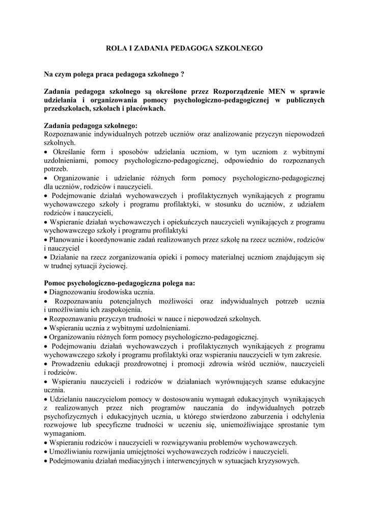 ROLA I ZADANIA PEDAGOGA SZKOLNEGO Na czym polega praca pedagoga szkolnego ? Zadania pedagoga szkolnego są określone przez Rozporządzenie MEN w sprawie udzielania i organizowania pomocy psychologiczno-pedagogicznej w publicznych przedszkolach, szkołach i placówkach. Zadania pedagoga szkolnego: Rozpoznawanie indywidualnych potrzeb uczniów oraz analizowanie przyczyn niepowodzeń szkolnych. Określanie form i sposobów udzielania uczniom, w tym uczniom z wybitnymi uzdolnieniami, pomocy psychologiczno-pedagogicznej, odpowiednio do rozpoznanych potrzeb. Organizowanie i udzielanie różnych form pomocy psychologiczno-pedagogicznej dla uczniów, rodziców i nauczycieli. Podejmowanie działań wychowawczych i profilaktycznych wynikających z programu wychowawczego szkoły i programu profilaktyki, w stosunku do uczniów, z udziałem rodziców i nauczycieli, Wspieranie działań wychowawczych i opiekuńczych nauczycieli wynikających z programu wychowawczego szkoły i programu profilaktyki Planowanie i koordynowanie zadań realizowanych przez szkołę na rzecz uczniów, rodziców i nauczyciel Działanie na rzecz zorganizowania opieki i pomocy materialnej uczniom znajdującym się w trudnej sytuacji życiowej. Pomoc psychologiczno-pedagogiczna polega na: Diagnozowaniu środowiska ucznia. Rozpoznawaniu potencjalnych możliwości oraz indywidualnych potrzeb ucznia i umożliwianiu ich zaspokojenia. Rozpoznawaniu przyczyn trudności w nauce i niepowodzeń szkolnych. Wspieraniu ucznia z wybitnymi uzdolnieniami. Organizowaniu różnych form pomocy psychologiczno-pedagogicznej. Podejmowaniu działań wychowawczych i profilaktycznych wynikających z programu wychowawczego szkoły i programu profilaktyki oraz wspieraniu nauczycieli w tym zakresie. Prowadzeniu edukacji prozdrowotnej i promocji zdrowia wśród uczniów, nauczycieli i rodziców. Wspieraniu nauczycieli i rodziców w działaniach wyrównujących szanse edukacyjne ucznia. Udzielaniu nauczycielom pomocy w dostosowaniu wymagań edukacyjnych wynikających z realizowanych przez nich programów nauczania do indywidualnych potrzeb psychofizycznych i edukacyjnych ucznia, u którego stwierdzono zaburzenia i odchylenia rozwojowe lub specyficzne trudności w uczeniu się, uniemożliwiające sprostanie tym wymaganiom. Wspieraniu rodziców i nauczycieli w rozwiązywaniu problemów wychowawczych. Umożliwianiu rozwijania umiejętności wychowawczych rodziców i nauczycieli. Podejmowaniu działań mediacyjnych i interwencyjnych w sytuacjach kryzysowych. Zadania pedagoga są różnorodne, często trudne. Kiedy zamyka drzwi gabinetu i spotyka się z uczniami, rodzicami, nauczycielami, przejmuje na siebie część problemów, emocji. Pedagog dba o wszechstronny rozwój ucznia, organizuje i prowadzi wszelkiego rodzaju zajęcia o charakterze integracyjno-profilaktyczno-terapeutycznym. Jest koordynatorem działalności profilaktycznej na terenie szkoły oraz inicjatorem i autorem programów związanych ze sferą opiekuńczo –wychowawczą. Prowadzi konsultacje dla nauczycieli, wychowawców i rodziców, pełniąc rolę osoby wspierającej w rozwiązywaniu trudnych sytuacji wychowawczych. Częstą formą pracy jest poradnictwo. Dotyczy ono nauczycieli, dzieci i rodziców. Pedagog próbuje pomóc w konfliktach na różnych płaszczyznach. Robi wszystko co w jego mocy, ale nie jest cudotwórcą i mimo najszczerszych chęci, nie zawsze jego praca osiąga zamierzone efekty. Wpływ na to ma wiele czynników. Nie ma gotowych recept na rozwiązanie problemów. Zadaniem pedagoga jest wspierać, próbować zrozumieć, szukać przyczyn i wskazywać możliwości rozwiązań; być czułym na krzywdę i nie pozwalać na przemoc. Przy rozwiązywaniu trudności i problemów, pedagog korzysta z pomocy rodziców i innych instytucji: GOPS -u, Policji, Sądu dla Nieletnich, kuratora, Poradni Psychologiczno-Pedagogicznej, Centrum Pomocy dla Rodzin, Urzędu Gminy, Komisji Rozwiązywania Problemów Alkoholowych. Pedagog jest zawsze sojusznikiem ucznia, nawet jeżeli uczniowi wydaje się inaczej. Przewiduje pewne sytuacje i trudne decyzje jakie podejmuje, w końcowym efekcie są korzystne dla ucznia ( szczególnie w aspekcie dalszej kariery szkolnej, a nawet życiowej). Uczniowie mogą się zgłaszać do pedagoga: gdy nie radzą sobie z programem nauczania, chcą pomocy i rady z tym związanej, gdy ktoś naruszy ich prawa; gdy ktoś stosuje wobec nich przemoc; gdy potrzebują pomocy i rady; gdy chcą porozmawiać z kimś życzliwym; Rodzice uczniów mogą oczekiwać: pomocy w rozwiązaniu sytuacji problemowej, dotyczącej ich dziecka: trudności w nauce bądź niepowodzenia szkolne dziecka - możliwość rozpoznania przyczyn kłopotów w nauce, poprzez kontakt z poradnią psychologicznopedagogiczną, diagnozującą przyczyny niepowodzeń szkolnych, deficyty rozwojowe dzieci; problemy z zachowaniem dziecka (zmiany zachowania dziecka, problemy dziecka z rówieśnikami); Nauczyciele mogą oczekiwać: pomocy w zdiagnozowaniu przyczyn trudności w nauce i niepowodzeń szkolnych uczniów; analizy opinii o uczniach z poradni psychologiczno-pedagogicznej; współpracy w zakresie diagnozowania środowiska rodzinnego ucznia, rozpoznawania potencjalnych możliwości, bądź ograniczeń dziecka; wspierania w podejmowaniu działań wychowawczych i profilaktycznych wynikających z programu wychowawczego i profilaktycznego; wsparcia w rozwiązywaniu problemów wychowawczych dotyczących uczniów (np. indywidualnych rozmów z uczniami, rodzicami uczniów sprawiającymi różnego rodzaju problemy wychowawcze, rozmów z agresorami, ofiarami przemocy, uczniami wagarującymi, nieprzystosowaniem społecznym); wsparcia w podejmowaniu działań mediacyjnych i kryzysowych w szkole. Pedagog szkolny Jolanta Kulik