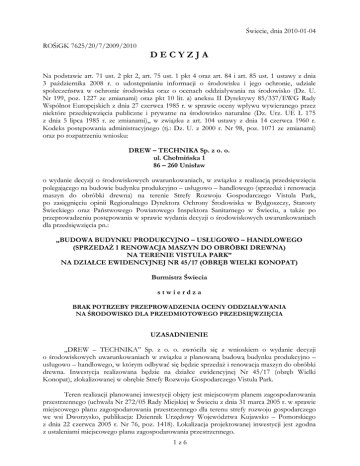 Świecie, dnia 2010-01-04 ROŚiGK 7625/20/7/2009/2010 DECYZJA Na podstawie art. 71 ust. 2 pkt 2, art. 75 ust. 1 pkt 4 oraz art. 84 i art. 85 ust. 1 ustawy z dnia 3 października 2008 r. o udostępnianiu informacji o środowisku i jego ochronie, udziale społeczeństwa w ochronie środowiska oraz o ocenach oddziaływania na środowisko (Dz. U. Nr 199, poz. 1227 ze zmianami) oraz pkt 10 lit. a) aneksu II Dyrektywy 85/337/EWG Rady Wspólnot Europejskich z dnia 27 czerwca 1985 r. w sprawie oceny wpływu wywieranego przez niektóre przedsięwzięcia publiczne i prywatne na środowisko naturalne (Dz. Urz. UE L 175 z dnia 5 lipca 1985 r. ze zmianami),, w związku z art. 104 ustawy z dnia 14 czerwca 1960 r. Kodeks postępowania administracyjnego (tj.: Dz. U. z 2000 r. Nr 98, poz. 1071 ze zmianami) oraz po rozpatrzeniu wniosku: DREW – TECHNIKA Sp. z o. o. ul. Chełmińska 1 86 – 260 Unisław o wydanie decyzji o środowiskowych uwarunkowaniach, w związku z realizacją przedsięwzięcia polegającego na budowie budynku produkcyjno – usługowo – handlowego (sprzedaż i renowacja maszyn do obróbki drewna) na terenie Strefy Rozwoju Gospodarczego Vistula Park, po zasięgnięciu opinii Regionalnego Dyrektora Ochrony Środowiska w Bydgoszczy, Starosty Świeckiego oraz Państwowego Powiatowego Inspektora Sanitarnego w Świeciu, a także po przeprowadzeniu postępowania w sprawie wydania decyzji o środowiskowych uwarunkowaniach dla przedsięwzięcia pn.: „BUDOWA BUDYNKU PRODUKCYJNO – USŁUGOWO – HANDLOWEGO (SPRZEDAŻ I RENOWACJA MASZYN DO OBRÓBKI DREWNA) NA TERENIE VISTULA PARK” NA DZIAŁCE EWIDENCYJNEJ NR 45/17 (OBRĘB WIELKI KONOPAT) Burmistrz Świecia stwierdza BRAK POTRZEBY PRZEPROWADZENIA OCENY ODDZIAŁYWANIA NA ŚRODOWISKO DLA PRZEDMIOTOWEGO PRZEDSIĘWZIĘCIA UZASADNIENIE „DREW – TECHNIKA” Sp. z o. o. zwróciła się z wnioskiem o wydanie decyzji o środowiskowych uwarunkowaniach w związku z planowaną budową budynku produkcyjno – usługowo – handlowego, w którym odbywać się będzie sprzedaż i renowacja maszyn do obróbki drewna. Inwestycja realizowana będzie na działce ewidencyjnej Nr 45/17 (obręb Wielki Konopat), zlokalizowanej w obrębie Strefy Rozwoju Gospodarczego Vistula Park. Teren realizacji planowanej inwestycji objęty jest miejscowym planem zagospodarowania przestrzennego (uchwała Nr 272/05 Rady Miejskiej w Świeciu z dnia 31 marca 2005 r. w sprawie miejscowego planu zagospodarowania przestrzennego dla terenu strefy rozwoju gospodarczego we wsi Dworzysko, publikacja: Dziennik Urzędowy Województwa Kujawsko – Pomorskiego z dnia 22 czerwca 2005 r. Nr 76, poz. 1418). Lokalizacja projektowanej inwestycji jest zgodna z ustaleniami miejscowego planu zagospodarowania przestrzennego. 1z6 Do wniosku o wydanie decyzji załączona została karta informacyjna przedsięwzięcia, a także wypis i wyrys z miejscowego planu zagospodarowania przestrzennego, wypis z rejestru gruntów oraz kopia mapy ewidencyjnej, obejmującej przewidywany teren, na którym nastąpi realizacja przedsięwzięcia wraz z terenem działek sąsiednich. Wniosek o wydanie decyzji o środowiskowych uwarunkowaniach zamieszczony został w publicznie dostępnym wykazie danych o dokumentach zawierających informację o środowisku i jego ochronie, prowadzonym na stronach internetowych Biuletynu Informacji Publicznej Urzędu Miejskiego w Świeciu www.bip.um-swiecie.pl pod Nr 2009/A/0158. Informację o wszczęciu postępowania w przedmiotowej sprawie oraz o zamieszczeniu wniosku w publicznie dostępnym wykazie podano do publicznej wiadomości dnia 2009-10-27 na stronach www.bip.um-swiecie.pl (zakładka: decyzje o środowiskowych uwarunkowaniach) oraz na tablicy ogłoszeń w Urzędzie Miejskim w Świeciu. Na podstawie pkt 10 lit. a) aneksu II Dyrektywy 85/337/EWG Rady Wspólnot Europejskich z dnia 27 czerwca 1985 r. w sprawie oceny wpływu wywieranego przez niektóre przedsięwzięcia publiczne i prywatne na środowisko naturalne (Dz. Urz. UE L 175 z dnia 5 lipca 1985 r. ze zmianami) przedmiotową inwestycję zakwalifikowano do inwestycyjnych przedsięwzięć infrastrukturalnych na obszarach przemysłowych, dla których przeprowadzenie oceny oddziaływania na środowisko może być wymagane. Zgodnie z art. 64 ust. 1 i 2 ustawy z dnia 3 października 2008 r. o udostępnianiu informacji o środowisku i jego ochronie, udziale społeczeństwa w ochronie środowiska oraz o ocenach oddziaływania na środowisko (Dz. U. Nr 199, poz. 1227 ze zmianami) w dniu 2009-10-26 Burmistrz Świecia zwrócił się do Starosty Świeckiego oraz Państwowego Powiatowego Inspektora Sanitarnego w Świeciu o wyrażenie opinii w sprawie konieczności przeprowadzenia oceny oddziaływania na środowisko oraz określenia ewentualnego zakresu raportu OOŚ dla przedmiotowego przedsięwzięcia. Oba organy opiniujące odstąpiły od konieczności przeprowadzenia oceny oddziaływania na środowisko (opinia Państwowego Powiatowego Inspektora Sanitarnego w Świeciu znak: N.NZ – 4200-120/257/09 z dnia 2009-11-17, opinia Starosty Świeckiego znak: OŚ - 7633/76/2009 z dnia 2009-11-05). Starosta Świecki w swojej opinii, przy odstąpieniu od konieczności przeprowadzenia oceny oddziaływania na środowisko wniósł warunek ograniczenia uciążliwości przedsięwzięcia do granicy działki ewidencyjnej, na której będzie ono wykonywane. Postanowienia organów opiniujących zamieszczone zostały w publicznie dostępnym wykazie danych o dokumentach zawierających informację o środowisku i jego ochronie, prowadzonym na stronach internetowych Biuletynu Informacji Publicznej Urzędu Miejskiego w Świeciu www.bip.um-swiecie.pl pod Nr 2009/I/ 0040 i 2009/I/0041. Ponadto, w toku prowadzonego postępowania Burmistrz Świecia na podstawie art. 96 ust. 3 ustawy z dnia 3 października 2008 r. o udostępnianiu informacji o środowisku i jego ochronie, udziale społeczeństwa w ochronie środowiska oraz o ocenach oddziaływania na środowisko (D