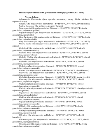 Zmiany wprowadzone na 66. posiedzeniu Komisji (7 grudnia 2011 roku) Nazwy dodane: Aglomeracja Moskiewska (jako egzonim wariantowy nazwy Wielka Moskwa dla regionu w Rosji) Kobylnik (dla miejscowości na Białorusi – 54°55′50″N, 26°41′30″E, obwód miński) Kotlina Igharghar (dla kotliny w Algierii i Tunezji) Kremuszówka (dla miejscowości na Białorusi – 53°44′37″N, 25°40′55″E, obwód grodzieński, rejon nowogródzki) Majejkowszczyzna (dla miejscowości na Białorusi – 53°55′00″N, 25°18′20″E, obwód grodzieński, rejon lidzki) Małe Żuchowicze (dla miejscowości na Białorusi – 53°23′40″N, 26°19′15″E, obwód grodzieński, rejon korelicki) Mały Trościeniec (dla części miejscowości na Białorusi – 53°50′10″N, 27°42′45″E) Marina Horka (dla miejscowości na Białorusi – 53°30′30″N, 28°09′00″E, obwód miński) Michaliszki (dla miejscowości na Białorusi – 54°48′50″N, 26°09′50″E, obwód grodzieński, rejon ostrowiecki) Michałki Małe (dla miejscowości na Białorusi – 52°56′57″N, 24°11′00″E, obwód grodzieński, rejon świsłocki) Michałki Wielkie (dla miejscowości na Białorusi – 52°57′40″N, 24°11′40″E, obwód grodzieński, rejon świsłocki) Michałów (dla miejscowości na Białorusi – 53°32′50″N, 24°08′10″E, obwód grodzieński, rejon grodzieński) Mickańce (dla miejscowości na Białorusi – 54°06′05″N, 24°48′20″E, obwód grodzieński, rejon woronowski) Miedna (dla miejscowości na Białorusi – 51°51′45″N, 23°44′40″E, obwód brzeski) Mielewicze (dla miejscowości na Białorusi – 53°17′00″N, 24°52′55″E, obwód grodzieński, rejon mostowski) Mielniki (dla miejscowości na Białorusi – 51°44′20″N, 24°07′50″E, obwód brzeski) Miesztuny (dla miejscowości na Białorusi – 53°18′30″N, 24°07′50″E, obwód grodzieński, rejon wołkowyski) Mieżańce (dla miejscowości na Białorusi – 54°02′58″N, 24°52′30″E, obwód grodzieński, rejon woronowski) Mieżniki (dla miejscowości na Białorusi – 53°44′52″N, 25°41′46″E, obwód grodzieński, rejon nowogródzki) Międzyrzecz (dla miejscowości na Białorusi – 53°04′00″N, 24°46′20″E, obwód grodzieński, rejon zelwieński) Miękisze (dla miejscowości na Białorusi – 53°48′00″N, 24°44′55″E, obwód grodzieński, rejon szczuczyński) Migdały (dla miejscowości na Białorusi – 53°56′40″N, 24°49′10″E, obwód grodzieński, rejon woronowski) Mikiańce (dla miejscowości na Białorusi – 54°03′35″N, 25°20′45″E, obwód grodzieński, rejon woronowski) Mikołajów (dla miejscowości na Białorusi – 53°50′00″N, 25°54′25″E, obwód grodzieński, rejon iwiejski) Milewicze (dla miejscowości na Białorusi – 52°27′50″N, 27°36′00″E, obwód homelski) Milkowszczyzna (dla miejscowości na Białorusi – 53°33′35″N, 24°23′25″E, obwód grodzieński, rejon grodzieński) Minontowicze (dla miejscowości na Białorusi – 53°34′00″N, 25°01′55″E, obwód grodzieński, rejon szczuczyński) Miory (dla miejscowości na Białorusi – 55°37′10″N, 27°37′30″E, obwód witebski) Misiewicze (dla miejscowości na Białorusi – 53°52′40″N, 24°53′30″E, obwód grodzieński, rejon woronowski) Miszkieniki (dla miejscowości na Białorusi – 53°30′45″N, 23°43′05″E, obwód grodzieński, rejon grodzieński) Miżewo (dla miejscowości na Białorusi – 53°20′50″N, 24°35′00″E, obwód grodzieński, rejon mostowski) Mochowicze (dla miejscowości na Białorusi – 53°49′10″N, 25°10′10″E, obwód grodzieński, rejon lidzki) Mochre (dla miejscowości na Białorusi – 51°58′30″N, 25°34′00″E, obwód brzeski) Mociowce (dla miejscowości na Białorusi – 53°40′15″N, 24°47′10″E, obwód grodzieński, rejon szczuczyński) Moczulna (dla miejscowości na Białorusi – 53°14′25″N, 24°27′50″E, obwód grodzieński, rejon wołkowyski) Mogilica (dla miejscowości na Białorusi – 52°46′40″N, 25°35′40″E, obwód brzeski) Mohylowce (dla miejscowości na Białorusi – 52°52′20″N, 24°40′30″E, obwód brzeski) Mokra Dąbrowa (dla miejscowości na Białorusi – 52°20′45″N, 26°04′00″E, obwód brzeski) Mokrany (dla miejscowości na Białorusi – 51°50′00″N, 24°15′30″E, obwód brzeski) Mołodów (dla miejscowości na Białorusi – 52°17′00″N, 25°41′20″E, obwód brzeski) Monkiewicze (dla miejscowości na Białorusi – 53°19′30″N, 24°52′20″E, obwód grodzieński, rejon mostowski) Montuny (dla miejscowości na Białorusi – 53°50′38″N, 24°51′10″E, obwód grodzieński, rejon woronowski) Mordasy (dla miejscowości na Białorusi – 53°32′00″N, 24°49′00″E, obwód grodzieński, rejon szczuczyński) Morocz (dla miejscowości na Białorusi – 52°52′50″N, 26°50′50″E, obwód miński) Mosiewicze (dla miejscowości na Białorusi – 53°44′25″N, 25°21′25″E, obwód grodzieński, rejon lidzki) Mosiewicze (dla miejscowości na Białorusi – 53°47′00″N, 25°06′40″E, obwód grodzieński, rejon lidzki) Moskale (dla miejscowości na Białorusi – 53°24′00″N, 24°57′30″E, obwód grodzieński, rejon mostowski) Mostowlany (dla miejscowości na Białorusi – 53°35′50″N, 25°10′45″E, obwód grodzieński, rejon lidzki) Mosty Lewe (dla miejscowości na Białorusi – 53°25′20″N, 24°37′50″E, obwód grodzieński, rejon mostowski) Mosty Prawe (dla miejscowości na Białorusi – 53°25′40″N, 24°37′40″E, obwód grodzieński, rejon mostowski) Mosuszyn Mały (dla miejscowości na Białorusi – 52°52′03″N, 24°23′50″E, obwód grodzieński, rejon świsłocki) Mosuszyn Wielki (dla miejscowości na Białorusi – 52°51′00″N, 24°23′05″E, obwód grodzieński, rejon świsłocki) Moszny (dla miejscowości na Białorusi 