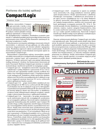 Platforma dla każdej aplikacji CompactLogix Arkadiusz Szojer R odzina sterowników CompactLogix powstała z myślą o coraz bardziej zautomatyzowanych współczesnych zakładach przemysłowych. W każdym z takich zakładów istnieją aplikacje automatyki o różnym stopniu skomplikowania i rozbudowy. Rozbudowa systemów automatyki w zakładach produkcyjnych powoduje konieczność magazynowania coraz większej liczby elementów zamiennych, by utrzymać urządzenia w ruchu. Dotychczasowe rozwiązania zakładające stosowanie różnych sterowników, w zależności od typu aplikacji, nie tylko podnoszą koszty magazynowania, ale również szkoleń i oprogramowania. Wychodząc naprzeciw takim oczekiwaniom, Rockwell Automation proponuje swoim klientom rozwiązanie oparte na sterownikach CompactLogix. Różnorodność wspomnianej rodziny sterowników umożliwia dobór sterownika do wymagań konkretnej aplikacji. Każdy sterownik z rodziny Logix jest wyposażony w szybki, dwurdzeniowy, 32-bitowy procesor Logix oraz pamięć adresowaną według zmiennych i struktur, bez konieczności stosowania adresów fizycznych. Rodzinę CompactLogix możemy ze względu na konstrukcję i możliwości podzielić na następujące grupy: l CompactLogix L2x – kompaktowe sterowniki z tej grupy mają zabudowane w jednej obudowie z procesorem 16 we i 16 wy cyfrowych oraz opcjonalnie moduł czterech szybkich liczników oraz 4 konfigurowalnych wejść i 2 konfigurowalnych wyjść analogowych. Dodatkowo dzięki możliwości dodania skanera sieci DeviceNet oraz podłączenia do 8 zdalnych wysp we/wy mogących zawierać nawet po 512 we/wy cyfrowych, zakres aplikacji jest bardzo szeroki; l CompactLogix L3x – grupa sterowników modułowych mogąca obsługiwać do 900 we/wy cyfrowych lub 450 analogowych lokalnie oraz do 32 zdalnych wysp we/wy lub napędów za pośrednictwem protokołu Ethernet/IP. Do sterownika można również dołączyć skaner sieci DeviceNet, co dodatkowo zwiększa liczbę obsługiwanych zdalnych urządzeń, umożliwiając wykorzystanie procesora w aplikacjach średnich; l CompactLogix L4x – sterowniki z tej grupy przeznaczone są do realizowania dużych lub wymagających synchronizacji serwonapędów aplikacji. Sterownik oprócz standardowej magistrali komunikacyjnej dla modułów typu Compact IO, posiada drugą szybką magistralę umożliwiającą komunikację z serwonapędami rodziny Kinetix za pośrednictwem sieci Sercos. Dzięki temu sterownik może synchronizować pracę maksymalnie 8 osi rzeczywistych, do których mogą być dołączone dwie osie pomiarowe i 12 osi wirtualnych. Może on zostać wyposażony w 30 lokalnych modułów we/wy cyfrowych lub analogowych oraz 4 moduły komunikacyjne (Ethernet/IP, Sercos, ControlNet), dzięki którym możliwa jest komunikacja z oddalonymi modułami we/wy lub napędami PowerFlex. Sterowniki z grupy L4x idealnie nadają się do aplikacji średnich, większych oraz wymagających dokładnej synchronizacji pracy napędów Serwo; l ompactLogix L4xS – urządzenia te oparte na architekC turze sterownika L4x, mogą dodatkowo sterować aplikacjami bezpieczeństwa. Dzięki sprawdzonemu z platformy GuardLogix rozwiązaniu z dodatkowym procesorem typu safety partner (znajdującym się w tej samej obudowie co główny sterownik), sprawdzającym poprawne wykonanie zadania bezpieczeństwa, możliwe jest stworzenie aplikacji spełniającej wymagania poziomu SIL 3/Cat 4. Sterownik posiada również dodatkową i wydzieloną pamięć na zmienne, wejścia, wyjścia i program bezpieczeństwa, dzięki czemu możliwości sterowania osiami i lokalnymi we/wy nie są w żaden sposób zredukowane. Sterownik CompactGuardLogix idealnie nadaje się do aplikacji z rozbudowanym i rozproszonym systemem bezpieczeństwa. Znaczne zróżnicowanie platformy CompactLogix jest jedną z jej największych zalet. Sterownik można dzięki temu dostosować do potrzeb własnej aplikacji, a zastosowanie identycznych modułów upraszcza magazynowanie. Każdy ze sterowników jest programowany za pomocą środowiska RSLogix 5000, integrującego w jednym programie funkcjonalność programowania dyskretnego, sekwencyjnego, procesowego, sterowania ruchem oraz bezpieczeństwa, co znacznie zmniejsza nakłady ponoszone na szkolenia. Dzięki sterownikom CompactLogix można w łatwy sposób sprostać wyzwaniom stojącym przed współczesnymi zakładami produkcyjnymi. n RAControls Sp. z o.o. Autoryzowany Dystrybutor Rockwell Automation reklama Nr 5 l Maj 2010 r. l 23