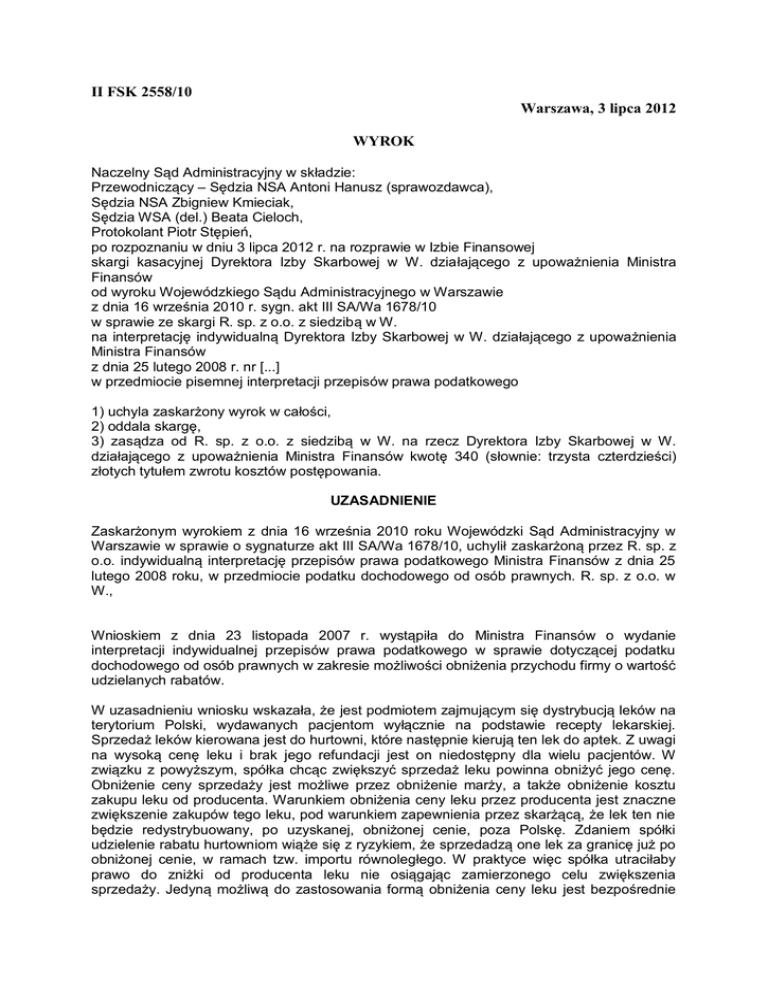 II FSK 2558/10 Warszawa, 3 lipca 2012 WYROK Naczelny Sąd Administracyjny w składzie: Przewodniczący – Sędzia NSA Antoni Hanusz (sprawozdawca), Sędzia NSA Zbigniew Kmieciak, Sędzia WSA (del.) Beata Cieloch, Protokolant Piotr Stępień, po rozpoznaniu w dniu 3 lipca 2012 r. na rozprawie w Izbie Finansowej skargi kasacyjnej Dyrektora Izby Skarbowej w W. działającego z upoważnienia Ministra Finansów od wyroku Wojewódzkiego Sądu Administracyjnego w Warszawie z dnia 16 września 2010 r. sygn. akt III SA/Wa 1678/10 w sprawie ze skargi R. sp. z o.o. z siedzibą w W. na interpretację indywidualną Dyrektora Izby Skarbowej w W. działającego z upoważnienia Ministra Finansów z dnia 25 lutego 2008 r. nr [...] w przedmiocie pisemnej interpretacji przepisów prawa podatkowego 1) uchyla zaskarżony wyrok w całości, 2) oddala skargę, 3) zasądza od R. sp. z o.o. z siedzibą w W. na rzecz Dyrektora Izby Skarbowej w W. działającego z upoważnienia Ministra Finansów kwotę 340 (słownie: trzysta czterdzieści) złotych tytułem zwrotu kosztów postępowania. UZASADNIENIE Zaskarżonym wyrokiem z dnia 16 września 2010 roku Wojewódzki Sąd Administracyjny w Warszawie w sprawie o sygnaturze akt III SA/Wa 1678/10, uchylił zaskarżoną przez R. sp. z o.o. indywidualną interpretację przepisów prawa podatkowego Ministra Finansów z dnia 25 lutego 2008 roku, w przedmiocie podatku dochodowego od osób prawnych. R. sp. z o.o. w W., Wnioskiem z dnia 23 listopada 2007 r. wystąpiła do Ministra Finansów o wydanie interpretacji indywidualnej przepisów prawa podatkowego w sprawie dotyczącej podatku dochodowego od osób prawnych w zakresie możliwości obniżenia przychodu firmy o wartość udzielanych rabatów. W uzasadnieniu wniosku wskazała, że jest podmiotem zajmującym się dystrybucją leków na terytorium Polski, wydawanych pacjentom wyłącznie na podstawie recepty lekarskiej. Sprzedaż leków kierowana jest do hurtowni, które następnie kierują ten lek do aptek. Z uwagi na wysoką cenę leku i brak jego refundacji jest on niedostępny dla wielu pacjentów. W związku z powyższym, spółka chcąc zwiększyć sprzedaż leku powinna obniżyć jego cenę. Obniżenie ceny sprzedaży jest możliwe przez obniżenie marży, a także obniżenie kosztu zakupu leku od producenta. Warunkiem obniżenia ceny leku przez producenta jest znaczne zwiększenie zakupów tego leku, pod warunkiem zapewnienia przez skarżącą, że lek ten nie będzie redystrybuowany, po uzyskanej, obniżonej cenie, poza Polskę. Zdaniem spółki udzielenie rabatu hurtowniom wiąże się z ryzykiem, że sprzedadzą one lek za granicę już po obniżonej cenie, w ramach tzw. importu równoległego. W praktyce więc spółka utraciłaby prawo do zniżki od producenta leku nie osiągając zamierzonego celu zwiększenia sprzedaży. Jedyną możliwą do zastosowania formą obniżenia ceny leku jest bezpośrednie przekazanie rabatu aptece dokonującej sprzedaży. Spółka stworzyła program rabatowy polegający na udzieleniu aptece rabatu kwotowego, dotyczącego każdej, nabytej przez aptekę jednostki leku w danym okresie (miesiącu). Spółka dokonywała wypłat na podstawie not rabatowych, tj. dokumentów sporządzonych na podstawie wykazów ilości zakupionych przez aptekę leków w danym okresie. Spółka zapytała czy wartość netto wystawionych not rabatowych, potwierdzających wartość kwot przekazanych dystrybutorom (aptekom) stanowi koszt uzyskania przychodów, czy też wartość korygującą przychody ze sprzedaży? Jej zdaniem wartość netto wystawionych not rabatowych, dokumentujących kwoty przekazane aptekom, powinna obniżać przychody spółki stanowiące element kalkulacyjny podstawy opodatkowania podatkiem dochodowym od osób prawnych. Minister Finansów w interpretacji z dnia 25 lutego 2008 r. uznał stanowisko spółki za nieprawidłowe. Minister wskazał, że pojęcia "bonifikaty" i "skonta" nie zostały zdefiniowane na potrzeby ustawy z dnia 15 lutego 1992 r. o podatku dochodowym od osób prawnych (tj. Dz. U. z 2000r. Nr 54, poz. 654 ze zm.) zwanej dalej u.p.d.o.p. Przyjmując za "Uniwersalnym słownikiem języka polskiego" pod redakcją prof. Stanisława Dubisza (Wyd. Naukowe PWN, Warszawa 2003, tom 1 str.303) "bonifikata" - to "zniżka, odstępstwo od ustalonej ceny towaru, zwłaszcza jako forma odszkodowania za poniesioną stratę albo w celach reklamowych: opust, rabat". Bonifikata jest udzielana wówczas, gdy wystąpią okoliczności uzasadniające obniżenie ustalonej wcześniej ceny, których nie można było przewidzieć w momencie zawierania umowy sprzedaży. Minister argumentował, że w przypadku, jeżeli okoliczności wpływające na zmniejszenie ceny są znane stronom przed zawarciem umowy sprzedaży, to powinny znaleźć odzwierciedlenie w cenie określonej w tej umowie. Natomiast "rabat" to "obniżenie ceny jakiegoś towaru o pewną kwotę. Minister uznał również, że spółka prowadzi sprzedaż leku jedynie w relacji z placówkami lecznictwa zamkniętego lub hurtowniami. Dokonując sprzedaży leku żąda ona od tych podmiotów określonej kwoty do zapłaty, co oznacza że w momencie zawierania umowy sprzedaży, cena sprzedaży danego leku jest stronom znana. Cena ta znajduje odzwierciedlenie w dokumencie potwierdzającym dokonanie transakcji sprzedaży. W interpretacji podniesiono, że z opisu stanu faktycznego nie wynika, że spółka kiedykolwiek koryguje tę cenę w odniesieniu do nabywców leków. Brak jest zatem podstaw do uznania, że w opisanym przypadku moa jest o pomniejszeniu czy odstąpieniu od ustalonej uprzednio przez sprzedającego ceny leków. Zdaniem organu, aby mówić o rabacie w rozumieniu art. 12 ust. 3 u.p.d.o.p, powinien on dotyczyć przychodów należnych, uzyskanych z tytułu sprzedaży leku do placówek lecznictwa zamkniętego lub hurtowni. Udzielenie bonifikat lub rabatów musi mieć związek z konkretną sprzedażą lub konkretnym kontrahentem. Sporz