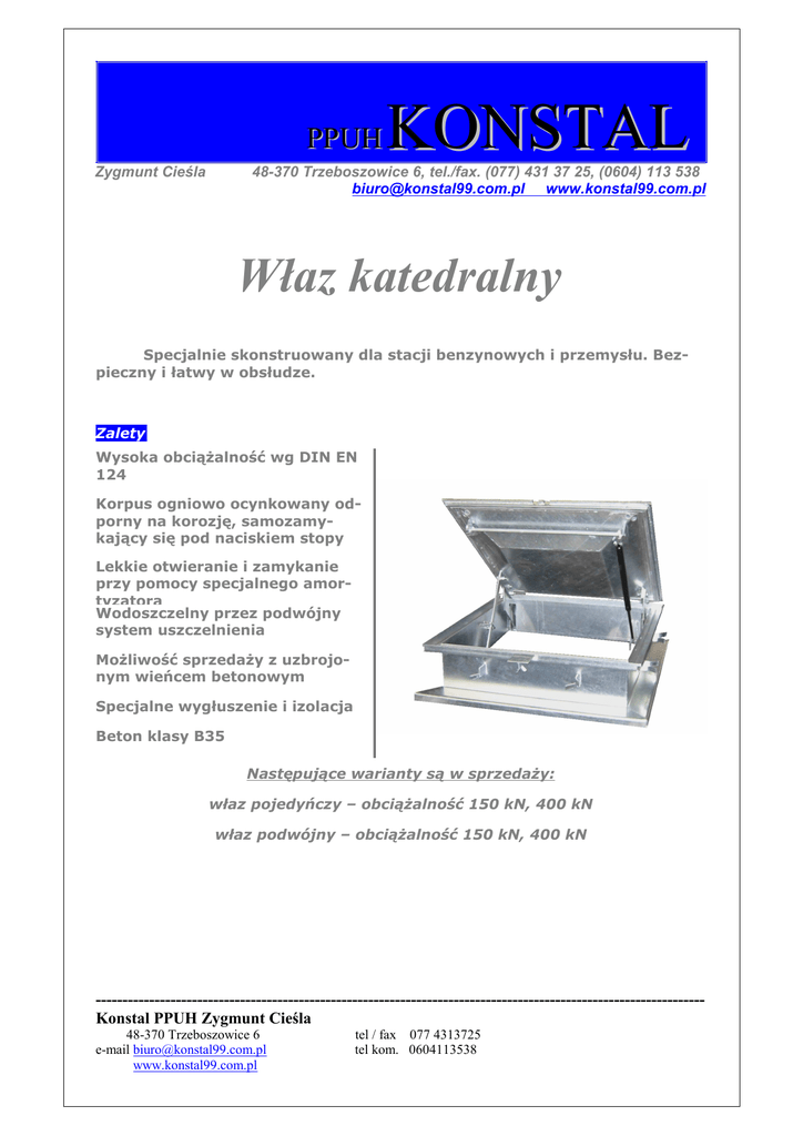 PPUH Zygmunt Cieśla KONSTAL 48-370 Trzeboszowice 6, tel./fax. (077) 431 37 25, (0604) 113 538 [email protected] www.konstal99.com.pl Właz katedralny Specjalnie skonstruowany dla stacji benzynowych i przemysłu. Bezpieczny i łatwy w obsłudze. Zalety Wysoka obciąŜalność wg DIN EN 124 Korpus ogniowo ocynkowany odporny na korozję, samozamykający się pod naciskiem stopy Lekkie otwieranie i zamykanie przy pomocy specjalnego amortyzatora Wodoszczelny przez podwójny system uszczelnienia MoŜliwość sprzedaŜy z uzbrojonym wieńcem betonowym Specjalne wygłuszenie i izolacja Beton klasy B35 Następujące warianty są w sprzedaŜy: właz pojedyńczy – obciąŜalność 150 kN, 400 kN właz podwójny – obciąŜalność 150 kN, 400 kN -----------------------------------------------------------------------------------------------------------------Konstal PPUH Zygmunt Cieśla 48-370 Trzeboszowice 6 e-mail [email protected] www.konstal99.com.pl tel / fax 077 4313725 tel kom. 0604113538 Zamykanie włazu Specjalna technika zamyka hermetycznie pokrywę włazu przez naciśnięcie nogą, zaś otwieranie odbywa się przy pomocy specjalnego klucza. Długotrwale szczelny Nasz podwójny system uszczelnienia składający się z uszczelki i stałego nacisku amortyzatora powoduje, Ŝe woda, śnieg, brud nie przedostają się do zbiornika. Dodatkowo opadający na zewnątrz wieniec betonowy z czterema naroŜnymi odpływamia zmniejsza moŜliwość wtargnięcia wody do zbiornika. Lekka i bezpieczna obsługa Zamontowany we włazie amortyzator gazowy ułatwia zmykanie i otwieranie pokrywy włazu. Przy napełnianiu zbiornika pokrywa moŜe swobodnie spoczywać na przewodach nie powodują ich zgniecenia. Właz swoimi wymiarami otworu 800 x 800 mm daje duŜo swobody ruchu przy pracach konserwacyjnych wewnątrz zbiornika. Izolacja termiczna Konstrukcja pokrywy zawiera zamkniętą przestrzeń, która stanowi izolację termiczną oraz zapobiega kondensacji pary wodnej. Zalety eksploatacyjne Masywna i zwarta konstukcja pozwala na bezpieczne wykonywanie manewrów hamowania i zawracania przez cięŜkie pojazdy. Maksymalne obciąŜenie pokrywy włazu w zaleŜności o wersji wynosi 150 kN lub 400 kN. Trwałość eksploatacyjna Ocynkowanie ogniowe zapewnia korpusowi włazu długą Ŝywotność. Mechanika włazu pozwala na bezproblemową wymianę pokrywy w zaleŜności od potrzeb. -----------------------------------------------------------------------------------------------------------------Konstal PPUH Zygmunt Cieśla 48-370 Trzeboszowice 6 e-mail [email protected] www.konstal99.com.pl tel / fax 077 4313725 tel kom. 0604113538
