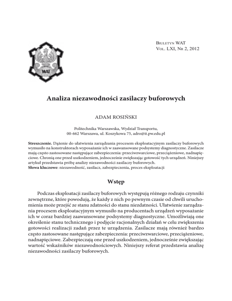 Biuletyn WAT Vol. LXI, Nr 2, 2012 Analiza niezawodności zasilaczy buforowych Adam Rosiński Politechnika Warszawska, Wydział Transportu, 00-662 Warszawa, ul. Koszykowa 75, [email protected] Streszczenie. Dążenie do ułatwienia zarządzania procesem eksploatacyjnym zasilaczy buforowych wymusiło na konstruktorach wyposażanie ich w zaawansowane podsystemy diagnostyczne. Zasilacze mają często zastosowane następujące zabezpieczenia: przeciwzwarciowe, przeciążeniowe, nadnapięciowe. Chronią one przed uszkodzeniem, jednocześnie zwiększając gotowość tych urządzeń. Niniejszy artykuł przedstawia próbę analizy niezawodności zasilaczy buforowych. Słowa kluczowe: niezawodność, zasilacz, zabezpieczenia, proces eksploatacji Wstęp Podczas eksploatacji zasilaczy buforowych występują różnego rodzaju czynniki zewnętrzne, które powodują, że każdy z nich po pewnym czasie od chwili uruchomienia może przejść ze stanu zdatności do stanu niezdatności. Ułatwienie zarządzania procesem eksploatacyjnym wymusiło na producentach urządzeń wyposażanie ich w coraz bardziej zaawansowane podsystemy diagnostyczne. Umożliwiają one określenie stanu technicznego i podjęcie racjonalnych działań w celu zwiększenia gotowości realizacji zadań przez te urządzenia. Zasilacze mają również bardzo często zastosowane następujące zabezpieczenia: przeciwzwarciowe, przeciążeniowe, nadnapięciowe. Zabezpieczają one przed uszkodzeniem, jednocześnie zwiększając wartość wskaźników niezawodnościowych. Niniejszy referat przedstawia analizę niezawodności zasilaczy buforowych. 166 A. Rosiński 1. Układy zasilania Zasilacze prądu stałego i prądu przemiennego znajdują zastosowanie niemal we wszystkich układach; w tym także jako zasilanie urządzeń komputerowych. Najdogodniejsze jest zasilanie wprost z sieci elektroenergetycznej, bezpośrednio lub za pośrednictwem transformatora. Znaczna część urządzeń wymaga zasilania napięciem stałym, dlatego też stosuje się zasilacze napięcia (prądu) stałego. Zasilacz taki przetwarza napięcie przemienne sieci zasilającej na napięcie stałe o ustabilizowanej wartości. Na rysunku 1 przedstawiono podstawowe układy zasilaczy napięcia stałego. Są one na ogół wyposażone w filtr F1 wraz z obciążeniem RO (rys. 1a) lub nieco bardziej rozbudowane, gdy do punktów (1, 2) jest dołączony stabilizator napięcia (rys. 1b), na wyjściu którego (3, 4) występuje napięcie UO’. Obciążenie symbolizowane na rysunku jako R0 może mieć zmienną wartość. Rys. 1. Schematy funkcjonalne zasilaczy napięcia stałego Układ składa się z: transformatora sieciowego, prostownika i filtru. Transformator sieciowy obniża lub podwyższa napięcie zmienne podawane na prostownik. Prostownik zmienia prąd zmienny na prąd jednokierunkowy. W prostowniku wykorzystuje się elementy charakteryzujące się jednokierunkowym przewodzeniem prądu. Są to najczęściej diody lub tyrystory. Dzięki temu napięcie przemienne jest przetwarzane na napięcie tętniące o składowej stałej różnej od zera. Po odfiltrowaniu tętnień przez filtr F1 uzyskuje się w odbiorniku żądaną wartość napięcia i prądu stałego. Często stosuje się również układy zabezpieczające elementy prostownicze przed przeciążeniami i przepięciami [1, 2, 3, 4]. W zasilaczach stabilizowanych pomiędzy filtrem a odbiornikiem znajduje się stabilizator napięcia (lub prądu) stałego. Zakres mocy zasilaczy napięcia stałego jest bardzo szeroki — od kilku watów do kilkuset kilowatów (specjalne przeznaczenia). Filtr przepuszcza na wyjście składową stałą pulsującego prądu jednokierunkowego i tłumi składową zmienną. Najczęściej jest to filtr RC (lub RLC). Stabilizator napięcia lub prądu stałego jest układem, którego zadaniem jest utrzymywanie stałej wartości napięcia lub prądu wyjściowego, przy określonych Analiza niezawodności zasilaczy buforowych 167 granicach zmian napięcia zasilającego, zmian obciążenia oraz zmian czynników zewnętrznych, np. temperatury, ciśnienia, wilgotności, czasu, itd. Stabilizatory obecnie należą do najbardziej rozpowszechnionych układów elektronicznych i stanowią często integralne fragmenty bardziej rozbudowanych układów. W celu zabezpieczenia zasilacza przed uszkodzeniem stosuje się następujące rodzaje automatycznych zabezpieczeń [5]: — przeciwzwarciowe (SCP — ang. Short Circuit Protection), — przeciążeniowe (OLP — ang. Over Load Protection), — nadnapięciowe (OVP — ang. Over Voltage Protection). Zabezpieczenie przeciwzwarciowe i przeciążeniowe chroni wyjście lub wyjścia zasilacza przed skutkami zwarcia po stronie dołączonego obciążenia. Zabezpieczenie nadnapięciowe chroni inne urządzenia zasilane przez zasilacz przed uszkodzeniem i nadmiernym napięciem w stosunku do maksymalnego napięcia wyjściowego. Jeśli wyjścia w zasilaczu są niezależne, to zwarcie, przeciążenie czy nadmierne napięcie na dowolnym z nich nie powinno zmniejszać funkcjonalności jakiegokolwiek innego. Usunięcie zwarcia, przeciążenia czy też przyczyny pojawienia się nadmiernego napięcia na wyjściu i zresetowanie zabezpieczenia (ręcznie lub automatycznie) powinno spowodować przywrócenie stanu zdatności na tym wyjściu. Zasilacze stosowane w systemach telematyki transportu zazwyczaj są przystosowane do współpracy z akumulatorem o odpowiednio dobranej charakterystyce eksploatacyjnej. Zasilacz kontroluje wówczas automatycznie proces ładowania akumulatora, a także powinien automatycznie przeprowadzać czynności obsługowe akumulatora oraz zapewniać ochronę przed nadmiernym rozładowaniem. Schematycznie przedstawiono to na rysunku 2. Zasilacze te mogą być wyposażone w funkcje optycznej i akustycznej sygnalizacji stanu pracy. Rys. 2. Schemat zasilania z zastosowaniem zasilacza buforowego Zasilacze współdziałają z wieloma innymi systemami oraz otoczeniem [6]. Na r
