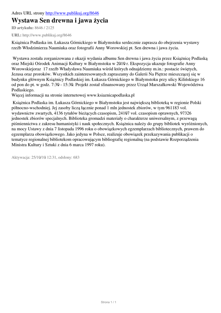 Adres URL strony http://www.publikuj.org/8646 Wystawa Sen drewna i jawa życia ID artykułu: 8646 / 2125 URL: http://www.publikuj.org/8646 Książnica Podlaska im. Łukasza Górnickiego w Białymstoku serdecznie zaprasza do obejrzenia wystawy rzeźb Włodzimierza Naumiuka oraz fotografii Anny Worowskiej pt. Sen drewna i jawa życia. Wystawa została zorganizowana z okazji wydania albumu Sen drewna i jawa życia przez Książnicę Podlaską oraz Miejski Ośrodek Animacji Kultury w Białymstoku w 2010 r. Ekspozycja ukazuje fotografie Anny Worowskiejoraz 17 rzeźb Władysława Naumiuka wśród których odnajdziemy m.in.: postacie świętych, Jezusa oraz proroków. Wszystkich zainteresowanych zapraszamy do Galerii Na Piętrze mieszczącej się w budynku głównym Książnicy Podlaskiej im. Łukasza Górnickiego w Białymstoku przy ulicy Kilińskiego 16 od pon do pt. w godz. 7:30 - 15:30. Projekt został sfinansowany przez Urząd Marszałkowski Województwa Podlaskiego. Więcej informacji na stronie internetowej www.ksiaznicapodlaska.pl Książnica Podlaska im. Łukasza Górnickiego w Białymstoku jest największą biblioteką w regionie Polski północno-wschodniej. Jej zasoby liczą łącznie ponad 1 mln jednostek zbiorów, w tym 961183 vol. wydawnictw zwartych, 4136 tytułów bieżących czasopism, 24107 vol. czasopism oprawnych, 97326 jednostek zbiorów specjalnych. Biblioteka gromadzi materiały o charakterze uniwersalnym, z przewagą piśmiennictwa z zakresu humanistyki i nauk społecznych. Książnica należy do grupy bibliotek wyróżnionych, na mocy Ustawy z dnia 7 listopada 1996 roku o obowiązkowych egzemplarzach bibliotecznych, prawem do egzemplarza obowiązkowego. Jako jedyna w Polsce, realizuje obowiązek przekazywania publikacji o tematyce regionalnej bibliotekom opracowującym bibliografię regionalną (na podstawie Rozporządzenia Ministra Kultury i Sztuki z dnia 6 marca 1997 roku). Aktywacja: 25/10/10 12:31, odsłony: 683 Strona 1 / 1