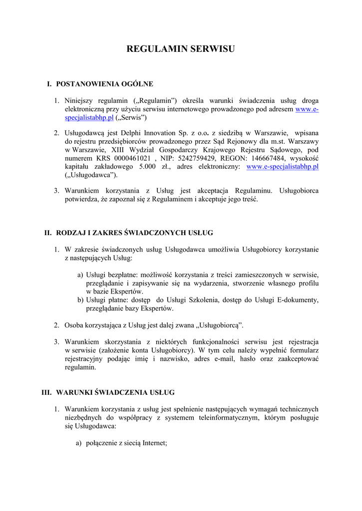 REGULAMIN SERWISU I. POSTANOWIENIA OGÓLNE 1. Niniejszy regulamin („Regulamin”) określa warunki świadczenia usług droga elektroniczną przy użyciu serwisu internetowego prowadzonego pod adresem www.especjalistabhp.pl („Serwis”) 2. Usługodawcą jest Delphi Innovation Sp. z o.o. z siedzibą w Warszawie, wpisana do rejestru przedsiębiorców prowadzonego przez Sąd Rejonowy dla m.st. Warszawy w Warszawie, XIII Wydział Gospodarczy Krajowego Rejestru Sądowego, pod numerem KRS 0000461021 , NIP: 5242759429, REGON: 146667484, wysokość kapitału zakładowego 5.000 zł., adres elektroniczny: www.e-specjalistabhp.pl („Usługodawca”). 3. Warunkiem korzystania z Usług jest akceptacja Regulaminu. Usługobiorca potwierdza, że zapoznał się z Regulaminem i akceptuje jego treść. II. RODZAJ I ZAKRES ŚWIADCZONYCH USŁUG 1. W zakresie świadczonych usług Usługodawca umożliwia Usługobiorcy korzystanie z następujących Usług: a) Usługi bezpłatne: możliwość korzystania z treści zamieszczonych w serwisie, przeglądanie i zapisywanie się na wydarzenia, stworzenie własnego profilu w bazie Ekspertów. b) Usługi płatne: dostęp do Usługi Szkolenia, dostęp do Usługi E-dokumenty, przeglądanie bazy Ekspertów. 2. Osoba korzystająca z Usług jest dalej zwana „Usługobiorcą”. 3. Warunkiem skorzystania z niektórych funkcjonalności serwisu jest rejestracja w serwisie (założenie konta Usługobiorcy). W tym celu należy wypełnić formularz rejestracyjny podając imię i nazwisko, adres e-mail, hasło oraz zaakceptować regulamin. III. WARUNKI ŚWIADCZENIA USŁUG 1. Warunkiem korzystania z usług jest spełnienie następujących wymagań technicznych niezbędnych do współpracy z systemem teleinformatycznym, którym posługuje się Usługodawca: a) połączenie z siecią Internet; b) poprawnie skonfigurowana przeglądarka internetowa Windows Internet Explorer w wersji >= 9.0, Mozilla Firefox w wersji >= 23, Opera w wersji >= 12.0, Chrome w wersji >= 28.0, która akceptuje pliki typu cookie. Pliki typu cookie to informacje zapisywane przez Serwis na komputerze Usługobiorcy, które Serwis może odczytywać przy każdorazowym połączeniu z tego komputera; c) serwis jest optymalizowany do rozdzielczości ekranu 1024x768 pikseli, palecie 16,7 mln kolorów oraz widoku 100%. Przy innych ustawieniach korzystanie z serwisu będzie możliwe, ale może się to wiązać z pogorszeniem estetyki i funkcjonalności serwisu; d) korzystanie z serwisu wymaga cyklicznej zmiany hasła co 30 dni. Hasło powinno się składać z co najmniej 8 znaków, zwiera c małe i wielkie litery oraz cyfry lub znaki specjalne. 2. Usługodawca nie ponosi odpowiedzialności za szkody wynikające z niedostosowania się do wskazanych wymogów technicznych. 3. Prawa własności intelektualnej do materiałów zawartych w Serwisie przysługują Usługodawcy lub podmiotom współpracującym z Usługodawcą, o ile nie zawierają odmiennej informacji. Jakiekolwiek kopiowanie, drukowanie, a także publiczne odtwarzanie udostępnianych treści jest zakazane, o ile nie wynika to z odrębnych umów lub bezwzględnie obowiązujących przepisów prawa. 4. Zakazane jest dostarczanie przez Usługobiorcę treści o charakterze bezprawnym, w szczególności niedopuszczalne jest umieszczanie w Serwisie treści naruszających dobra osobiste, powszechnie uznanych za obraźliwe, a także materiałów naruszających prawa własności intelektualnej. 5. W przypadku niedozwolonego korzystania z usług, tj. niezgodnie z Regulaminem lub obowiązującymi przepisami prawa, Usługodawca będzie miał prawo do przetwarzania danych osobowych Usługobiorcy w zakresie niezbędnym do ustalenia jego odpowiedzialności. Usługodawca może przekazywać dane Usługobiorcy uprawnionym organom na potrzeby prowadzonych przez nie postępowań. 6. Zamieszczenie przez Usługobiorcę jakichkolwiek materiałów lub informacji na stronach Serwisu jest równoznaczne z ich publicznym udostępnieniem. 7. Usługobiorca ponosi wyłączną odpowiedzialność za treść podanych przez siebie danych i informacji oraz zobowiązany jest pokryć ewentualne roszczenia osób trzecich w tym zakresie. 8. Usługodawca zastrzega sobie prawo do usuwania i zmian materiałów i komentarzy, w szczególności w przypadkach gdy naruszać one będą postanowienia Regulaminu lub przepisy prawa. 9. Usługodawca zastrzega sobie prawo do dokonywania na bieżąco zmian w cenach usług oraz do przeprowadzania i odwoływania wszelkiego rodzaju akcji promocyjnych. Uprawnienie, o którym mowa w poprzednim zdaniu, nie ma wpływu na zamówienia złożone przez Użytkowników przed datą wejścia w życie zmiany ceny. 10. Usługobiorca zobowiązany jest do zachowania w tajemnicy loginu i hasła do swojego konta w Serwisie. W granicach wynikających z powszechnie obowiązujących przepisów prawa odpowiedzialnym za wszelkie działania związane z posługiwaniem się loginem i hasłem do danego konta w Serwisie jest Usługobiorca, przy czym hasło stanowi informację poufną do wyłącznej wiadomości Usługobiorcy. 11. Usługobiorca będący konsumentem w rozumieniu przepisów kodeksu cywilnego wyraża zgodę na rozpoczęcie świadczenia Usług przed upływem dziesięcioterminowego terminu od zawarcia umowy, zatem nie przysługuje mu prawo odstąpienia od umowy na podstawie art. 10 ustawy o ochronie niektórych praw konsumentów oraz o odpowiedzialności za szkodę wyrządzoną przez produkt niebezpieczny. 12. Mając na uwadze bezpieczeństwo danych przetwarzanych w ramach serwisu, po 20 minutach bezczynności Użytkownika następuje automatyczne wylogowanie z systemu. Wprowadzone dane i informacje zostają zapisane w bazie danych pod warunkiem ich wcześniejszego zatwierdzenia przez Użytkownika. IV. USŁUGI A. Dostęp do bazy Ekspertów BHP. Każdy zarejestrowany Usługobiorca może w granicach określonych postanowieniami Regulaminu zapoznać się z bazą ekspertów zamieszczoną w