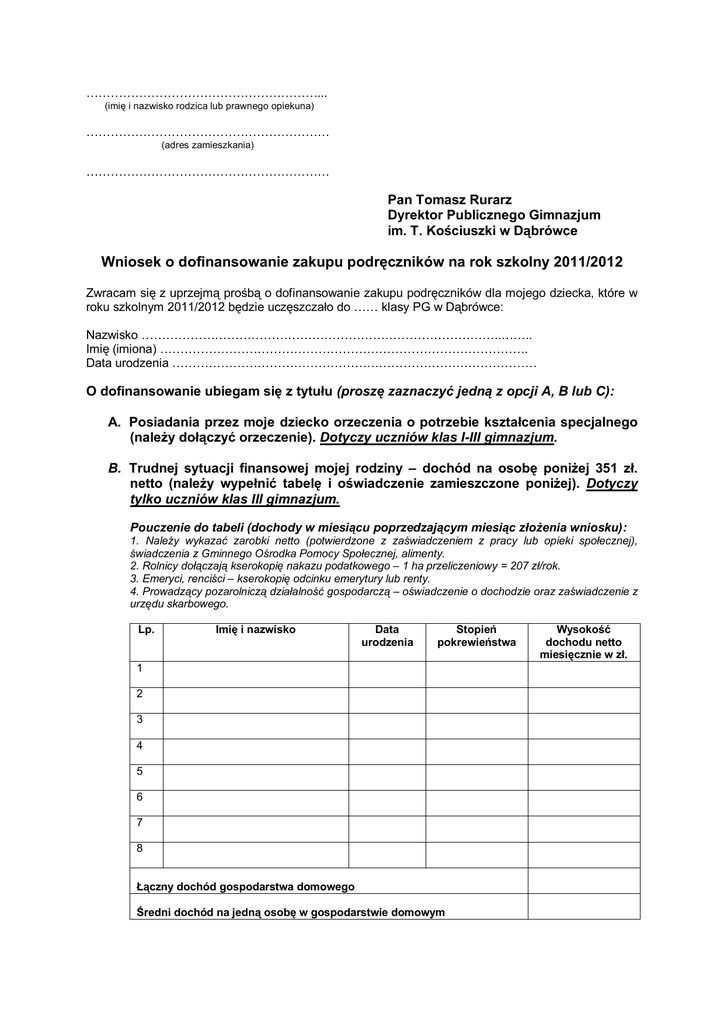 …………………………………………………... (imię i nazwisko rodzica lub prawnego opiekuna) …………………………………………………… (adres zamieszkania) …………………………………………………… Pan Tomasz Rurarz Dyrektor Publicznego Gimnazjum im. T. Kościuszki w Dąbrówce Wniosek o dofinansowanie zakupu podręczników na rok szkolny 2011/2012 Zwracam się z uprzejmą prośbą o dofinansowanie zakupu podręczników dla mojego dziecka, które w roku szkolnym 2011/2012 będzie uczęszczało do …… klasy PG w Dąbrówce: Nazwisko ……………………………………………………………………………..…….. Imię (imiona) ………………………………………………………………………………. Data urodzenia ……………………………………………………………………………… O dofinansowanie ubiegam się z tytułu (proszę zaznaczyć jedną z opcji A, B lub C): A. Posiadania przez moje dziecko orzeczenia o potrzebie kształcenia specjalnego (należy dołączyć orzeczenie). Dotyczy uczniów klas I-III gimnazjum. B. Trudnej sytuacji finansowej mojej rodziny – dochód na osobę poniżej 351 zł. netto (należy wypełnić tabelę i oświadczenie zamieszczone poniżej). Dotyczy tylko uczniów klas III gimnazjum. Pouczenie do tabeli (dochody w miesiącu poprzedzającym miesiąc złożenia wniosku): 1. Należy wykazać zarobki netto (potwierdzone z zaświadczeniem z pracy lub opieki społecznej), świadczenia z Gminnego Ośrodka Pomocy Społecznej, alimenty. 2. Rolnicy dołączają kserokopię nakazu podatkowego – 1 ha przeliczeniowy = 207 zł/rok. 3. Emeryci, renciści – kserokopię odcinku emerytury lub renty. 4. Prowadzący pozarolniczą działalność gospodarczą – oświadczenie o dochodzie oraz zaświadczenie z urzędu skarbowego. Lp. Imię i nazwisko Data urodzenia Stopień pokrewieństwa 1 2 3 4 5 6 7 8 Łączny dochód gospodarstwa domowego Średni dochód na jedną osobę w gospodarstwie domowym Wysokość dochodu netto miesięcznie w zł. Oświadczam, że nie mam żadnych innych dochodów poza wymienionymi powyżej i że dochód na jednego członka rodziny w moim gospodarstwie domowym uzyskanym w miesiącu poprzedzającym złożenie wniosku wynosi ……………zł (słownie ……………………....……………....), a w skład gospodarstwa wchodzi …… osób w tym …… dzieci. C. Trudnej sytuacji mojej rodziny spowodowanej m. in. (proszę zaznaczyć te, które dotyczą): Dotyczy tylko uczniów klas III gimnazjum. – ubóstwem (dochód na osobę powyżej 351 zł. netto), - sieroctwem, - bezdomnością, - bezrobociem, - niepełnosprawnością, - długotrwałą lub ciężką chorobą, - przemocą w rodzinie, - potrzebą ochrony macierzyństwa lub wielodzietności, - bezradnością w sprawach opiekuńczo – wychowawczych i prowadzenia gosp. dom., - trudności w integracji cudzoziemców, - trudności w przystosowaniu do życia poi zwolnieniu z zakładu karnego, - alkoholizmu lub narkomanii, - zdarzeń losowych i sytuacji kryzysowej. Pouczenie do tabeli (dochody w miesiącu poprzedzającym miesiąc złożenia wniosku): 1. Należy wykazać zarobki netto (potwierdzone z zaświadczeniem z pracy lub opieki społecznej), świadczenia z Gminnego Ośrodka Pomocy Społecznej, alimenty. 2. Rolnicy dołączają kserokopię nakazu podatkowego – 1 ha przeliczeniowy = 207 zł/rok. 3. Emeryci, renciści – kserokopię odcinku emerytury lub renty. 4. Prowadzący pozarolniczą działalność gospodarczą – oświadczenie o dochodzie oraz zaświadczenie z urzędu skarbowego. Lp. Imię i nazwisko Data urodzenia Stopień pokrewieństwa Wysokość dochodu netto miesięcznie w zł. 1 2 3 4 5 6 7 8 Łączny dochód gospodarstwa domowego Średni dochód na jedną osobę w gospodarstwie domowym Szczegółowe uzasadnienie: ………………………………………………………………………………………………… ………………………………………………………………………………………………… ………………………………………………………………………………………………… ………………………………………………………………………………………………… ………………………………………………………………………………………………… Pod rygorem odpowiedzialności karnej (Art. 233. § 1. Kodeksu karnego: Kto, składając zeznanie mające służyć za dowód w postępowaniu sądowym lub w innym postępowaniu prowadzonym na podstawie ustawy, zeznaje nieprawdę lub zataja prawdę podlega karze pozbawienia wolności do lat 3) potwierdzam prawdziwość powyższych danych, Wyrażam zgodę na przetwarzanie danych osobowych wyłącznie do potrzeb programu pomocy materialnej dotyczącej dofinansowania zakupu podręczników. W załączeniu (dokumenty potwierdzające dochody, trudną sytuację rodzinną, orzeczenie o potrzebie kształcenia specjalnego itp.): 1. ……………………………………………………………………………………………….. 2. ……………………………………………………………………………………………….. 3. ……………………………………………………………………………………………….. 4. ……………………………………………………………………………………………... ………………………………………… (miejscowość, data) ……………………………………... (podpis rodzica lub opiekuna) Instrukcja wypełniania wniosku o dofinansowanie zakupu podręczników O dofinansowanie zakupu podręczników na rok szkolny 2010/2011 mogą się ubiegać rodzice (prawni opiekunowie) uczniów, którzy w roku szkolnym 2010/2011 będą uczęszczali do Publicznego Gimnazjum im. Tadeusza Kościuszki 