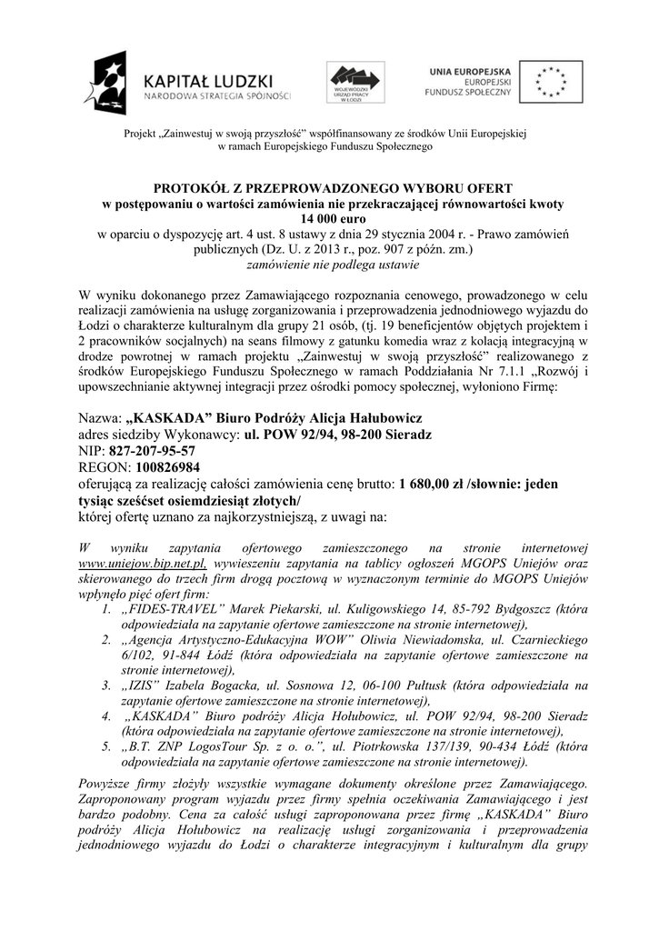 Projekt „Zainwestuj w swoją przyszłość” współfinansowany ze środków Unii Europejskiej w ramach Europejskiego Funduszu Społecznego PROTOKÓŁ Z PRZEPROWADZONEGO WYBORU OFERT w postępowaniu o wartości zamówienia nie przekraczającej równowartości kwoty 14 000 euro w oparciu o dyspozycję art. 4 ust. 8 ustawy z dnia 29 stycznia 2004 r. - Prawo zamówień publicznych (Dz. U. z 2013 r., poz. 907 z późn. zm.) zamówienie nie podlega ustawie W wyniku dokonanego przez Zamawiającego rozpoznania cenowego, prowadzonego w celu realizacji zamówienia na usługę zorganizowania i przeprowadzenia jednodniowego wyjazdu do Łodzi o charakterze kulturalnym dla grupy 21 osób, (tj. 19 beneficjentów objętych projektem i 2 pracowników socjalnych) na seans filmowy z gatunku komedia wraz z kolacją integracyjną w drodze powrotnej w ramach projektu „Zainwestuj w swoją przyszłość” realizowanego z środków Europejskiego Funduszu Społecznego w ramach Poddziałania Nr 7.1.1 „Rozwój i upowszechnianie aktywnej integracji przez ośrodki pomocy społecznej, wyłoniono Firmę: Nazwa: „KASKADA” Biuro Podróży Alicja Hałubowicz adres siedziby Wykonawcy: ul. POW 92/94, 98-200 Sieradz NIP: 827-207-95-57 REGON: 100826984 oferującą za realizację całości zamówienia cenę brutto: 1 680,00 zł /słownie: jeden tysiąc sześćset osiemdziesiąt złotych/ której ofertę uznano za najkorzystniejszą, z uwagi na: W wyniku zapytania ofertowego zamieszczonego na stronie internetowej www.uniejow.bip.net.pl, wywieszeniu zapytania na tablicy ogłoszeń MGOPS Uniejów oraz skierowanego do trzech firm drogą pocztową w wyznaczonym terminie do MGOPS Uniejów wpłynęło pięć ofert firm: 1. „FIDES-TRAVEL” Marek Piekarski, ul. Kuligowskiego 14, 85-792 Bydgoszcz (która odpowiedziała na zapytanie ofertowe zamieszczone na stronie internetowej), 2. „Agencja Artystyczno-Edukacyjna WOW” Oliwia Niewiadomska, ul. Czarnieckiego 6/102, 91-844 Łódź (która odpowiedziała na zapytanie ofertowe zamieszczone na stronie internetowej), 3. „IZIS” Izabela Bogacka, ul. Sosnowa 12, 06-100 Pułtusk (która odpowiedziała na zapytanie ofertowe zamieszczone na stronie internetowej), 4. „KASKADA” Biuro podróży Alicja Hołubowicz, ul. POW 92/94, 98-200 Sieradz (która odpowiedziała na zapytanie ofertowe zamieszczone na stronie internetowej), 5. „B.T. ZNP LogosTour Sp. z o. o.”, ul. Piotrkowska 137/139, 90-434 Łódź (która odpowiedziała na zapytanie ofertowe zamieszczone na stronie internetowej). Powyższe firmy złożyły wszystkie Zaproponowany program wyjazdu bardzo podobny. Cena za całość podróży Alicja Hołubowicz na jednodniowego wyjazdu do Łodzi wymagane dokumenty określone przez Zamawiającego. przez firmy spełnia oczekiwania Zamawiającego i jest usługi zaproponowana przez firmę „KASKADA” Biuro realizację usługi zorganizowania i przeprowadzenia o charakterze integracyjnym i kulturalnym dla grupy Projekt „Zainwestuj w swoją przyszłość” współfinansowany ze środków Unii Europejskiej w ramach Europejskiego Funduszu Społecznego 21 osób, (tj. 19 beneficjentów objętych projektem i 2 pracowników socjalnych) na seans filmowy z gatunku komedia wraz z kolacją integracyjną w drodze powrotnej jest najniższa od pozostałych firm oraz nie przewyższa środków zabezpieczonych w projekcie na ten cel. W związku z powyższym zakończono procedurę wyboru firmy na realizację usługi wyjazdu. Zaproszenie do składania ofert zostało skierowane pocztą w dniu: 24.09.2013 r. do 3 Wykonawców: Lp. 1. 2. 3. Nazwa (firma) oraz adres Wykonawcy Opal – Tour Tomasz Wawrzyńczak ul. Zgierska 17 91-446 Łódź Biuro Turystyczno-Handlowe „ALICJA” ul. Kolska Szosa 3 62-700 Turek Biuro Podróży „ORBITAL” ul. Piotrkowska 9 90-406 Łódź UWAGI Doręczone 25.09.2013 r. Doręczone 27.09.2013 r. Doręczone 30.09.2013 r. Do upływu terminu składania ofert, tj. do dnia 09.10.2013 r. do godz.: 15.00 złożono 5 ofert. Cena najniższej oferty: 1 680,00 zł Cena najwyższej oferty: 3 348,00 zł Uniejów, dnia 11.10.2013r. Z poważaniem Kierownik MGOPS /-/ Jolanta Figurska