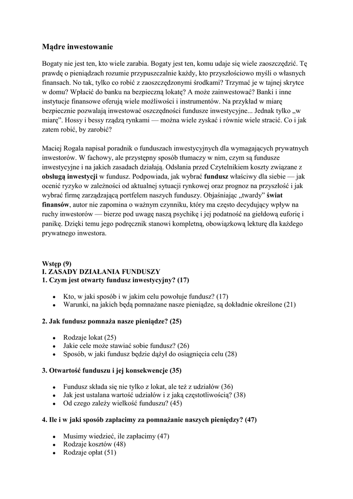 Mądre inwestowanie Bogaty nie jest ten, kto wiele zarabia. Bogaty jest ten, komu udaje się wiele zaoszczędzić. Tę prawdę o pieniądzach rozumie przypuszczalnie każdy, kto przyszłościowo myśli o własnych finansach. No tak, tylko co robić z zaoszczędzonymi środkami? Trzymać je w tajnej skrytce w domu? Wpłacić do banku na bezpieczną lokatę? A może zainwestować? Banki i inne instytucje finansowe oferują wiele możliwości i instrumentów. Na przykład w miarę bezpiecznie pozwalają inwestować oszczędności fundusze inwestycyjne... Jednak tylko „w miarę”. Hossy i bessy rządzą rynkami — można wiele zyskać i równie wiele stracić. Co i jak zatem robić, by zarobić? Maciej Rogala napisał poradnik o funduszach inwestycyjnych dla wymagających prywatnych inwestorów. W fachowy, ale przystępny sposób tłumaczy w nim, czym są fundusze inwestycyjne i na jakich zasadach działają. Odsłania przed Czytelnikiem koszty związane z obsługą inwestycji w fundusz. Podpowiada, jak wybrać fundusz właściwy dla siebie — jak ocenić ryzyko w zależności od aktualnej sytuacji rynkowej oraz prognoz na przyszłość i jak wybrać firmę zarządzającą portfelem naszych funduszy. Objaśniając „twardy” świat finansów, autor nie zapomina o ważnym czynniku, który ma często decydujący wpływ na ruchy inwestorów — bierze pod uwagę naszą psychikę i jej podatność na giełdową euforię i panikę. Dzięki temu jego podręcznik stanowi kompletną, obowiązkową lekturę dla każdego prywatnego inwestora. Wstęp (9) I. ZASADY DZIAŁANIA FUNDUSZY 1. Czym jest otwarty fundusz inwestycyjny? (17) Kto, w jaki sposób i w jakim celu powołuje fundusz? (17) Warunki, na jakich będą pomnażane nasze pieniądze, są dokładnie określone (21) 2. Jak fundusz pomnaża nasze pieniądze? (25) Rodzaje lokat (25) Jakie cele może stawiać sobie fundusz? (26) Sposób, w jaki fundusz będzie dążył do osiągnięcia celu (28) 3. Otwartość funduszu i jej konsekwencje (35) Fundusz składa się nie tylko z lokat, ale też z udziałów (36) Jak jest ustalana wartość udziałów i z jaką częstotliwością? (38) Od czego zależy wielkość funduszu? (45) 4. Ile i w jaki sposób zapłacimy za pomnażanie naszych pieniędzy? (47) Musimy wiedzieć, ile zapłacimy (47) Rodzaje kosztów (48) Rodzaje opłat (51) 5. O czym jeszcze powinniśmy wiedzieć? (59) O depozytariuszu (59) O obowiązkach informacyjnych, jakie ma wobec nas fundusz (61) O przyczynach rozwiązania funduszu i sposobie jego likwidacji (64) 6. Fundusze mogą stosować bardzo różnorodne rozwiązania (67) Typy funduszy (67) Różnorodność oferowanych nam rozwiązań (74) 7. Pamiętajmy o bezpieczeństwie, nie zapominajmy o ryzyku (79) Najważniejsze jest bezpieczeństwo (79) Podejmując ryzyko, trzeba je dobrze rozumieć (83) II. ZASADY UCZESTNICTWA 8. Gdy uczestniczymy w funduszach na warunkach standardowych (103) Wpłaty środków (104) Dodatkowe dyspozycje i umowy (113) Naszymi środkami możemy także sami zarządzać (114) Wypłata środków (121) Gdy zarobimy, część dochodu musimy oddać fiskusowi (125) 9. Gdy uczestniczymy w funduszach na warunkach specjalnych (131) Plan systematycznego oszczędzania (PSO) (131) Indywidualne konto emerytalne (IKE) (135) Indywidualne konto zabezpieczenia emerytalnego (IKZE) (138) Pracowniczy program emerytalny (PPE) (140) III. ZASADY (SZTUKA) INWESTOWANIA 10. Zacznijmy od rzeczy podstawowych (147) Nasze oczekiwania (147) Przyjaciel cierpliwych - procent składany (158) Kryteria doboru opcji inwestycyjnych (165) 11. Dobór opcji inwestycyjnych w najprostszym przypadku (175) Zasady doboru opcji inwestycyjnych w planie emerytalnym (175) Zasady doboru opcji inwestycyjnych w planie posagowym (180) 12. Dobór opcji inwestycyjnych w najtrudniejszym przypadku (185) Zasady doboru opcji inwestycyjnych w krótkoterminowym planie inwestycyjnym (187) Zasady doboru opcji inwestycyjnych w otwartym planie inwestycyjnym (201) 13. Jak wykonać plan i jak realizować strategię? (233) Zasady zarządzania w planie emerytalnym (234) Zasady zarządzania krótkoterminowym planem inwestycyjnym (242) Zasady zarządzania w otwartym planie inwestycyjnym (247) 14. Wybieramy firmę zarządzającą (263) Kryteria wyboru, które możemy pominąć (263) Na co powinniśmy zwrócić uwagę (266) Dobieramy TFI do naszego planu inwestycyjnego (278)