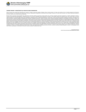 Serwis informacyjny KWP www.pomorska.policja.gov.pl ZIMOWE PORADY I PRZESTROGI DLA PIESZYCH ORAZ KIEROWCÓW Zima to trudny okres zarówno dla kierowców jak i pieszych z uwagi na zmienność pogody. Padający śnieg, marznący deszcz i do tego coraz większy mróz to niemałe wyzwanie dla kierowców. Zarówno kierowcy i ich samochody, tak również piesi muszą być odpowiednio przygotowani do poruszania się po drogach. Dotyczy to nie tylko opon zimowych, ale również odśnieżenia pojazdu w tym szyb i świateł oraz usunięcia błota pośniegowego. Bardzo istotną czynnością przed wyjazdem jest odśnieżenie samochodu. Dobrze oczyszczone szyby pomogą nam zauważyć wszystkie ewentualne zagrożenia na drodze. Pamiętajmy również o usunięciu lodu bądź błota pośniegowego z reflektorów gdyż to one znacznie zwiększają naszą widoczność na drodze, co jest bardzo istotne przy aktualnej aurze. Przy zmianie opon na zimowe należy sprawdzić ich stan gdyż każda wada może spowodować uszkodzenie opony w najmniej spodziewanym czasie jazdy, a zbyt niski bieżnik zmniejszy możliwość hamowania. Poruszając się w takich warunkach, kierujący pojazdem obowiązany jest zachować szczególną ostrożność. Wszyscy kierowcy powinni również dostosować prędkość do zmieniającej się sytuacji na drodze. Pod warstwą śniegu lub błota może znajdować się lód. Wówczas droga zatrzymania samochodu znacznie się wydłuży. Jeżeli zachowamy odpowiednią odległość od poprzedzającego pojazdu, zwiększymy swoje szanse na uniknięcie kolizji lub wypadku drogowego. Tylko wczoraj na terenie powiatu kwidzyńskiego odnotowano kolejne dwie kolizje. Pierwsza z nich miała miejsce na ul. Miłosnej tuż przed godziną 15.00 gdzie kierujący samochodem marki Honda nie zachował należytej ostrożności i uderzył w tył poprzedzającego go auta marki audi 80. Druga kolizja miała miejsce w Dankowie przed godziną 19.00 w tym przypadku kierowca forda transita również nie dostosował prędkości do warunków drogowych i na łuku drogi doprowadził do wywrócenia się auta. W obu przypadkach kolizje skończyły się na tyle szczęśliwie, że nikt nie ucierpiał. Zimowa aura to problem nie tylko dla kierowców, ale również dla pieszych. Powinni mieć oni na uwadze fakt, iż podchodzenie zbyt blisko krawędzi jezdni przy śliskim chodniku lub poboczu może skończyć się upadkiem wprost pod nadjeżdżający samochód, którego kierowca może nie mieć czasu na szybkie zareagowanie. Kierowcy muszą być świadomi by zachować prędkość zapewniającą panowanie nad prowadzonym pojazdem, ale piesi muszą dać im szanse by taką reakcję podjęli. Ciemne ubrania zimowe przy wcześnie zapadającym zmroku nie ułatwiają dostrzeżenia osoby. Każdy, nawet najmniejszy element odblaskowy pozwoli kierowcy wcześniej zauważyć pieszego będącego na jezdni lub zbliżającego się do niej. Poza tym pamiętajmy, że zachowanie ostrożności dotyczy wszystkich użytkowników dróg. Data publikacji:2016-01-14 Rzecznik Prasowy Komendanta Wojewódzkiego Policji w Gdańsku page 1 / 1 Powered by TCPDF (www.tcpdf.org)