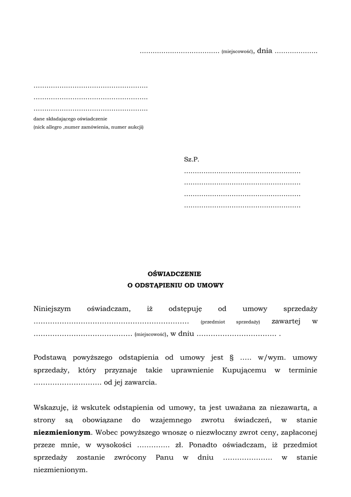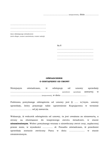 ………………………………. (miejscowość), dnia ……………….. …………………………………………….. …………………………………………….. …………………………………………….. dane składającego oświadczenie (nick allegro ,numer zamówienia, numer aukcji) Sz.P. ……………………………………………… ……………………………………………… ……………………………………………… ……………………………………………… OŚWIADCZENIE O ODSTĄPIENIU OD UMOWY Niniejszym oświadczam, iż odstępuję ………………………………………………………… od (przedmiot umowy sprzedaży) sprzedaży zawartej w …………………………………… (miejscowość), w dniu ……………………………. . Podstawą powyższego odstąpienia od umowy jest § ….. w/wym. umowy sprzedaży, który przyznaje takie uprawnienie Kupującemu w terminie ……………………….. od jej zawarcia. Wskazuję, iż wskutek odstąpienia od umowy, ta jest uważana za niezawartą, a strony są obowiązane do wzajemnego zwrotu świadczeń, w stanie niezmienionym. Wobec powyższego wnoszę o niezwłoczny zwrot ceny, zapłaconej przeze mnie, w wysokości ………….. zł. Ponadto oświadczam, iż przedmiot sprzedaży zostanie niezmienionym. zwrócony Panu w dniu ………………… w stanie Z poważaniem, …………………………… Art. 2. 1. Konsument, który zawarł umowę poza lokalem przedsiębiorstwa, może od niej odstąpić bez podania przyczyn, składając stosowne oświadczenie na piśmie, w terminie maksymalnym czternastu dni od zawarcia umowy. 2. Nie jest dopuszczalne zastrzeżenie, że konsumentowi wolno odstąpić od umowy za zapłatą oznaczonej sumy (odstępne). 3. W razie odstąpienia umowa jest uważana za niezawartą, a konsument jest zwolniony z wszelkich zobowiązań. To, co strony świadczyły, ulega zwrotowi w stanie niezmienionym, chyba że zmiana była konieczna w granicach zwykłego rozsądku. Jeżeli konsument dokonał jakichkolwiek przedpłat, należą się od nich odsetki ustawowe od daty dokonania przedpłaty. Prawo odstąpienia od umowy zawartej na odległość nie przysługuje Kupującemu (konsumentowi) w odniesieniu do umów: o świadczenie usług, jeżeli przedsiębiorca wykonał w pełni usługę za wyraźną zgodą konsumenta, który został poinformowany przed rozpoczęciem świadczenia, że po spełnieniu świadczenia przez przedsiębiorcę utraci prawo odstąpienia od umowy; w której cena lub wynagrodzenie zależy od wahań na rynku finansowym, nad którymi przedsiębiorca nie sprawuje kontroli, i które mo gą wystąpić przed upływem terminu do odstąpienia od umowy; w której przedmiotem świadczenia jest rzecz nieprefabrykowana, wyprodukowana według specyfikacji konsumenta lub służąca zaspo kojeniu jego indywidualnych potrzeb; w której przedmiotem świadczenia jest rzecz ulegająca szybkiemu zepsuciu lub mająca krótki termin przydatności do użycia; w której przedmiotem świadczenia jest rzecz dostarczana w zapieczętowanym opakowaniu, której po otwarciu opakowania nie możn a zwrócić ze względu na ochronę zdrowia lub ze względów higienicznych, jeżeli opakowanie zostało otwarte po dostarczeniu; w której przedmiotem świadczenia są rzeczy, które po dostarczeniu, ze względu na swój charakter, zostają nierozłącznie połączone z innymi rzeczami; w której przedmiotem świadczenia są napoje alkoholowe, których cena została uzgodniona przy zawarciu umowy sprzedaży, a któryc h dostarczenie może nastąpić dopiero po upływie 30 dni i których wartość zależy od wahań na rynku, nad którymi przedsiębiorca nie m a kontroli; w której konsument wyraźnie żądał, aby przedsiębiorca do niego przyjechał w celu dokonania pilnej naprawy lub konserwacji; jeżeli p rzedsiębiorca świadczy dodatkowo inne usługi niż te, których wykonania konsument żądał, lub dostarcza rzeczy inne niż części zamien ne niezbędne do wykonania naprawy lub konserwacji, prawo odstąpienia od umowy przysługuje konsumentowi w odniesieniu do dodatk owych usług lub rzeczy; w której przedmiotem świadczenia są nagrania dźwiękowe lub wizualne albo programy komputerowe dostarczane w zapieczętowany m opakowaniu, jeżeli opakowanie zostało otwarte po dostarczeniu; o dostarczanie dzienników, periodyków lub czasopism, z wyjątkiem umowy o prenumeratę; zawartej w drodze aukcji publicznej; o świadczenie usług w zakresie zakwaterowania, innych niż do celów mieszkalnych, przewozu rzeczy, najmu samochodów, gastrono mii, usług związanych z wypoczynkiem, wydarzeniami rozrywkowymi, sportowymi lub kulturalnymi, jeżeli w umowie oznaczono dzień lu b okres świadczenia usługi; o dostarczanie treści cyfrowych, które nie są zapisane na nośniku materialnym, jeżeli spełnianie świadczenia rozpoczęło się za wyraź ną zgodą konsumenta przed upływem terminu do odstąpienia od umowy i po poinformowaniu go przez przedsiębiorcę o utracie prawa o dstąpienia od umowy. Możliwość skorzystania z pozasądowych sposobów rozpatrywania reklamacji i dochodzenia roszczeń oraz dostęp do tych procedur: Kupujący będący konsumentem ma możliwość skorzystania z pozasądowego sposobu rozpatrywania reklamacji i dochodzenia roszcze ń przed Stałym Polubownym Sądem Konsumenckim przy Wojewódzkim Inspektorze Inspekcji Handlowej w Warszawie. Informacje o sp osobie dostępu do ww. trybu i procedur rozstrzygania sporów, znajdują się pod następującym adresem: http://www.uokik.gov.pl, w zakł adce „Rozstrzyganie sporów konsumenckich”.