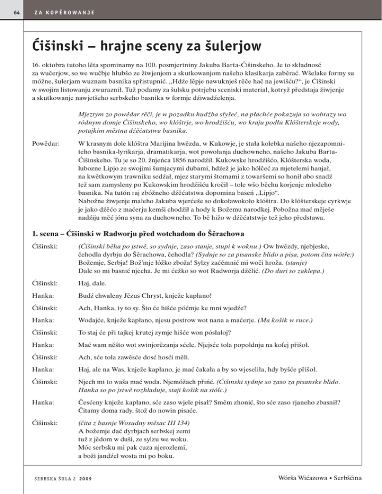 64 ZA KOPĚROWANJE Ćišinski – hrajne sceny za šulerjow 16. oktobra tutoho lěta spominamy na 100. posmjertniny Jakuba Barta-Ćišinskeho. Je to składnosć za wučerjow, so we wučbje hłubšo ze žiwjenjom a skutkowanjom našeho klasikarja zaběrać. Wšelake formy su móžne, šulerjam wuznam basnika spřistupnić. „Hdźe lěpje nawuknješ rěče hač na jewišću?“, je Ćišinski w swojim listowanju zwuraznił. Tuž podamy za šulsku potrjebu sceniski material, kotryž předstaja žiwjenje a skutkowanje nawjetšeho serbskeho basnika w formje dźiwadźelenja. Mjeztym zo powědar rěči, je w pozadku hudźba słyšeć, na płachće pokazuja so wobrazy wo ródnym domje Ćišinskeho, wo klóštrje, wo hrodźišću, wo kraju podłu Klóšterskeje wody, potajkim městna dźěćatstwa basnika. Powědar: W krasnym dole klóštra Marijina hwězda, w Kukowje, je stała kolebka našeho njezapomniteho basnika-lyrikarja, dramatikarja, wot powołanja duchowneho, našeho Jakuba BartaĆišinskeho. Tu je so 20. žnjeńca 1856 narodźił. Kukowske hrodźišćo, Klóšterska woda, lubozne Lipjo ze swojimi šumjacymi dubami, hdźež je jako hólčeć za mjetelemi hanjał, na kwětkowym trawniku sedźał, mjez starymi štomami z towaršemi so honił abo snadź tež sam zamysleny po Kukowskim hrodźišću kročił – tole wšo běchu korjenje młodeho basnika. Na tutón raj zbóžneho dźěćatstwa dopomina baseń „Lipjo“. Nabožne žiwjenje małeho Jakuba wjerćeše so dokoławokoło klóštra. Do klóšterskeje cyrkwje je jako dźěćo z maćerju kemši chodźił a hody k Božemu narodkej. Pobožna mać měješe nadźiju měć jónu syna za duchowneho. To bě hižo w dźěćatstwje tež jeho předstawa. 1. scena – Ćišinski w Radworju před wotchadom do Šěrachowa Ćišinski: (Ćišinski běha po jstwě, so sydnje, zaso stanje, stupi k woknu.) Ow hwězdy, njebjeske, čehodla dyrbju do Šěrachowa, čehodla? (Sydnje so za pisanske blido a pisa, potom čita wótře:) Božemje, Serbja! Bož’mje łóžko zboža! Sylzy zaćěmnić mi woči hroža. (stanje) Dale so mi basnić njecha. Je mi ćežko so wot Radworja dźělić. (Do duri so zaklepa.) Ćišinski: Haj, dale. Hanka: Budź chwaleny Jězus Chryst, knježe kapłano! Ćišinski: Ach, Hanka, ty to sy. Što će hišće póćmje ke mni wjedźe? Hanka: Wodajće, knježe kapłano, njesu postrow wot nana a maćerje. (Ma košik w ruce.) Ćišinski: To staj će při tajkej krutej zymje hišće won pósłałoj? Hanka: Mać wam něšto wot swinjorězanja sćele. Njejsće tola popołdnju na kofej přišoł. Ćišinski: Ach, sće tola zawěsće dosć hosći měli. Hanka: Haj, ale na Was, knježe kapłano, je mać čakała a by so wjeseliła, hdy byšće přišoł. Ćišinski: Njech mi to waša mać woda. Njemóžach přińć. (Ćišinski sydnje so zaso za pisanske blido. Hanka so po jstwě rozhladuje, staji košik na stólc.) Hanka: Česćeny knježe kapłano, sće zaso wjele pisał? Směm zhonić, što sće zaso rjaneho zbasnił? Čitamy doma rady, štož do nowin pisaće. Ćišinski: (čita z basnje Wosudny měsac III 134) A božemje dać dyrbjach serbskej zemi tuž z jědom w duši, ze sylzu we woku. Móc serbsku mi pak cuza njerozlemi, a boži jandźel wosta mi po boku. SER BSK A ŠUL A 2 2009 Wórša Wićazowa • Serbšćina ZA KOPĚROWANJE Hanka: (Dźe k woknu.) Smy doma tež wšitcy zrudni, zo dyrbiće woteńć. Ja bych najradšo tež Radwor wopušćiła. Ćišinski: Nó, dokal by ty chcyła? Hanka: Bych rady w Drježdźanach při kralowskim dworje słužiła. Mać ma tam znatu. Zawěsće bych potom móhła jónu rjenje zdrasćena do Kralowskeje dwórskeje opery hić a sej bohatych Drježdźanjanow wobhladać. Bych rady na rjanu hudźbu posłuchała. W našej cyrkwi sym wosebje hody wot pišćelow wobkuzłana. Ćišinski: Snadź změješ z Drježdźanami zbožo. Bože puće su wšelakore. Hanka: Knježe kapłano, něšto chcu Wam rady přeradźić. (Dźe k woknu, potom k durjam so přeswědčić, zo nichtó njeposka.) Ale božedla, njeprajće to nikomu. Ćišinski: (so směje) Tu nichtó njeje a njesłucha. Hanka: Naša mać a naš nan Waše basnje a wšitko, štož pisaće, jara rady čitataj a sej Was jara česćitaj a so jara mjerzataj a swaritaj, zo dyrbiće Radwor wopušćić! (mjelčišo) Ale nětko je naš nan někotrych burow narěčał, zo měli Was křižerjo hódnje na puću do Chelna přewodźeć. Ćišinski: Praj wašim, zo Bóh wšitko zapłaći. Budu husto na was spominać. Hanka: Jeli dowoliće, bych Wam rady pisała. Ćišinski: To by rjenje było a bych so zwjeselił! Snadź bórze list wot tebje z Drježdźan dóstanu. Hanka: Božemje, knježe kapłano. Jutře přińdu po sudobjo. (Woteńdźe.) Ćišinski: (Sydnje so za blido a pohlada najprjedy do košika.) Njejsym tola wopušćeny. Wo tym dyrbju hnydom domoj napisać. (Sydnje so a pisa.) Kónc sceny Powědar: (Rěči na hudźbu.) Ze Šěrachowa bu Ćišinski do Drježdźan přesadźeny, hdźež skutkowaše wot 1888–1896. To běchu za njeho te najzbožowniše lěta. Tu znaješe Bjarnata Krawca a dr. Filipa Rězaka, tu běchu sylna serbska kolonija 1000 Serbow a tež druzy přećeljoSłowjenjo – Češa, Polacy, Rusojo. Jako kapłan při Dwórskej cyrkwi dźěłaše na zběrce „Serbske zynki“ a zezna so z čěskej operowej spěwarku Therezu Saakowej. 21-lětna Saakowa spěwaše při Kralowskej dwórskej operje. Ćišinskemu a Krawcej so poradźi, připóznatu spěwarku zdobyć za sobuskutkowanje w koncertach. 2. scena – Ćišinski pola Krawca w Drježdźanach Zetkanje Ćišinskeho z młodej operowej spěwarku Terezu Saakowej pola Krawca w Drježdźanach. Saakowa bě přistajena při Kralowskej dwórskej operje. (Krawc sedźi za blidom, komponuje a zapisuje noty, hdyž so zaklepa a Ćišinski zastupi.) Krawc: Luby přećelo, strowju će wutrobnje. Ćišinski: Wjeselu so, Bóh njech će škita. (Wobjimataj so.) Słyšach hižo wonka, zo sy pilny. Krawc: Dźěłam 