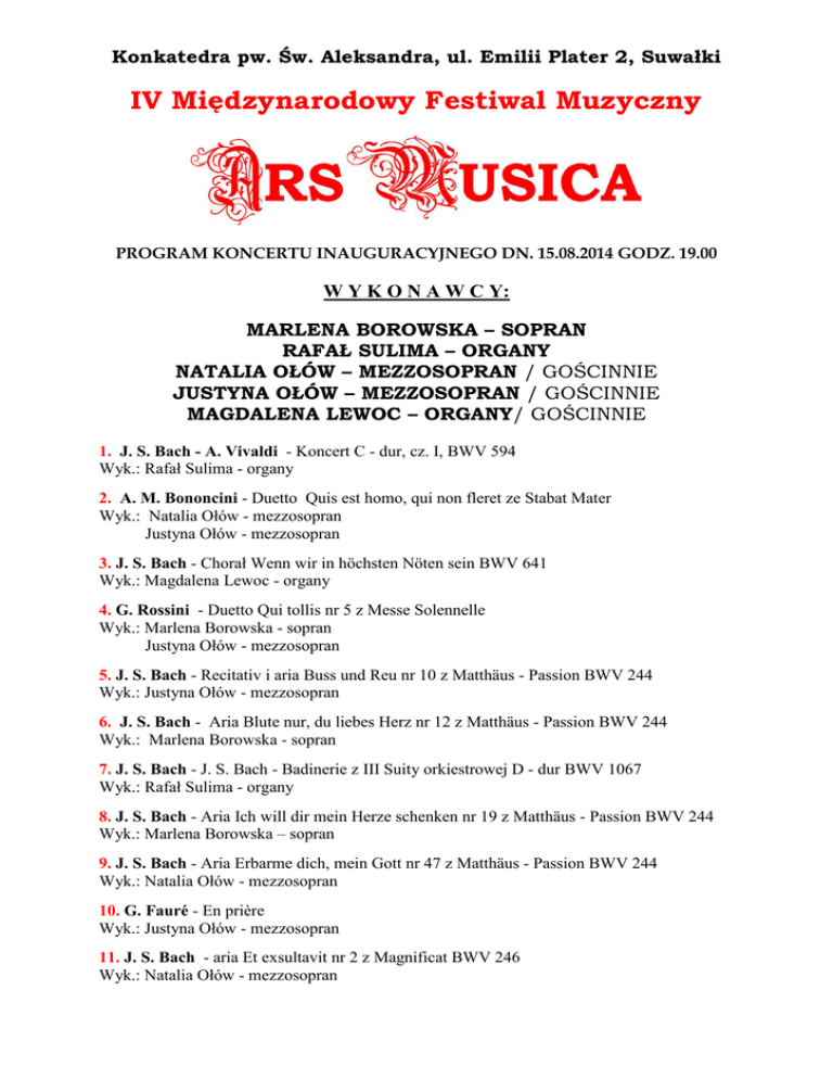 Konkatedra pw. Św. Aleksandra, ul. Emilii Plater 2, Suwałki IV Międzynarodowy Festiwal Muzyczny PROGRAM KONCERTU INAUGURACYJNEGO DN. 15.08.2014 GODZ. 19.00 W Y K O N A W C Y: MARLENA BOROWSKA – SOPRAN RAFAŁ SULIMA – ORGANY NATALIA OŁÓW – MEZZOSOPRAN / GOŚCINNIE JUSTYNA OŁÓW – MEZZOSOPRAN / GOŚCINNIE MAGDALENA LEWOC – ORGANY/ GOŚCINNIE 1. J. S. Bach - A. Vivaldi - Koncert C - dur, cz. I, BWV 594 Wyk.: Rafał Sulima - organy 2. A. M. Bononcini - Duetto Quis est homo, qui non fleret ze Stabat Mater Wyk.: Natalia Ołów - mezzosopran Justyna Ołów - mezzosopran 3. J. S. Bach - Chorał Wenn wir in höchsten Nöten sein BWV 641 Wyk.: Magdalena Lewoc - organy 4. G. Rossini - Duetto Qui tollis nr 5 z Messe Solennelle Wyk.: Marlena Borowska - sopran Justyna Ołów - mezzosopran 5. J. S. Bach - Recitativ i aria Buss und Reu nr 10 z Matthäus - Passion BWV 244 Wyk.: Justyna Ołów - mezzosopran 6. J. S. Bach - Aria Blute nur, du liebes Herz nr 12 z Matthäus - Passion BWV 244 Wyk.: Marlena Borowska - sopran 7. J. S. Bach - J. S. Bach - Badinerie z III Suity orkiestrowej D - dur BWV 1067 Wyk.: Rafał Sulima - organy 8. J. S. Bach - Aria Ich will dir mein Herze schenken nr 19 z Matthäus - Passion BWV 244 Wyk.: Marlena Borowska – sopran 9. J. S. Bach - Aria Erbarme dich, mein Gott nr 47 z Matthäus - Passion BWV 244 Wyk.: Natalia Ołów - mezzosopran 10. G. Fauré - En prière Wyk.: Justyna Ołów - mezzosopran 11. J. S. Bach - aria Et exsultavit nr 2 z Magnificat BWV 246 Wyk.: Natalia Ołów - mezzosopran 12. J. S. Bach - Terzett Suscepit Israel nr 10 z Magnificat BWV 246 Wyk.: Wyk.: Marlena Borowska - sopran Natalia Ołów - mezzosopran Justyna Ołów - mezzosopran 13. D. Buxtehude - Preludium, Fuga i Ciaccona C - dur Wyk.: Magdalena Lewoc - organy 14. L. Boëllmann - Toccata z Suity Gotyckiej Wyk.: Rafał Sulima - organy Rafał Sulima, Magdalena Lewoc – organy / akompaniament / Prowadzenie Koncertu Inauguracyjnego: Ewa Stapór Suwalskie Towarzystwo Muzyczne im. E. Młynarskiego w Suwałkach Organizacja Koncertu Inauguracyjnego: Marlena Borowska *********************************************************************************** ORGANIZATOR WIODĄCY: PAŃSTWOWA SZKOŁA MUZYCZNA I i II STOPNIA W SUWAŁKACH WSPÓŁORGANIZATORZY: CENTRUM EDUKACJI ARTYSTYCZNEJ W WARSZAWIE SUWALSKI OŚRODEK KULTURY W SUWAŁKACH UNIWERSYTET MUZYCZNY FRYDERYKA CHOPINA W WARSZAWIE AKADEMIA MUZYCZNA IM. KAROLA LIPIŃSKIEGO WE WROCŁAWIU SUWALSKIE TOWARZYSTWO MUZYCZNE IM. EMILA MŁYNARSKIEGO W SUWAŁKACH URZĄD MARSZAŁKOWKI WOJEWÓDZTWA PODLASKIEGO W BIAŁYMSTOKU STAROSTWO POWIATOWE W SUWAŁKACH URZĄD MIEJSKI W SUWAŁKACH BANK BGŻ S.A. ODDZIAŁ W SUWAŁKACH *********************************************************************************** PATRONATY MEDIALNE: *********************************************************************************** DYREKTOR ARTYSTYCZNY I ORGANIZACYJNY FESTIWALU - MARLENA BOROWSKA
