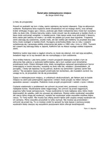 Świat jako niebezpieczne miejsce By Serge Kahili King (z listu do przyjaciela) Pozwól mi podzielić się tym z tobą, zanim zajmiemy się twoimi obawami. Żyję na aktywnym wulkanie. Roztopiona lawa wypływa około dwadzieścia mil od mojego domu, oraz istnieje krater emitujący trujący gaz z dziury, podczas gdy blask roztopionej lawy może być wysyłany tylko na dwie mile. Zmiana kierunku wiatru może zmusić nas do ewakuacji w każdej chwili, a lawa może wytrysnąć wszędzie i o każdej porze. Cała nasza woda musi pochodzić z deszczu, który także jest zależny od wiatru i za wiele nie padało już przez dwa tygodnie. Trzęsienia ziemi zdarzają się codziennie, zwykle małe, ale tak wielkie jak mieliśmy na przykład dwa lata temu może wystąpić w każdej chwili. Huragany przechodzą blisko nas co roku i czasami wyładowują się i sprawiają wielkie zniszczenia jak jeden w 1982 roku i inny w 1992. Tsunami też czasem się zdarzają kiedy w Japonii, Kalifornii lub na Alasce wystąpi wielkie trzęsienie ziemi. Niektórzy ludzie żyją tutaj w ciągłym strachu co może się zdarzyć, inni zaś żyją szczęśliwi, świadomi tego na co są narażeni ale nie rozmyślający o tym codziennie. Inna krótka historia: Lata temu jeden z moich przyjaciół obsesyjnie myślał o tym że olbrzymia fala uderza w wybrzeże kalifornijskie, dał o tym wykład czym śmiertelnie przestraszył ludzi. Potem któregoś dnia, kiedy szczegółowo opisywał zgromadzonym horror zmierzającej w twoim kierunku, wysokiej na dwie mile fali, wstałem i powiedziałem „W porządku, i kiedy tak będziesz na nią patrzył, stuknie cię samochód i zginiesz zanim fala uderzy.” Na szczęście nasza przyjaźń przetrwała ten komentarz, ale musiałem zwrócić mu uwagę na to, że przyszłości nie da się przewidzieć. Żyjesz w niebezpiecznym miejscu, w unikalnych okolicznościach, ale faktem jest że każde miejsce na ziemi jest potencjalnie zagrożone i śmierć może przyjść na milion różnych sposobów zawsze i wszędzie. Podobnie może przyjść przyjemność i radość z życia i miłości. Czytanie wiadomości o problemach nie uchroni cię przed nimi, ponieważ z nowością nadejdzie koniec. Wyobrażanie sobie najgorszego, nie uchroni cię przed najgorszym, pogorszy tylko twoje samopoczucie. Twoja wyobraźnia to twój najlepszy atut, która może doprowadzić do upadku, jeśli nie używasz jej właściwie. Możesz sobie wyobrażać wszystkie złe rzeczy które mogą się wydarzyć, możesz też wyobrażać sobie wszystkie możliwe dobre rzeczy. To Twój wybór. Nie musisz być ofiarą swoich lęków jeśli użyjesz swojej wyobraźni do ich zamiany. Mimo wszystko przyszłość to tylko wymysł. Nie możesz jej przewidzieć i ochronić się przed nią. To co możesz zrobić to sprawić by była lepsza z pomocą swojej wyobraźni kiedy cieszysz się wszystkimi pozytywami które oferuje teraźniejszość. Tłum. K. Bajurka