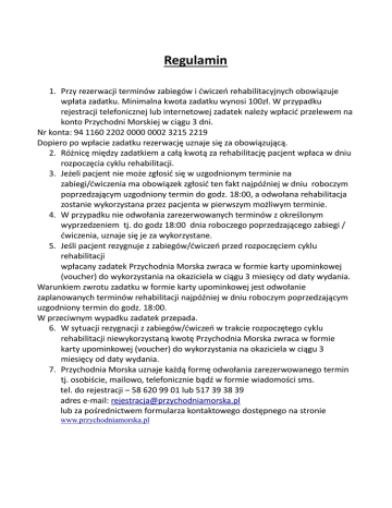 Regulamin 1. Przy rezerwacji terminów zabiegów i ćwiczeń rehabilitacyjnych obowiązuje wpłata zadatku. Minimalna kwota zadatku wynosi 100zł. W przypadku rejestracji telefonicznej lub internetowej zadatek należy wpłacić przelewem na konto Przychodni Morskiej w ciągu 3 dni. Nr konta: 94 1160 2202 0000 0002 3215 2219 Dopiero po wpłacie zadatku rezerwację uznaje się za obowiązującą. 2. Różnicę między zadatkiem a całą kwotą za rehabilitację pacjent wpłaca w dniu rozpoczęcia cyklu rehabilitacji. 3. Jeżeli pacjent nie może zgłosić się w uzgodnionym terminie na zabiegi/ćwiczenia ma obowiązek zgłosić ten fakt najpóźniej w dniu roboczym poprzedzającym uzgodniony termin do godz. 18:00, a odwołana rehabilitacja zostanie wykorzystana przez pacjenta w pierwszym możliwym terminie. 4. W przypadku nie odwołania zarezerwowanych terminów z określonym wyprzedzeniem tj. do godz 18:00 dnia roboczego poprzedzającego zabiegi / ćwiczenia, uznaje się je za wykorzystane. 5. Jeśli pacjent rezygnuje z zabiegów/ćwiczeń przed rozpoczęciem cyklu rehabilitacji wpłacany zadatek Przychodnia Morska zwraca w formie karty upominkowej (voucher) do wykorzystania na okaziciela w ciągu 3 miesięcy od daty wydania. Warunkiem zwrotu zadatku w formie karty upominkowej jest odwołanie zaplanowanych terminów rehabilitacji najpóźniej w dniu roboczym poprzedzającym uzgodniony termin do godz. 18:00. W przeciwnym wypadku zadatek przepada. 6. W sytuacji rezygnacji z zabiegów/ćwiczeń w trakcie rozpoczętego cyklu rehabilitacji niewykorzystaną kwotę Przychodnia Morska zwraca w formie karty upominkowej (voucher) do wykorzystania na okaziciela w ciągu 3 miesięcy od daty wydania. 7. Przychodnia Morska uznaje każdą formę odwołania zarezerwowanego termin tj. osobiście, mailowo, telefonicznie bądź w formie wiadomości sms. tel. do rejestracji – 58 620 99 01 lub 517 39 38 39 adres e-mail: [email protected] lub za pośrednictwem formularza kontaktowego dostępnego na stronie www.przychodniamorska.pl
