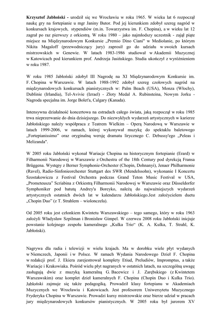Krzysztof Jabłoński - urodził się we Wrocławiu w roku 1965. W wieku lat 6 rozpoczął naukę gry na fortepianie u mgr Janiny Butor. Pod jej kierunkiem zdobył szereg nagród w konkursach krajowych, stypendiów (m.in. Towarzystwa im. F. Chopina), a w wieku lat 12 zagrał po raz pierwszy z orkiestrą. W roku 1980 – jako najmłodszy uczestnik - zajął piąte miejsce na Międzynarodowym Konkursie „Premio Dino Ciani" w Mediolanie, po którym Nikita Magaloff (przewodniczący jury) zaprosił go do udziału w swoich kursach mistrzowskich w Genewie. W latach 1983-1986 studiował w Akademii Muzycznej w Katowicach pod kierunkiem prof. Andrzeja Jasińskiego. Studia ukończył z wyróŜnieniem w roku 1987. W roku 1985 Jabłoński zdobył III Nagrodę na XI Międzynarodowym Konkursie im. F. Chopina w Warszawie. W latach 1988-1992 zdobył szereg czołowych nagród na międzynarodowych konkursach pianistycznych w: Palm Beach (USA), Monza (Włochy), Dublinie (Irlandia), Tel-Avivie (Izrael) - Złoty Medal A. Rubinsteina, Nowym Jorku Nagroda specjalna im. Jorge Bolet'a, Calgary (Kanada). Intensywna działalność koncertowa na estradach całego świata, jaką rozpoczął w roku 1985 trwa nieprzerwanie do dnia dzisiejszego. Do niezwykłych wydarzeń artystycznych w karierze Jabłońskiego naleŜy współpraca z Teatrem Wielkim – Operą Narodową w Warszawie w latach 1999-2006, w ramach, której wykonywał muzykę do spektaklu baletowego „Fortepianissimo” oraz oryginalną wersję dramatu lirycznego C. Debussy'ego „Peleas i Melizanda". W 2005 roku Jabłoński wykonał Wariacje Chopina na historycznym fortepianie (Erard) w Filharmonii Narodowej w Warszawie z Orchestra of the 18th Century pod dyrekcją Fransa Brüggena. Występy z Berner Symphonie-Orchester (Chopin, Dohnanyi), Jenaer Philharmonie (Ravel), Radio-Sinfonieorchester Stuttgart des SWR (Mendelssohn), wykonanie I Koncertu Szostakowicza z Festival Orchestra podczas Grand Teton Music Festival w USA, „Prometeusza” Scriabina z Orkiestrą Filharmonii Narodowej w Warszawie oraz Düsseldorfer Symphoniker pod batutą Andrey'a Boreyko, naleŜą do najwaŜniejszych wydarzeń artystycznych ostatnich dwóch lat w kalendarzu Jabłońskiego.Jest załoŜycielem duetu „Chopin Duo” (z T. Strahlem – wiolonczela). Od 2005 roku jest członkiem Kwintetu Warszawskiego – tego samego, który w roku 1963 załoŜyli Władysław Szpilman i Bronisław Gimpel. W czerwcu 2008 roku Jabłoński inicjuje powstanie kolejnego zespołu kameralnego „Kulka Trio“ (K. A. Kulka, T. Strahl, K. Jabłoński). Nagrywa dla radia i telewizji w wielu krajach. Ma w dorobku wiele płyt wydanych w Niemczech, Japonii i w Polsce. W ramach Wydania Narodowego Dzieł F. Chopina w redakcji prof. J. Ekiera zarejestrował komplety Etiud, Preludiów, Impromptus, a takŜe Wariacje i Krakowiaka. Pośród wielu płyt nagranych w ostatnich latach, na szczególną uwagę zasługują dwie z muzyką kameralną G. Bacewicz i J. Zarębskiego (z Kwintetem Warszawskim) oraz komplet dzieł kameralnych F. Chopina (Chopin Duo i Kulka Trio). Jabłoński zajmuje się takŜe pedagogiką. Prowadził klasy fortepianu w Akademiach Muzycznych we Wrocławiu i Katowicach. Jest profesorem Uniwersytetu Muzycznego Fryderyka Chopina w Warszawie. Prowadzi kursy mistrzowskie oraz bierze udział w pracach jury międzynarodowych konkursów pianistycznych. W 2005 roku był jurorem XV Międzynarodowego Konkursu Pianistycznego im. Fryderyka Chopina w Warszawie, International F. Chopin Piano Competition in ASIA, oraz The Seventh National Chopin Piano Competition of the United States.