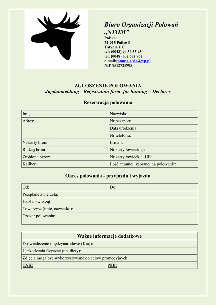 Biuro Organizacji Polowań „STOM” Polska 72-015 Police 3 Tatynia 1 C tel: (0048) 94 36 35 930 tel: (0048) 502 632 962 e-mail:[email protected] NIP 8512725905 ZGŁOSZENIE POLOWANIA Jagdanmeldung - Registration form for hunting – Declarer Rezerwacja polowania Imię: Nazwisko: Adres: Nr paszportu: Data urodzenia: Nr telefonu: Nr karty broni: E-mail: Rodzaj broni: Nr karty łowieckiej: Zrobiona przez: Nr karty łowieckiej UE: Kaliber: Ilość amunicji zabranej na polowanie: Okres polowania - przyjazdu i wyjazdu Od: Do: Pożądane zwierzęta: Liczba zwierząt: Towarzysz (imię, nazwisko): Obszar polowania: Ważne informacje dodatkowe Doświadczenie międzynarodowe (Kraj): Uszkodzenia fizyczne (np. diety): Zdjęcia mogą być wykorzystywane do celów promocyjnych: TAK: NIE: Dodatkowe koszty W przypadku, gdy polowanie zostanie anulowane, myśliwy zobowiązany jest zapłacić: 1) 30 dni przed datą przyjazdu – bezpłatne 2) 14-1 dni przed datą przyjazdu - 100% kosztów noclegów, wyżywienia oraz kosztów organizacji polowania Data …........................................ Podpis …......................................................................... HUNTING AGENCY “STOM” – YOUR PARTNER IN HUNTING ORGANIZATION JAGDBÜRO „STOM“- IHR PARTNER IN SACHEN JAGDVERANSTALTUNGEN