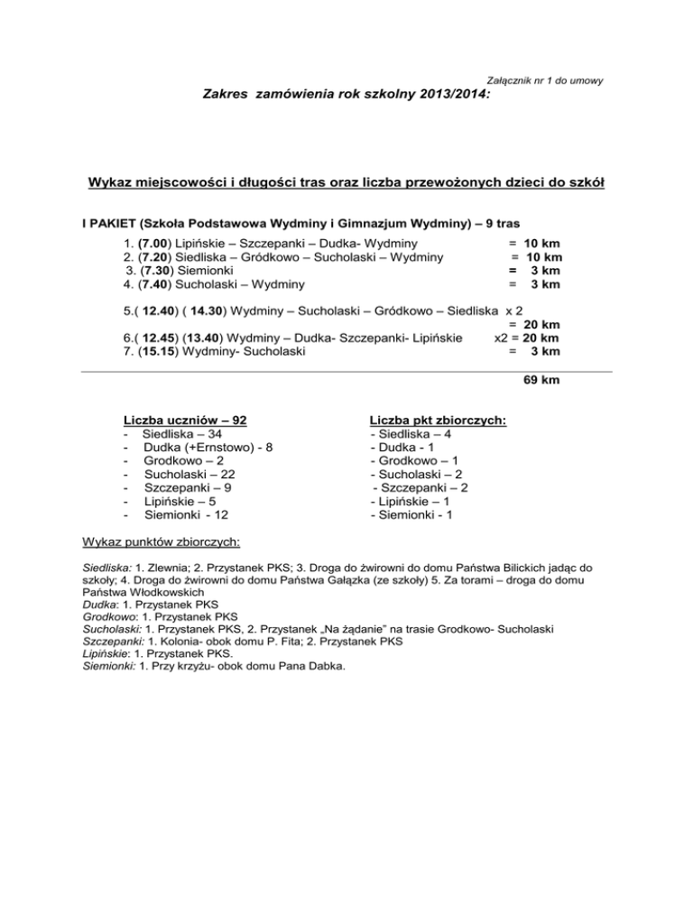 Załącznik nr 1 do umowy Zakres zamówienia rok szkolny 2013/2014: Wykaz miejscowości i długości tras oraz liczba przewożonych dzieci do szkół I PAKIET (Szkoła Podstawowa Wydminy i Gimnazjum Wydminy) – 9 tras 1. (7.00) Lipińskie – Szczepanki – Dudka- Wydminy 2. (7.20) Siedliska – Gródkowo – Sucholaski – Wydminy 3. (7.30) Siemionki 4. (7.40) Sucholaski – Wydminy = = = = 10 km 10 km 3 km 3 km 5.( 12.40) ( 14.30) Wydminy – Sucholaski – Gródkowo – Siedliska x 2 = 20 km 6.( 12.45) (13.40) Wydminy – Dudka- Szczepanki- Lipińskie x2 = 20 km 7. (15.15) Wydminy- Sucholaski = 3 km 69 km Liczba uczniów – 92 - Siedliska – 34 - Dudka (+Ernstowo) - 8 - Grodkowo – 2 - Sucholaski – 22 - Szczepanki – 9 - Lipińskie – 5 - Siemionki - 12 Liczba pkt zbiorczych: - Siedliska – 4 - Dudka - 1 - Grodkowo – 1 - Sucholaski – 2 - Szczepanki – 2 - Lipińskie – 1 - Siemionki - 1 Wykaz punktów zbiorczych: Siedliska: 1. Zlewnia; 2. Przystanek PKS; 3. Droga do żwirowni do domu Państwa Bilickich jadąc do szkoły; 4. Droga do żwirowni do domu Państwa Gałązka (ze szkoły) 5. Za torami – droga do domu Państwa Włodkowskich Dudka: 1. Przystanek PKS Grodkowo: 1. Przystanek PKS Sucholaski: 1. Przystanek PKS, 2. Przystanek „Na żądanie” na trasie Grodkowo- Sucholaski Szczepanki: 1. Kolonia- obok domu P. Fita; 2. Przystanek PKS Lipińskie: 1. Przystanek PKS. Siemionki: 1. Przy krzyżu- obok domu Pana Dabka. I I PAKIET (Szkoła Podstawowa Talki, Szkoła Podstawowa Zelki, Gimnazjum Wydminy) – 8 tras 1. ( 6.30) Malinka – Pamry – Ranty – Rostki – Okrągłe -Talki – Biała Giżycka – Pańska Wola –Skomack W.- Zelki – Hejbuty – Ranty – Ranty Cegielnia – Wydminy =45,50 km 2. ( 7.00) Radzie – Hejbuty – Zelki – Berkowo – Zelki – Pańska Wola – Biała Giżycka – Talki – Rostki – Ranty – Wydminy =34 km 3. ( 12.40) Wydminy – Ranty – Pamry- Malinka = 11,5 km 4. (13.40) Wydminy – Ranty –Radzie- Hejbuty – Zelki– Pańska Wola – Biała Giżycka – Talki =26,50km 5. (14.40) Wydminy- Ranty – Pamry- Malinka- Pamry –Talki – Biała Giżycka– Pańska Wola– Zelki-Berkowo- Zelki – Hejbuty- Radzie =45,00km 6. ( 15.15) Wydminy – Ranty – Rostki – Talki – Biała Giżycka - Pańska Wola- Kolonia Zelki (p. Krysztofik) – Zelki – =21,90 km 7. ( 12.45) Zelki – Berkowo – Zelki – Hejbuty – Zelki –Skomack W.- Pańska Wola Biała Giżycka – Talki -Okrągłe -Talki- Biała Giżycka - Talki – Rostki – Ranty – Ranty Cegielnia-– Pamry – Malinka – Pamry – Ranty – Radzie = 59,3 km 8. ( 14.30) Zelki – Berkowo- Zelki- Hejbuty – Zelki – Pańska Wola – Biała Giżycka – Talki – Biała Gizycka- Talki- Rostki – Ranty – Pamry – Malinka – Pamry – Ranty – Radzie = 44,3 km 288,00 km Liczba uczniów 135- - SP Talki: - Rostki – 6 - Radzie – 4 - Ranty – 6 - Pamry – 9 - Malinka – 2 - Biała Giżycka – 4 - Okrągłe -2 ZSO Wydminy: - Hejbuty – 5 - Radzie – 2 - Ranty – 7 SP Talki – 34 SP Zelki – 46 ZSO Wydminy – 55 SP Zelki: - Pańska Wola – 10 - Hejbuty – 7 - Berkowo – 19 - Ranty -2 - Zelki - 1 - Skomack W.- 3 - Kolonia Zelki-5 - Pamry – 3 - Biała Giżycka – 3 - Talki – 9 - Zelki – 18 - Berkowo -3 - Malinka - 5 Liczba pkt zbiorczych: Talki – 2; Biała Giżycka – 1; Malinka – 1 ; Ranty – 3; Berkowo – 1;Pańska Wola – 2 Hejbuty – 3; Zelki – 5; Radzie – 1; Pamry – 1; Rostki – 1 Wykaz punktów zbiorczych: Talki: 1. Przy szkole, 2. Przystanek PKS Biała Giżycka: 1. Przystanek PKS Malinka: 1. Krzyżówka drogi do leśniczego. Ranty: 1. Krzyżówka Pamry- Talki (przystanek PKS); 2. Cegielnia; 3. Przystanek PKS Berkowo: 1. Przystanek PKS Pańska Wola: 1. Pomiędzy domem Pana Bartolewskiego a Pana Szewczyka; 2. Przystanek PKS Hejbuty: 1. Przystanek PKS; 2. Stary przystanek PKS (obok domu Pana Samulaka); 3. Obok domu Pana Borawskiego Zelki: 1. Przystanek PKS; 2. Przy drodze na Berkowo (obok domu Pani Mikołajewicz); 3. Obok domu pana Tyszkiewicza; 4. Przystanek na żądanie przy drodze na Hejbuty; 5. Szkoła Podstawowa, 6. Kolonia Zelki obok p. Krysztofika Radzie: 1. Krzyżówka we wsi. Pamry: 1. Przystanek PKS Rostki: 1. Przystanek PKS. Skomack W.: Przystanek PKS przy szkole III PAKIET (Zespół Szkół w Gawlikach Wielkich) – 9 tras 1. ( 7.00) Pietrasze –Szczybały Orł. - Grądzkie –Grądzkie Tory – Gawliki Wielkie =14.30 km 2. ( 7.00) Gajrowskie - Orłowo – Łękuk M.- Gawliki Wielkie – = 11,5 km 3. ( 7.40) Czarnówka – Gawliki Wielkie = 3,5 km 4. (7.30) Orłowo – Szczybały Orł. – Gawliki Wielkie kolonia – Gawliki Wielkie szkoła =11,30 km 5. (12.40) Gawliki Wielkie –Gawkliki W. kolonia- Grądzkie –Grądzkie Tory – Szczybały Orłowskie - Pietrasze = 18,1 km 6. (12.40) Gawliki Wielkie – Szczybały Orł.- Łękuk Mały – Orłowo – Gajrowskie = 11,5 km 7. ( 13.35) Gawliki Wielkie – Czarnówka = 3,5 km 8. ( 14.30) Gawliki Wielkie – Gawliki Wielkie kolonia -Grądzkie –Grądzkie Tory – Szczybały Orłowskie – Pietrasze = 18,1 km 9. ( 14.30) Gawliki Wielkie – Szczybały Orłowskie –Łękuk M.- Orłowo – Gajrowskie = 11,5km 103,30 km Liczba uczniów – 109 - Orłowo – 26 - Szczybały Orłowskie – 12 - Pietrasze – 5 - Grądzkie – 16 - Grądzkie Tory – 3 - Czarnówka – 7 - Gajrowskie – 10 - Łękuk Mały – 16 - Gawliki Wielkie – 14 Liczba pkt zbiorczych: Orłowo – 2 Szczybały Orłowskie – 3 Pietrasze – 2 Grądzkie – 4 Czarnówka - 2 Gajrowskie – 1 Gawliki Wielkie (kolonia) - 2 Łekuk Mały- 1 Wykaz punktów zbiorczych; Orłowo: 1. Przystanek PKS, 2. Przy cmentarzu Szczybały ORł: 1. Przystanek PKS, 2. Obok domu Pani Meus, 3. Obok drogi do Państwa Lotkowskich Pietrasze: 1. Obok domu P. Monkiewicza; 2. Obok domu P. Siedleckiego Grądzkie: 1. Obok domu Pani Mikusek; 2. Obok domu P. Pindur; 3. Grądzkie tory; 4. Obok domu P. Siekaniec Czarnówka: 1. Obok domu J