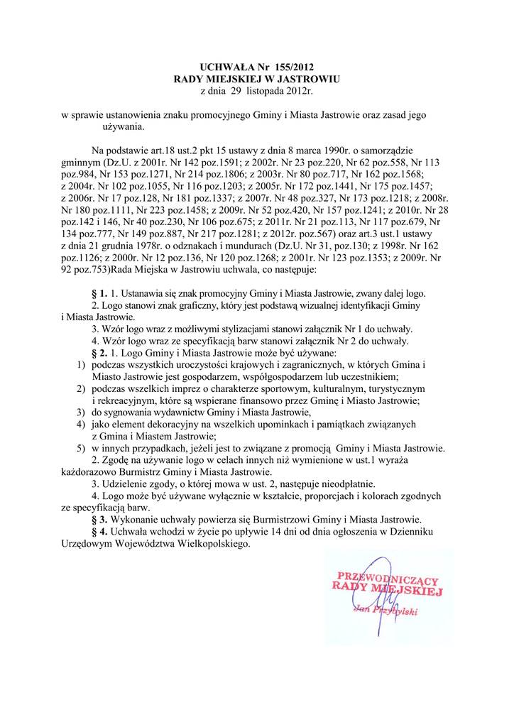 UCHWAŁA Nr 155/2012 RADY MIEJSKIEJ W JASTROWIU z dnia 29 listopada 2012r. w sprawie ustanowienia znaku promocyjnego Gminy i Miasta Jastrowie oraz zasad jego uŜywania. Na podstawie art.18 ust.2 pkt 15 ustawy z dnia 8 marca 1990r. o samorządzie gminnym (Dz.U. z 2001r. Nr 142 poz.1591; z 2002r. Nr 23 poz.220, Nr 62 poz.558, Nr 113 poz.984, Nr 153 poz.1271, Nr 214 poz.1806; z 2003r. Nr 80 poz.717, Nr 162 poz.1568; z 2004r. Nr 102 poz.1055, Nr 116 poz.1203; z 2005r. Nr 172 poz.1441, Nr 175 poz.1457; z 2006r. Nr 17 poz.128, Nr 181 poz.1337; z 2007r. Nr 48 poz.327, Nr 173 poz.1218; z 2008r. Nr 180 poz.1111, Nr 223 poz.1458; z 2009r. Nr 52 poz.420, Nr 157 poz.1241; z 2010r. Nr 28 poz.142 i 146, Nr 40 poz.230, Nr 106 poz.675; z 2011r. Nr 21 poz.113, Nr 117 poz.679, Nr 134 poz.777, Nr 149 poz.887, Nr 217 poz.1281; z 2012r. poz.567) oraz art.3 ust.1 ustawy z dnia 21 grudnia 1978r. o odznakach i mundurach (Dz.U. Nr 31, poz.130; z 1998r. Nr 162 poz.1126; z 2000r. Nr 12 poz.136, Nr 120 poz.1268; z 2001r. Nr 123 poz.1353; z 2009r. Nr 92 poz.753)Rada Miejska w Jastrowiu uchwala, co następuje: § 1. 1. Ustanawia się znak promocyjny Gminy i Miasta Jastrowie, zwany dalej logo. 2. Logo stanowi znak graficzny, który jest podstawą wizualnej identyfikacji Gminy i Miasta Jastrowie. 3. Wzór logo wraz z moŜliwymi stylizacjami stanowi załącznik Nr 1 do uchwały. 4. Wzór logo wraz ze specyfikacją barw stanowi załącznik Nr 2 do uchwały. § 2. 1. Logo Gminy i Miasta Jastrowie moŜe być uŜywane: 1) podczas wszystkich uroczystości krajowych i zagranicznych, w których Gmina i Miasto Jastrowie jest gospodarzem, współgospodarzem lub uczestnikiem; 2) podczas wszelkich imprez o charakterze sportowym, kulturalnym, turystycznym i rekreacyjnym, które są wspierane finansowo przez Gminę i Miasto Jastrowie; 3) do sygnowania wydawnictw Gminy i Miasta Jastrowie, 4) jako element dekoracyjny na wszelkich upominkach i pamiątkach związanych z Gmina i Miastem Jastrowie; 5) w innych przypadkach, jeŜeli jest to związane z promocją Gminy i Miasta Jastrowie. 2. Zgodę na uŜywanie logo w celach innych niŜ wymienione w ust.1 wyraŜa kaŜdorazowo Burmistrz Gminy i Miasta Jastrowie. 3. Udzielenie zgody, o której mowa w ust. 2, następuje nieodpłatnie. 4. Logo moŜe być uŜywane wyłącznie w kształcie, proporcjach i kolorach zgodnych ze specyfikacją barw. § 3. Wykonanie uchwały powierza się Burmistrzowi Gminy i Miasta Jastrowie. § 4. Uchwała wchodzi w Ŝycie po upływie 14 dni od dnia ogłoszenia w Dzienniku Urzędowym Województwa Wielkopolskiego. UZASADNIENIE do uchwały Nr 155/2012 Rady Miejskiej w Jastrowiu z dnia 29 listopada 2012r. w sprawie ustanowienia znaku promocyjnego Gminy i Miasta Jastrowie oraz zasad jego uŜywania. Na podstawie art. 3 ustawy z dnia 21 grudnia 1978r. o odznakach i mundurach (Dz.U. Nr 31, poz.130 ze zm.) jednostki samorządu terytorialnego mogą ustanawiać, w drodze uchwały organu stanowiącego danej jednostki, własne herby, flagi, emblematy oraz insygnia i inne symbole. Zgodnie z tym przepisem do wyłącznej własności rady gminy naleŜy podejmowanie uchwał w sprawach herbu i innych symboli gminy. RównieŜ orzecznictwo sądowo-administracyjne przyznało jednostkom samorządu terytorialnego prawo posługiwania się własnym logo, podkreślając jednocześnie, Ŝe podejmowanie uchwał w tym przedmiocie stanowi uprawnienia rady, które powinno być realizowane zgodnie z procedurą określoną w przepisach ustawy o odznakach i mundurach oraz ustawy o samorządzie gminnym. Znak graficzny Gminy i Miasta Jastrowie został wyłoniony w drodze konkursu ogłoszonego przez Burmistrza Gminy i Miasta Jastrowie. Konieczność opracowania logo jako wyróŜnika Gminy i Miasta Jastrowie związana jest z walorami turystycznymi gminy i stworzeniem systemu identyfikacji wizualnej jako niezwykle waŜnego elementu w komunikacji oferty z rynkiem zewnętrznym. Opracowanie i wprowadzenie jednolitego znaku będzie promowało obszar całej gminy i miasta, budując w ten sposób ich turystyczny wizerunek. W ogłoszonym konkursie wpłynęło 227 ofert, z których zwycięŜył projekt Pani Ewy Brzychcy z Koszalina. Komisję konkursowa zaakceptowała sposób prezentacji logotypu oraz łatwość zastosowania logo w materiałach promocyjnych. Autorski opis projektu przestawia się następująco: „logo odnosi się do bogactwa naturalnego i walorów turystycznych gminy; wykorzystane kolory – zieleń i błękit nawiązują do flagi Jastrowia, zaś korona umieszczona na tle wschodzącego Słońca przypomina , iŜ Jastrowie jest Królewskim Miastem; cały znak tworzy harmonijną całość pod względem kompozycji, symboliki i kolorystyki. Zgodnie ze stanowiskiem ministra właściwego w sprawach administracji publicznej logo jako znak graficzny nie jest tworzone w oparciu o zasady sztuki heraldycznej ani weksylologii, stąd w procedurze ustanawiania tego znaku nie jest wymagana opinia Komisji Heraldycznej.