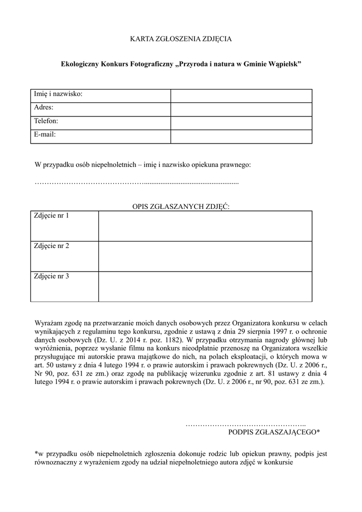KARTA ZGŁOSZENIA ZDJĘCIA Ekologiczny Konkurs Fotograficzny „Przyroda i natura w Gminie Wąpielsk” Imię i nazwisko: Adres: Telefon: E-mail: W przypadku osób niepełnoletnich – imię i nazwisko opiekuna prawnego: ……………………………………….................................................... OPIS ZGŁASZANYCH ZDJĘĆ: Zdjęcie nr 1 Zdjęcie nr 2 Zdjęcie nr 3 Wyrażam zgodę na przetwarzanie moich danych osobowych przez Organizatora konkursu w celach wynikających z regulaminu tego konkursu, zgodnie z ustawą z dnia 29 sierpnia 1997 r. o ochronie danych osobowych (Dz. U. z 2014 r. poz. 1182). W przypadku otrzymania nagrody głównej lub wyróżnienia, poprzez wysłanie filmu na konkurs nieodpłatnie przenoszę na Organizatora wszelkie przysługujące mi autorskie prawa majątkowe do nich, na polach eksploatacji, o których mowa w art. 50 ustawy z dnia 4 lutego 1994 r. o prawie autorskim i prawach pokrewnych (Dz. U. z 2006 r., Nr 90, poz. 631 ze zm.) oraz zgodę na publikację wizerunku zgodnie z art. 81 ustawy z dnia 4 lutego 1994 r. o prawie autorskim i prawach pokrewnych (Dz. U. z 2006 r., nr 90, poz. 631 ze zm.). ………………………………………….. PODPIS ZGŁASZAJĄCEGO* *w przypadku osób niepełnoletnich zgłoszenia dokonuje rodzic lub opiekun prawny, podpis jest równoznaczny z wyrażeniem zgody na udział niepełnoletniego autora zdjęć w konkursie
