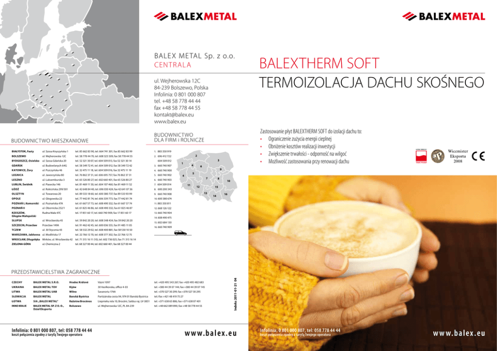 balex metal sp. z o.o. CENTR AL A ul. Wejherowska 12C 84-239 Bolszewo, Polska Infolinia: 0 801 000 807 tel. +48 58 778 44 44 fax +48 58 778 44 55 [email protected] www.balex.eu BUDOWNICTWO MIESZKANIOWE BUDOWNICTWO dla firm i ROLNICZE BIAŁYSTOK, Fasty ul. Szosa Knyszyńska 1 tel. 85 662 83 90, tel. 664 741 301, fax 85 662 83 99 1. 883 350 919 BOLSZEWO ul. Wejherowska 12C tel. 58 778 44 70, tel. 608 325 509, fax 58 778 44 55 2. 696 412 722 BYDGOSZCZ, Osielsko ul. Szosa Gdańska 20 tel. 52 321 30 07, tel. 604 509 013, fax 52 321 30 14 604 509 012 GDAŃSK ul. Budowlanych 64G tel. 58 349 72 41, tel. 604 509 012, fax 58 349 72 42 3. 660 740 907 Katowice, Żory ul. Pszczyńska 46 tel. 32 475 11 18, tel. 604 509 016, fax 32 475 11 19 4. 660 740 900 Legnica ul. Jaworzyńska 80 tel. 76 862 37 31, tel. 606 695 757, fax 76 862 37 31 5. 660 740 902 Leszno ul. Luksemburska 3 tel. 65 526 80 27, tel. 602 660 401, fax 65 526 80 27 6. 660 740 903 Lublin, Świdnik ul. Piasecka 146 tel. 81 469 11 50, tel. 604 107 460, fax 81 469 11 52 7. 604 509 014 Łódź ul. Rokicińska 299/301 tel. 42 648 84 40, tel. 696 030 424, fax 42 641 07 36 8. 600 200 343 Olsztyn ul. Towarowa 20 tel. 89 533 18 60, tel. 600 380 737, fax 89 533 93 99 9. 660 740 908 Opole ul. Głogowska 22 tel. 77 442 81 74, tel. 606 339 773, fax 77 442 81 74 10. 600 380 674 Poznań I, Komorniki ul. Poznańska 47A tel. 61 667 57 73, tel. 608 490 332, fax 61 667 57 74 11. 883 350 811 POZNAŃ II ul. Obornicka 252/1 tel. 61 825 46 86, tel. 608 490 332, fax 61 825 46 87 12. 668 126 122 Rzeszów, Głogów Małopolski Rudna Mała 47C tel. 17 851 60 17, tel. 660 740 909, fax 17 851 60 17 13. 660 740 904 Słupsk ul. Wrocławska 45 tel. 59 842 20 20, tel. 608 348 434, fax 59 842 20 20 Szczecin, Przecław Przecław 149A tel. 91 462 42 45, tel. 600 036 555, fax 91 485 11 05 Tczew ul. 30 Stycznia 43 tel. 58 532 29 02, tel. 608 400 881, fax 58 530 10 50 Warszawa, Jabłonna ul. Modlińska 17 tel. 22 766 12 70, tel. 608 377 302, fax 22 766 12 75 Wrocław, Długołęka Mirków, ul. Wrocławska 42 tel. 71 315 16 11 (10), tel. 602 736 025, fax 71 315 16 14 Zielona Góra tel. 68 327 00 44, tel. 602 660 401, fax 68 327 00 44 ul. Chemiczna 2 Zastosowanie płyt BALEXTHERM SOFT do izolacji dachu to: • Ograniczenie zużycia energii cieplnej • Obniżenie kosztów realizacji inwestycji • Zwiększenie trwałości - odporność na wilgoć • Możliwość zastosowania przy renowacji dachu 2 3 1 4 6 BALEXTHERM SOFT TERMOIZOLACJA DACHU SKOŚNEGO 9 5 4 7 11 12 8 10 15 13 14 16 14. 608 490 475 15. 602 684 130 16. 660 740 909 CZECHY balex metal s.r.o. Hradec Králové Vázní 1097 tel. +420 495 543 267, fax +420 495 482 683 UKRAINA balex metal TOV Kijów 30 Vasilkovska, office 4-03 tel. +380 44 39 07 144, fax +380 44 39 07 145 LITWA balex metal UAB Wilno Savanoriu 174A tel. +370 527 30 299, fax +370 527 30 295 Słowacja balex metal Banská Bystrica Partizánska cesta 94, 974 01 Banská Bystrica tel./fax +421 48 419 75 27 ŁOTWA SIA „balex metal” Ražotne Brocēnos Liepnieku iela 10, Brocēni, Saldus raj. LV-3851 tel. +371 638 65 886, fax +371 638 07 401 INNE KRAJE BALEX METAL SP. Z O. O., Dział Eksportu Bolszewo ul. Wejherowska 12C, PL 84-239 tel. +48 662 089 890, fax +48 58 778 44 55 Infolinia: 0 801 000 807, tel: 058 778 44 44 koszt połączenia zgodny z taryfą Twojego operatora indeks 2011-01-21 04 PRZEDSTAWICIELSTWA ZAGRANICZNE w w w.b a lex.e u Infolinia: 0 801 000 807, tel: 058 778 44 44 koszt połączenia zgodny z taryfą Twojego operatora w w w. ba l ex . e u TERMOIZOLACJA DACHU SKOŚNEGO BALEXTHERM SOFT Płyty termoizolacyjne BALEXTHERM SOFT to nowoczesny materiał do izolacji dachów. Dzisiejsze wymagania stawiane termoizolacyjnym materiałom budowlanym są coraz bardziej rygorystyczne ze względu na oszczędność energii, a co za tym idzie, ochronę środowiska. Dlatego też płyty BALEXTHERM SOFT to doskonały produkt dla wszystkich klientów oszczędzających pieniądze i czas. INFORMACJE TECHNICZNE OSZCZĘDZASZ PIENIĄDZE • Nie ponosisz dodatkowych kosztów ponieważ płyty termoizolacyjne BALEXTHERM SOFT są lekkie i nie obciążają dodatkowo konstrukcji dachu. Można je również bezpiecznie stosować przy renowacji dachów. • Niższe koszty transportu ponieważ płyty termoizolacyjne BALEXTHERM SOFT mają mniejszą objętość i ciężar, co pozwala na maksymalne wykorzystanie ładowności transportu. • Nie musisz często remontować dachu ponieważ płyty termoizolacyjne BALEXTHERM SOFT stanowią ochronę dla krokwi eliminując ich starzenie i pracę pod wpływem zmian temperatur. Materiał izolacyjny Okładzina Wykończenie standardowe Szerokość całkowita (modularna) Grubość Długości standardowe Gęstość Współczynnik przewodzenia ciepła λ Klasa reakcji na ogień Wytrzymałość na ściskanie Opakowanie Kod oznaczenia • Szybciej zamontujesz dach ponieważ nie ma potrzeby wypełnienia wełną mineralną przestrzeni pomiędzy krokwiami, sznurowania czy montażu folii paroizolacyjnej. Płyty termoizolacyjne BALEXTHERM SOFT montuje się bezpośrednio na krokwie. • Skracasz czas wykonania robót ponieważ płyty termoizolacyjne BALEXTHERM SOFT można montować niezależnie od pogody. OSZCZĘDZASZ ENERGIĘ • Ograniczasz zużycie energii cieplnej ponieważ specjalne podcięcia na felc płyt termoizolacyjnych BALEXTHERM SOFT likwidują mostki termiczne. • Zwiększa się izolacja termiczna ponieważ poliuretan wykorzystywany do produkcji płyt termoizolacyjnych BALEXTHERM SOFT jest najlepszym materiałem izolacyjnym stosowanym w budownictwie. • Nie musisz obawiać się wilgoci ponieważ płyty termoizolacyjne BALEXTHERM SOFT nie tracą właściwości termoizolacyjnych. Dodatkowo, poliuretan stosowany w płytach blokuje rozwijanie się grzybów i pleśni, a gryzonie nie drążą w nich nor. WŁAŚCIWOŚCI RÓŻNYCH MATERIAŁÓW IZOLACYJNYCH Płyty termoizolacyjne BALEXTHERM SOFT wykonane są z pianki poliuretanowej. Posiadają one 