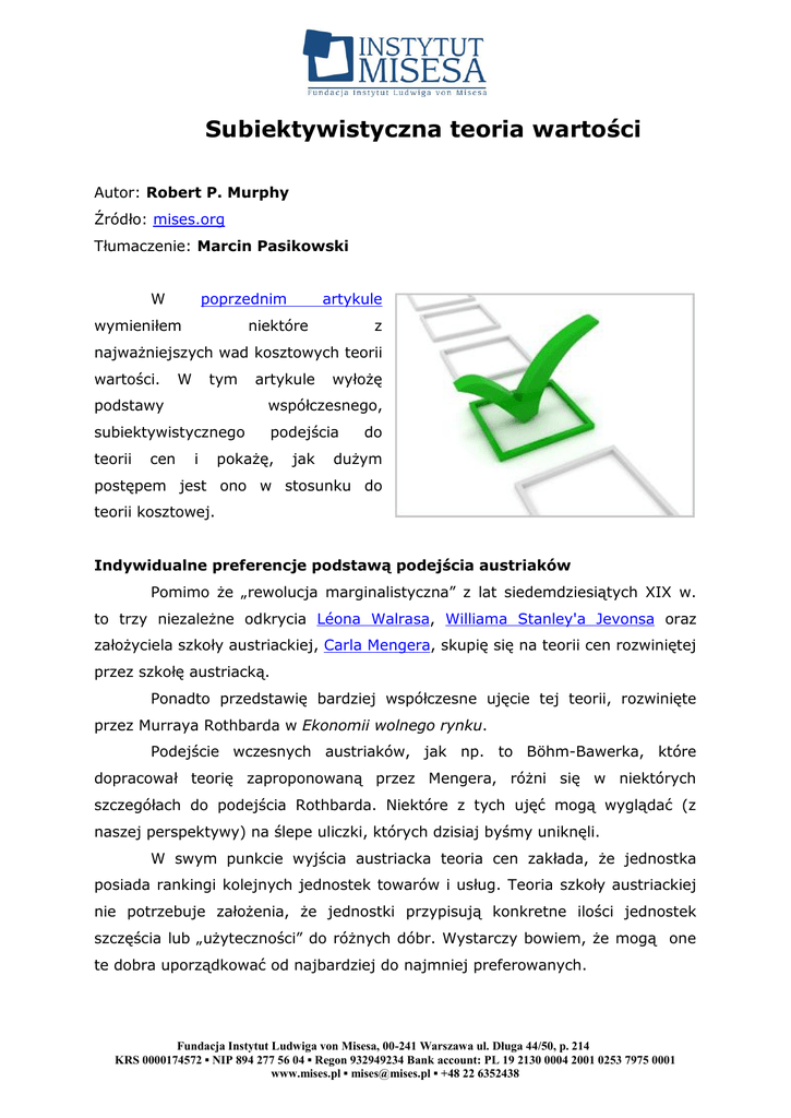 Subiektywistyczna teoria wartości Autor: Robert P. Murphy Źródło: mises.org Tłumaczenie: Marcin Pasikowski W poprzednim wymieniłem artykule niektóre z najważniejszych wad kosztowych teorii wartości. W tym artykule wyłożę podstawy współczesnego, subiektywistycznego podejścia teorii cen i pokażę, jak do dużym postępem jest ono w stosunku do teorii kosztowej. Indywidualne preferencje podstawą podejścia austriaków Pomimo że „rewolucja marginalistyczna” z lat siedemdziesiątych XIX w. to trzy niezależne odkrycia Léona Walrasa, Williama Stanley'a Jevonsa oraz założyciela szkoły austriackiej, Carla Mengera, skupię się na teorii cen rozwiniętej przez szkołę austriacką. Ponadto przedstawię bardziej współczesne ujęcie tej teorii, rozwinięte przez Murraya Rothbarda w Ekonomii wolnego rynku. Podejście wczesnych austriaków, jak np. to Böhm-Bawerka, które dopracował teorię zaproponowaną przez Mengera, różni się w niektórych szczegółach do podejścia Rothbarda. Niektóre z tych ujęć mogą wyglądać (z naszej perspektywy) na ślepe uliczki, których dzisiaj byśmy uniknęli. W swym punkcie wyjścia austriacka teoria cen zakłada, że jednostka posiada rankingi kolejnych jednostek towarów i usług. Teoria szkoły austriackiej nie potrzebuje założenia, że jednostki przypisują konkretne ilości jednostek szczęścia lub „użyteczności” do różnych dóbr. Wystarczy bowiem, że mogą one te dobra uporządkować od najbardziej do najmniej preferowanych. Fundacja Instytut Ludwiga von Misesa, 00-241 Warszawa ul. Długa 44/50, p. 214 KRS 0000174572 ▪ NIP 894 277 56 04 ▪ Regon 932949234 Bank account: PL 19 2130 0004 2001 0253 7975 0001 www.mises.pl ▪ [email protected] ▪ +48 22 6352438 Jeśli przyjrzymy się liczbowemu przykładowi ze stron 233–236 z I tomu Ekonomii wolnego rynku, to zobaczymy, jak współcześni austriacy wyjaśniają tworzenie się cen. Powiedzmy, że istnieje dwóch mężczyzn: Smith i Johnson. Smith posiada dużo beczek ryb, podczas gdy Johnson posiada konia. Poniższy diagram pokazuje, w jaki sposób tych dwóch mężczyzn subiektywnie ocenia różne liczby ryb i koni: Subiektywne oceny Smitha: Subiektywne oceny Johnsona: Nawiasy w diagramach powyżej oznaczają, że osoba nie posiada danych przedmiotów, ale potrafi sobie wyobrazić i porównać ich posiadanie z rzeczywistym stanem posiadania. Możemy zauważyć, że Smith ceni 103 beczki ryb bardziej niż 102 lub 101 beczek. Czwartą w kolejności rzeczą, której pragnie Smith, jest koń (którego aktualnie nie posiada). Kolejną najlepszą sytuację byłoby posiadanie 100 beczek ryb i tak dalej. Johnson aktualnie nie posiada żadnych ryb, jednak ceni najwyżej 84 beczki ryb, potem 83, 82 itd. Piątym najlepszym rezultatem (z tych, które Fundacja Instytut Ludwiga von Misesa, 00-241 Warszawa ul. Długa 44/50, p. 214 KRS 0000174572 ▪ NIP 894 277 56 04 ▪ Regon 932949234 Bank account: PL 19 2130 0004 2001 0253 7975 0001 www.mises.pl ▪ [email protected] ▪ +48 22 6352438 rozważa) byłoby posiadać tylko konia, którego już ma. Następnym w kolejności byłby brak konia, ale w zamian posiadanie 80 beczek ryb itd. Skoro już wiemy, jak odczytywać te diagramy, możemy zauważyć, że da się osiągnąć tutaj pewien „zysk z handlu”. Ponieważ wartość ekonomiczna jest subiektywna, możliwa jest sytuacja, w której dwóch mężczyzn wymieni część swej własności między sobą i oboje odejdą z przedmiotem „o większej wartości”. Nie byłoby to prawdą, jeśli dobra posiadałyby obiektywną, wewnętrzną wartość. Nie byłoby możliwe na przykład, żeby obaj odeszli po wymianie z przedmiotami cięższymi. Ale skoro wartość jest subiektywna, a dobrowolny handel jest grą o sumie dodatniej, obie strony osiągają korzyści, oddając coś o mniejszej wartości w zamian za coś o większej wartości. Ustalanie ceny (równowagi) Z samej analizy rankingu preferencji Smitha i Johnsona, jak pisze Rothbard, nie możemy ustalić dokładnego kursu wymiany lub „ceny” konia wyrażonej w rybach. Możemy tylko ustalić zakres możliwych cen. Możemy stwierdzić, że Smith mógłby się zgodzić na oddanie najwyżej 100 beczek ryb w zamian za konia, podczas gdy Johnson za niego zażądałby najmniej 81 beczek ryb. Stąd, w razie wymiany, analiza ekonomiczna podpowiada nam, że cena konia będzie zawierała się w zakresie od 81 do 100 beczek ryb. (By określić dokładniejszą cenę, potrzebne byłyby nam inne dane, takie jak np. umiejętności negocjacyjne obu mężczyzn). Tę pośrednią strefę możemy jednak zawęzić, wprowadzając więcej ludzi na rynek oraz czyniąc skromne założenie o procesie negocjacji. By to zademonstrować, Rothbard wprowadza trzecią osobę — Browna — który (podobnie jak Smith) na starcie posiada ryby, ale nie posiada konia. Oto rankingi preferencji trzech mężczyzn. Fundacja Instytut Ludwiga von Misesa, 00-241 Warszawa ul. Długa 44/50, p. 214 KRS 0000174572 ▪ NIP 894 277 56 04 ▪ Regon 932949234 Bank account: PL 19 2130 0004 2001 0253 7975 0001 www.mises.pl ▪ [email protected] ▪ +48 22 6352438 Jak pokazuje diagram, Brown jest w stanie zaoferować najwyżej 90 beczek ryb za konia Johnsona, w przeciwieństwie do Smitha, który jest gotów zaoferować do 100 beczek. Teoretycznie jest możliwe, żeby Brown i Johnson dokonali wymiany. Obaj odnieśliby subiektywną korzyść, jeśli Johnson dałby Brownowi konia w zamian za, powiedzmy, 89 beczek ryb. Rothbard jednak twierdzi, że wynik takiej wymiany nie doprowadziłby do równowagi z powodu możliwego sprzeciwu Smitha. Mógłby on powiedzieć do Johnsona: „Chwileczkę, co ty wyprawiasz? Dlaczego dajesz konia Brownowi za jedyne 89 beczek, podczas gdy ja chętnie dam ci 90?”. Jeśli zdefiniujemy cenę równowagi jako cenę, której nikt z uczestników rynku nie byłby gotów w ten sposób zakwestionować, wtedy wprowadzenie Browna zawęża zasięg możliwej ró