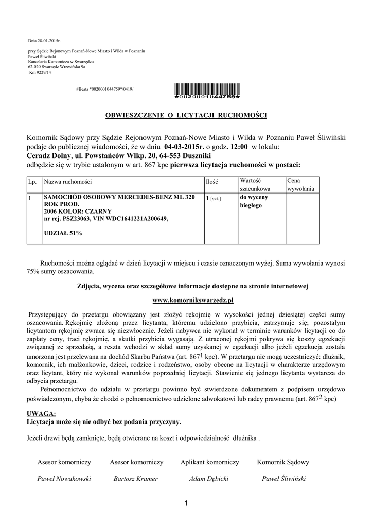 Dnia 28-01-2015r. przy Sądzie Rejonowym Poznań-Nowe Miasto i Wilda w Poznaniu Paweł Śliwiński Kancelaria Komornicza w Swarzędzu 62-020 Swarzędz Wrzesińska 9a Km 9229/14 *0020001044759* #Beata *0020001044759*/0419/ OBWIESZCZENIE O LICYTACJI RUCHOMOŚCI Komornik Sądowy przy Sądzie Rejonowym Poznań-Nowe Miasto i Wilda w Poznaniu Paweł Śliwiński podaje do publicznej wiadomości, że w dniu 04-03-2015r. o godz. 12:00 w lokalu: Ceradz Dolny, ul. Powstańców Wlkp. 20, 64-553 Duszniki odbędzie się w trybie ustalonym w art. 867 kpc pierwsza licytacja ruchomości w postaci: Lp. Nazwa ruchomości Ilość 1 SAMOCHÓD OSOBOWY MERCEDES-BENZ ML 320 ROK PROD. 2006 KOLOR: CZARNY nr rej. PSZ23063, VIN WDC1641221A200649, 1 [szt.] Wartość szacunkowa do wyceny biegłego Cena wywołania UDZIAŁ 51% Ruchomości można oglądać w dzień licytacji w miejscu i czasie oznaczonym wyżej. Suma wywołania wynosi 75% sumy oszacowania. Zdjęcia, wycena oraz szczegółowe informacje dostępne na stronie internetowej www.komornikswarzedz.pl Przystępujący do przetargu obowiązany jest złożyć rękojmię w wysokości jednej dziesiątej części sumy oszacowania. Rękojmię złożoną przez licytanta, któremu udzielono przybicia, zatrzymuje się; pozostałym licytantom rękojmię zwraca się niezwłocznie. Jeżeli nabywca nie wykonał w terminie warunków licytacji co do zapłaty ceny, traci rękojmię, a skutki przybicia wygasają. Z utraconej rękojmi pokrywa się koszty egzekucji związanej ze sprzedażą, a reszta wchodzi w skład sumy uzyskanej w egzekucji albo jeżeli egzekucja została umorzona jest przelewana na dochód Skarbu Państwa (art. 8671 kpc). W przetargu nie mogą uczestniczyć: dłużnik, komornik, ich małżonkowie, dzieci, rodzice i rodzeństwo, osoby obecne na licytacji w charakterze urzędowym oraz licytant, który nie wykonał warunków poprzedniej licytacji. Stawienie się jednego licytanta wystarcza do odbycia przetargu. Pełnomocnictwo do udziału w przetargu powinno być stwierdzone dokumentem z podpisem urzędowo poświadczonym, chyba że chodzi o pełnomocnictwo udzielone adwokatowi lub radcy prawnemu (art. 8672 kpc) UWAGA: Licytacja może się nie odbyć bez podania przyczyny. Jeżeli drzwi będą zamknięte, będą otwierane na koszt i odpowiedzialność dłużnika . Asesor komorniczy Asesor komorniczy Aplikant komorniczy Komornik Sądowy Paweł Nowakowski Bartosz Kramer Adam Dębicki Paweł Śliwiński 1