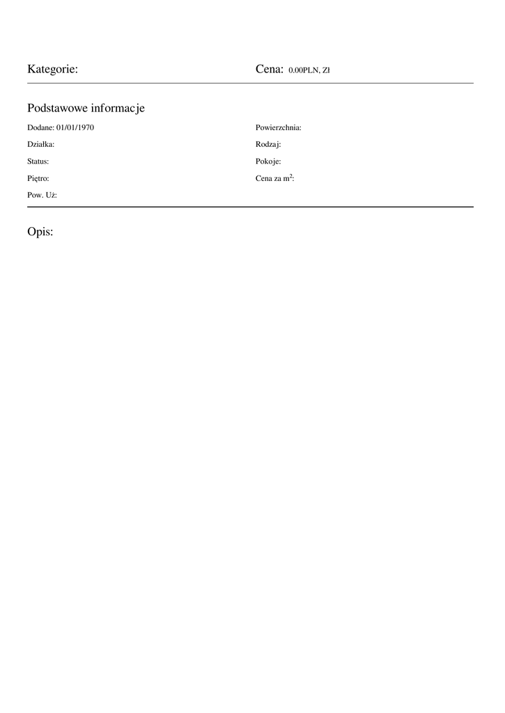 Kategorie: Cena: 0.00PLN, Zł Podstawowe informacje Dodane: 01/01/1970 Powierzchnia: Działka: Rodzaj: Status: Pokoje: Piętro: Cena za m²: Pow. Uż: Opis: Powered by TCPDF (www.tcpdf.org)