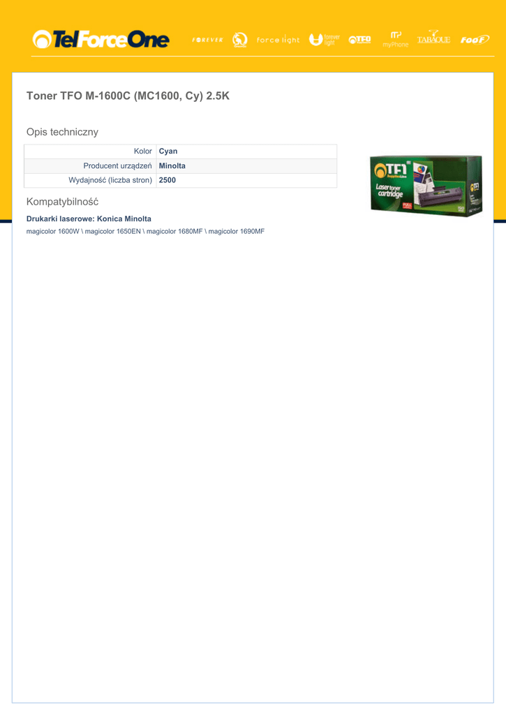 Toner TFO M-1600C (MC1600, Cy) 2.5K Opis techniczny Kolor Cyan Producent urządzeń Minolta Wydajność (liczba stron) 2500 Kompatybilność Drukarki laserowe: Konica Minolta magicolor 1600W \ magicolor 1650EN \ magicolor 1680MF \ magicolor 1690MF
