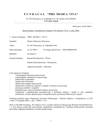 F U N D A C J A "PRO MUSICA VIVA" 01-703 Warszawa, ul. Gąbińska 9 m. 64, tel/fax (22) 8348465 www.pmv.org.pl ______________________________________________________________________________________________________________________________________ Warszawa, 26.03.2007 r. Sprawozdanie z działalności Fundacji "Pro Musica Viva" w roku 2006. 1. Nazwa Fundacji: "PRO MUSICA VIVA" Siedziba: Miasto Stołeczne Warszawa Adres: 01-703 Warszawa, ul. Gąbińska 9/64 Data rejestracji: 21.10.1998 r.; REGON: 013244315 Zarząd Fundacji: Roman Rewakowicz - Prezes Nr księgi rejestrowej: KRS 0000045491 Jolanta Dzierżanowska - Wiceprezes Agata Kwiecińska – Sekretarz Cele statutowe Fundacji: wspomaganie instytucji muzycznych wspomaganie szkolnictwa muzycznego fundowanie stypendiów fundowanie koncertów fundowanie nagrań muzycznych fundowanie wydań nut, partytur i książek o tematyce muzycznej promocję solistów i zespołów popularyzację i upowszechnianie kultury muzycznej wspieranie i popularyzacja przedsięwzięć z dziedziny kultury i sztuki, w tym: spektakli teatralnych, wystaw plastycznych, fotograficznych, prezentacji filmowych i innych. Fundacja posiada status Organizacji Pożytku Publicznego - Monitor Sądowy i Gospodarczy nr 222 z dnia 15 listopada 2004 r., poz. 155987, s.113. Dnia 31.08.2005 Fundacja „Pro Musica Viva” została wpisana do Krajowego Rejestru Przedsiębiorców i z tym dniem rozpoczęła prowadzenie działalności gospodarczej. Fundacja jednocześnie przestała prowadzić odpłatną działalność pożytku publicznego. 1 Fundacja może prowadzić działalność gospodarczą w następującym zakresie: 1. Organizacja koncertów. 2. Organizacja przedstawień operowych, operetkowych i musicalowych. 3. Organizacja przedstawień teatralnych. 4. Organizacja wystaw. 5. Wydawanie nagrań muzycznych i nut. 6. Wydawanie książek o tematyce muzycznej. 7. Wydawanie czasopism i wydawnictw periodycznych. 8. Inna działalność wydawnicza związana z muzyką. 9. Produkcja filmów muzycznych. 10. Organizacja pokazów filmów muzycznych Od 31.08.2005 r. w ramach działalności gopodarczej Fundacja wydaje czasopismo “Glissando” 2. W 2006 roku Fundacja "Pro Musica Viva" organizowała i wspierała finansowo następujące przedsięwzięcia: a) Wydała 2 numery czasopisma “Glissando”, które jest popularyzatorskim pismem poświęconym wszystkim ambitnym zjawiskom muzyki współczesnej oraz innym sztukom prezentowanym w związku z nią. Pismo wydawane jest w nakładzie 1200 egz. i rozprowadzane na terenie całego kraju poprzez sieć EMPIK oraz poprzez księgarnie, z którymi Fundacja ma kontakt bezpośredni. Fundacja rozprowadza także czasopismo nieodpłatnie w ramach działalności pożytku publicznego. Redakcja „Glissanda” prowadzi również stronę internetową czasopisma: www.glissando.pl W roku 2006 wydano 2 numery: Nr 8 w marcu oraz Nr 9 we wrześniu. Wydawanie czasopisma “Glissando” jest realizacją celów statutowych Fundacji – popularyzacja i rozpowszechnianie kultury muzycznej. b) W sezonie letnim (lipiec – sierpień) zorganizowała cykl wieczorów słowno-muzycznych pt. “Salon Warszawski” w Pałacu Paca (siedziba Ministestwa Zdrowia) z udziałem młodych muzyków i aktorów – w większości studentów warszawskich wyższych szkół artytystycznych – Akademii Muzycznej im. F. Chopina i Akademii Teatralnej im. A. Zelwerowicza, tworząc w ten sposób scenę dla młodych artystów rozpoczynających swoją profesjonalną drogę. c) We współpracy z Warszawskim Towarzystwem Muzycznym 16 listopada 2006 r. Zorganizowała Koncert Kameralny Muzyki Polskiej i Ukraińskiej w Pałacyku Szustra w Warszawie z udziałem Piotra Cegielskiego – skrzypce i Etelli Czupryk – fortepian. Koncert ten wpisuje się w budowanie przez Fundację polsko-ukraińskich “muzycznych mostów”, które Fundacja realizuje od początku swej działalności. 3. Fundacja w 2006 roku osiągnęła następujące przychody: - darowizny w tym: • Z tyt.1% podatku 6.631,49 • Osoby fizyczne 15.500,00 • Krajowe osoby prawne 15.000,00 • Zagraniczne osoby prawne 17.000,00 - dotacje budżetowe - działalność gospodarcza - pozostałe przychody operacyjne działaności gospodarczej 2 54.131,49 zł 62.740,00 zł 26.091,04 zł 7.928,46 zł w tym: • umowa o udziale w przedsięwzięciu 7.928,46 - odsetki bankowe RAZEM 1,45 zł___ 150.892,44 zł 5. Fundacja w 2006 roku przeznaczyła kwoty: na cele statutowe 83.843,24 zł na wydatki administracyjne działalaności statutowej 9.893,95 zł koszty działalności gospodarczej 24.995,60 zł na wydatki administracyjne działalaności gospodarczej 4.727,10 zł ___________________________________________ RAZEM 123.459,89 zł 6. Fundacja w 2006 roku zatrudniała 1 pracownika na następujących stanowiskach: Prezes Zarządu - 1/2 etatu 7. Fundacja w 2006 roku przeznaczyła: na umowy o dzieło (prawa autorskie) umowy zlecenia umowy z osobowego funduszu płac narzuty na wynagrodzenia RAZEM 37.000,00 zł 5.700,00 zł 9.888,00 zł 1.354,28 zł 53.942,28 zł Członkowi zarządu na stanowisku prezesa w 2006 r. zostało wypłacone wynagrodzenie z osobowego funduszu płac w wykości brutto 9.888,00 zł. 8. W 2006 roku Fundacja prowadziła następującą działalność zleconą przez podmioty państwowe i samorządowe: a) SALON WARSZAWSKI (punkt 2, podpunkt b niniejszego sprawozdania) uzyskując dotację na ten cel od Miasta Stołecznego Warszawy w wysokości 50.000,00 zł. Koszt całkowity zadania wyniósł 62.750,99 zł. b) KONCERT KAMERALNY (punkt 2, podpunkt c niniejszego sprawozdania) uzyskując dotację od Miasta Stołecznego Warszawy w wysokości 12.740,00 zł. Koszt całkowity zadania wyniósł 14.521,94 zł. 9. Fundacja prowadząc działalność gospodarczą jest zwolniona z obowiązku składania miesięcznych deklaracji podatkowych CIT-2 w związku z przeznaczeniem 100% zysku na realizację zadań statutowych. 10. Na dzień 31 grudnia 2006 r. na Fundacji c