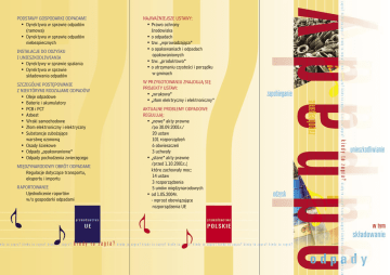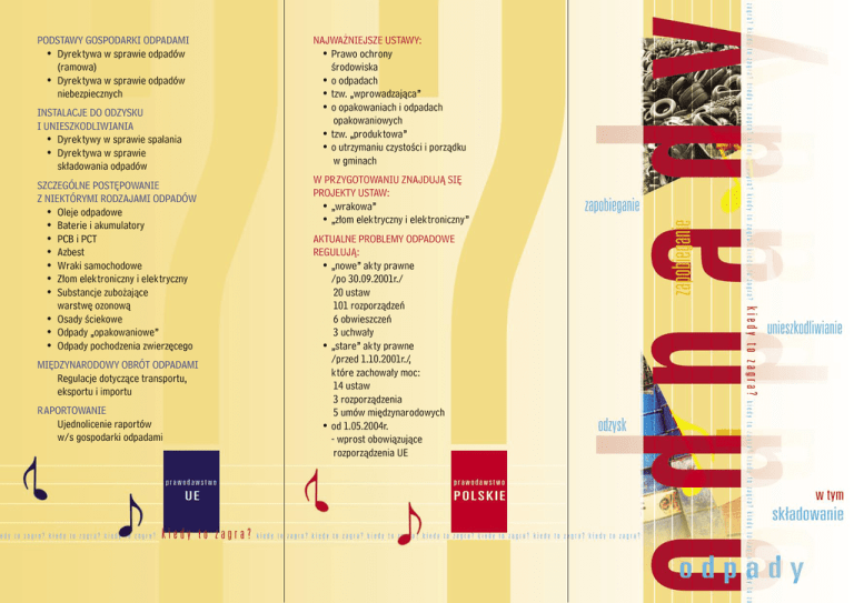 PODSTAWY GOSPODARKI ODPADAMI • Dyrektywa w sprawie odpadów (ramowa) • Dyrektywa w sprawie odpadów niebezpiecznych INSTALACJE DO ODZYSKU I UNIESZKODLIWIANIA • Dyrektywy w sprawie spalania • Dyrektywa w sprawie składowania odpadów SZCZEGÓLNE POSTĘPOWANIE Z NIEKTÓRYMI RODZAJAMI ODPADÓW • Oleje odpadowe • Baterie i akumulatory • PCB i PCT • Azbest • Wraki samochodowe • Złom elektroniczny i elektryczny • Substancje zubożające warstwę ozonową • Osady ściekowe • Odpady „opakowaniowe” • Odpady pochodzenia zwierzęcego MIĘDZYNARODOWY OBRÓT ODPADAMI Regulacje dotyczące transportu, eksportu i importu RAPORTOWANIE Ujednolicenie raportów w/s gospodarki odpadami NAJWAŻNIEJSZE USTAWY: • Prawo ochrony środowiska • o odpadach • tzw. „wprowadzająca” • o opakowaniach i odpadach opakowaniowych • tzw. „produktowa” • o utrzymaniu czystości i porządku w gminach W PRZYGOTOWANIU ZNAJDUJĄ SIĘ PROJEKTY USTAW: • „wrakowa” • „złom elektryczny i elektroniczny” AKTUALNE PROBLEMY ODPADOWE REGULUJĄ: • „nowe” akty prawne /po 30.09.2001r./ 20 ustaw 101 rozporządzeń 6 obwieszczeń 3 uchwały • „stare” akty prawne /przed 1.10.2001r./, które zachowały moc: 14 ustaw 3 rozporządzenia 5 umów międzynarodowych • od 1.05.2004r. - wprost obowiązujące rozporządzenia UE - jednolita interpretacja prawa /strona www.mos.gov.pl/ - wskazane zmiany umożliwiające: • gminom zarządzanie odpadami komunalnymi (gminy właścicielami odpadów) • wprowadzenie podatku „śmieciowego” • nakładanie sankcji na samorządy za nie wywiązywanie się z ustawowych obowiązków • prawidłowe gospodarowanie osadami ściekowymi - tworzenie dogodnych instrumentów finansowych stymulujących powstanie efektywnego i profesjonalnego przemysłu gospodarki odpadami, w szczególności: • mechanizmy finansowe wspierające odzysk i unieszkodliwianie • wzrost wykorzystania odpadów jako alternatywnych źródeł energii i surowców alternatywnych (np. w przemyśle cementowym, materiałów budowlanych, energetyce) - doskonalenie umiejętności pozyskiwania funduszy pomocowych/dokumentacja + wnioski/ - wzmocnienie administracji rządowej i samorządowej, w tym rozbudowa służb kontrolnych i monitorujących ZADANIA finansów w zakresie NAJPILNIEJSZE - pełne dostosowanie do prawa UE: • ustawa „wrakowa” • ustawa o „złomie elektronicznym” • wydanie wszystkich aktów wykonawczych ZADANIA prawa w zakresie NAJPILNIEJSZE NAJPILNIEJSZE ZADANIA w zakresie organizacyjnym - powołanie Rady Gospodarki Odpadami bądź koordynatorów krajowych, wojewódzkich i powiatowych ds. gospodarki odpadami, a nawet poszczególnych strumieni odpadów - ustalenie priorytetów w planach gospodarki odpadami na wszystkich szczeblach, w tym ustalenie harmonogramów i zasad finansowania, monitorowanie wdrożenia planów - tworzenie międzygminnych systemów gospodarki odpadami - stworzenie systemu baz danych o odpadach: • krajowe centrum informacji o odpadach • wojewódzka baza danych o wytwarzaniu i postępowaniu z odpadami - prowadzenie edukacji ekologicznej, w szczególności poprzez media, centra edukacji ekologicznej, szkolnictwo wszystkich szczebli