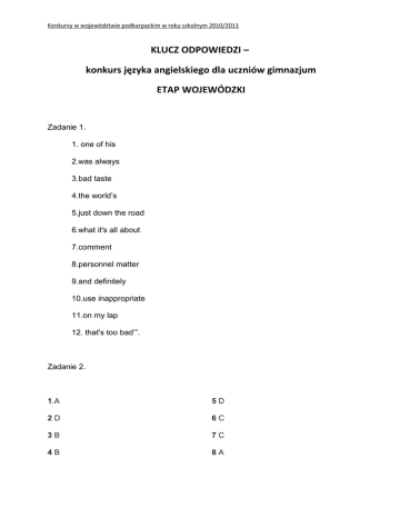Konkursy w województwie podkarpackim w roku szkolnym 2010/2011 KLUCZ ODPOWIEDZI – konkurs języka angielskiego dla uczniów gimnazjum ETAP WOJEWÓDZKI Zadanie 1. 1. one of his 2.was always 3.bad taste 4.the world’s 5.just down the road 6.what it's all about 7.comment 8.personnel matter 9.and definitely 10.use inappropriate 11.on my lap 12. that's too bad’”. Zadanie 2. 1.A 5D 2D 6C 3B 7C 4B 8A Konkursy w województwie podkarpackim w roku szkolnym 2010/2011 Zadanie 3. 1. 2. 3. 4. 5. 6. How long were the passengers waiting for the train? What does she often think of? How old will your grandfather be next year? Who thinks we were too noisy? Where did she send the letter last week? What would they like to eat? Zadanie 4. 1. Scotland 2. Ben Nevis 3. The „pilgrim fathers” sailed to America in the „Mayflower” 4. People send each other Valentine cards and give Valentine presents 5. On Christmas morning 6. Northern Ireland 7. Wales 8. England 9. The Stars and Stripes (or Old Glory) 10. 50 11. Independence Day 12. Neil Armstrong 13. Washington D.C. 14. France Zadanie 5. 1.was thirsty 2.are read every day 3.have to ask for permission 4.mustn't (can't) fish in this lake 5.were from London, they would tell you the way 6. was ill Konkursy w województwie podkarpackim w roku szkolnym 2010/2011 Zadanie 6. 6-punktów -wszystkie 3 elementy treści listu są zawarte. Brak błędów. Komunikacja przekazana poprawnie 5-punktów -wszystkie 3 elementy treści listu są zawarte. gramatycznych. Błędy nieliczne, nie zakłócające komunikacji Brak błędów 4-punkty -wszystkie elementy są zawarte, ale nie ma informacji na temat podróży do domu. Nieliczne błędy -1 błąd gramatyczny dopuszczalny, informacja przekazana pomyślnie. 3-punkty -wszystkie elementy treści podjęte ale ilość błędów uniemożliwia zrozumienie informacji przez czytelnika 2-punkty- informacja o pobycie zawarta, ale brak informacji o powrocie do domu i zaproszeniu kolegi do siebie. Błędy gramatyczne. Każda inna poprawna odpowiedź, która nie jest ujęta w kluczu będzie brana pod uwagę.
