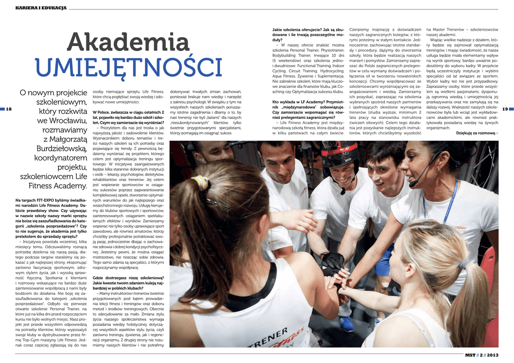 kariera i edukacja Akademia umiejętności 18 O nowym projekcie szkoleniowym, który rozkwita we Wrocławiu, rozmawiamy z Małgorzatą Burdziełowską, koordynatorem projektu, szkoleniowcem Life Fitness Academy. Na targach FIT-EXPO byliśmy świadkami narodzin Life Fitness Academy. Daliście prawdziwy show. Czy używając w nazwie szkoły nazwy marki sprzętu nie boisz się zaszufladkowania do kategorii „szkolenia posprzedażowe”? Czy to nie sugeruje, że akademia jest tylko pretekstem do sprzedaży sprzętu? − Inicjatywa powstała wcześniej, kilka miesięcy temu. Odczuwaliśmy rosnącą potrzebę dzielenia się naszą pasją, dlatego podczas targów staraliśmy się pokazać z jak najlepszej strony, eksponując zarówno fascynację sportowym, zdrowym stylem życia, jak i wysoką sprawność fizyczną. Spotkania z klientami i rozmowy wskazujące na bardzo duże zainteresowanie współpracą z nami były bodźcem do działania. Nie boję się zaszufladkowania do kategorii „szkolenia posprzedażowe”. Odbyło się pierwsze otwarte szkolenie Personal Trainer, na które już na kilka dni przed rozpoczęciem kursu nie było wolnych miejsc. Nasz projekt jest przede wszystkim odpowiedzią na potrzeby klientów, którzy wyposażyli swoje kluby w dystrybuowane przez firmę Top-Gym maszyny Life Fitness. Jednak coraz częściej zgłaszają się do nas osoby niemające sprzętu Life Fitness, które chcą pogłębiać swoją wiedzę i zdobywać nowe umiejętności. W Polsce, zwłaszcza w ciągu ostatnich 2 lat, pojawiło się bardzo dużo szkół i szkoleń. Czym wy zamierzacie się wyróżniać? − Priorytetem dla nas jest troska o jak najwyższą jakość i zadowolenie klientów. Wyznacznikiem doboru tematów i treści naszych szkoleń są ich potrzeby oraz pojawiające się trendy. Z pewnością będziemy wyróżniać się projektem, którego celem jest optymalizacja treningu sportowego. W inicjatywę zaangażowanych będzie kilka starannie dobranych instytucji i osób – lekarzy, psychologów, dietetyków, rehabilitantów oraz trenerów. Jej celem jest wspieranie sportowców w osiąganiu sukcesów poprzez zagwarantowanie kompleksowej opieki, stworzenie optymalnych warunków do jak najlepszego oraz wszechstronnego rozwoju. Usługę kierujemy do klubów sportowych i sportowców, zainteresowanych osiąganiem spektakularnych efektów i wyników. Zamierzamy wspierać nie tylko osoby uprawiające sport zawodowo, ale również amatorów, którzy chcieliby profesjonalnie potraktować swoją pasję, jednocześnie dbając o zachowanie zdrowia i dobrej kondycji psychofizycznej. Jesteśmy pewni, że można osiągać mistrzostwo, nie niszcząc sobie zdrowia. Tego samo zdania są specjaliści, z którymi rozpoczynamy współpracę. dokonywać trwałych zmian zachowań, ponieważ brakuje nam wiedzy i narzędzi z zakresu psychologii. W związku z tym na wszystkich naszych szkoleniach poruszamy istotne zagadnienia i dbamy o to, by nasi trenerzy nie byli „batami” dla naszych „niesubordynowanych” klientów, tylko świetnie przygotowanymi specjalistami, którzy pomagają im osiągnąć sukces. Jakie szkolenia oferujecie? Jak są zbudowane i ile trwają poszczególne moduły? − W naszej ofercie znaleźć można szkolenia Personal Trainer, Physiotrainer, Bodybuilding Trainer, trwające 10 dni (5 weekendów) oraz szkolenia jednoi dwudniowe: Functional Training, Indoor Cycling, Circuit Training, Hydrocycling, Aqua Fitness, Żywienie i Suplementacja. Nie zabraknie szkoleń, które mają kluczowe znaczenie dla finansów klubu, jak Coaching czy Optymalizacja sukcesu klubu. Kto wykłada w LF Academy? Przymiotnik „międzynarodowa” zobowiązuje. Czy zamierzacie wspomagać się również prelegentami zagranicznymi? − Life Fitness Academy jest międzynarodową szkołą fitness, która działa już w kilku państwach na całym świecie. Czerpiemy inspirację z doświadczeń naszych zagranicznych kolegów, z którymi jesteśmy w stałym kontakcie. Jednocześnie, zachowując istotne standardy i procedury, dążymy do stworzenia szkoły, która będzie realizacją naszych marzeń i pomysłów. Zamierzamy zapraszać do Polski zagranicznych prelegentów w celu wymiany doświadczeń i połączenia sił w tworzeniu nowatorskich koncepcji. Chcemy współpracować ze szkoleniowcami wyróżniającymi się zaangażowaniem i wiedzą. Zamierzamy ich pozyskać, zapraszając na szkolenia wybranych spośród naszych partnerów i spełniających określone wymagania trenerów (studia wyższe, minimum 2 lata pracy na stanowisku instruktora ćwiczeń siłowych). Celem tego działania jest pozyskanie najlepszych instruktorów, których chcielibyśmy wyszkolić na Master Trenerów – szkoleniowców naszej akademii. Wiążąc wielkie nadzieje z działem, który będzie się zajmował optymalizacją treningów, i mając świadomość, że nasza usługa będzie miała elementarny wpływ na wynik sportowy, bardzo uważnie podeszliśmy do wyboru kadry. W projekcie będą uczestniczyły instytucje i wybitni specjaliści od lat związani ze sportem. Wybór kadry też nie jest przypadkowy. Zapraszamy osoby, które przede wszystkim są wielkimi pasjonatami, dysponują ogromną wiedzą i umiejętnością jej przekazywania oraz nie zamykają się na dalszy rozwój. Większość naszych szkole19 niowców była lub wciąż jest wykładowcami akademickimi, ale również praktykowała posiadaną wiedzę na żywych organizmach. Dziękuję za rozmowę.< Gdzie dostrzegasz niszę szkoleniową? Jakie kwestie twoim zdaniem kuleją najbardziej w polskich klubach? − Mamy instruktorów i trenerów świetnie przygotowanych pod kątem prowadzenia lekcji fitness i treningów oraz doboru metod i środków treningowych. Obecnie to zdecydowanie za mało. Zmiana stylu życia naszego społeczeństwa wymaga posiadania wiedzy holistycznej, dotyczącej wszystkich aspektów stylu życia, czyli zarówno treningu, żywienia, jak i regeneracji organizmu. Z 