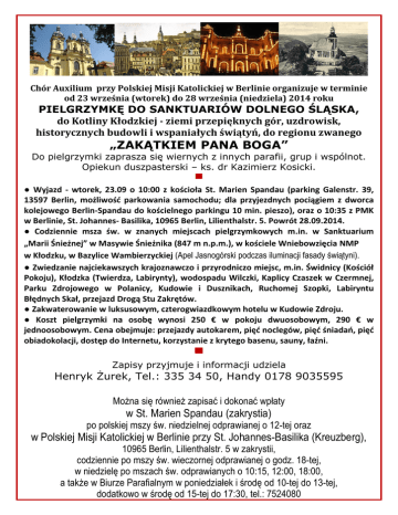 Chór Auxilium przy Polskiej Misji Katolickiej w Berlinie organizuje w terminie od września wtorek do 8 września niedziela roku PIELGRZYMKĘ DO SANKTUARIÓW DOLNEGO ŚLĄSKA, do Kotliny Kłodzkiej - ziemi przepięknych gór, uzdrowisk, historycznych budowli i wspaniałych świątyń, do regionu zwanego „ZAKĄTKIEM PANA BOGA” Do pielgrzymki zaprasza się wiernych z innych parafii, grup i wspólnot. Opiekun duszpasterski – ks. dr Kazimierz Kosicki. ▀ ● Wyjazd - wtorek, 23.09 o 10:00 z koś ioła St. Marien Spandau (parking Galenstr. 39, 13597 Berlin, ożliwość parkowa ia sa o hodu; dla przyjezd y h po iągie z dworca kolejowego Berlin-Spa dau do koś iel ego parki gu i . pieszo), oraz o 10:35 z PMK w Berlinie, St. Johannes- Basilika, 10965 Berlin, Lilienthalstr. 5. Powrót 28.09.2014. ● Codzie ie sza św. w z a y h iejs a h pielgrzy kowy h .in. w Sanktuarium „Marii Ś ież ej” w Masywie Ś ież ika .p. . , w koś iele W ie owzię ia NMP w Kłodzku, w Bazylice Wambierzyckiej (Apel Jasnogórski podczas iluminacji fasady świątyni). ● )wiedza ie aj iekawszy h krajoz aw zo i przyrod i zo iejs , .i . Świd i y Koś iół Pokoju , Kłodzka Twierdza, La iry ty , wodospadu Wilczki, Kaplicy Czaszek w Czermnej, Parku Zdrojowego w Polanicy, Kudowie i Dusznikach, Ruchomej Szopki, Labiryntu Błęd y h Skał, przejazd Drogą Stu )akrętów. ● Zakwaterowanie w luksusowym, czterogwiazdkowym hotelu w Kudowie Zdroju. ● Koszt pielgrzy ki a oso ę wy osi € w pokoju dwuosobowym, € w jednoosobowym. Cena obejmuje: przejazdy autokarem, pięć o legów, pięć ś iadań, pięć o iadokola ji, dostęp do Internetu, korzystanie z krytego basenu, sauny, łaź i. ▀ Zapisy przyjmuje i informacji udziela Henryk Żurek, Tel.: 335 34 50, Handy 0178 9035595 Można się również zapisać i dokonać wpłaty w St. Marien Spandau (zakrystia) po polskiej mszy św. niedzielnej odprawianej o 12-tej oraz w Polskiej Misji Katolickiej w Berlinie przy St. Johannes-Basilika (Kreuzberg), 10965 Berlin, Lilienthalstr. 5 w zakrystii, codziennie po mszy św. wieczornej odprawianej o godz. 18-tej, w niedzielę po mszach św. odprawianych o 10:15, 12:00, 18:00, a także w Biurze Parafialnym w poniedziałek i środę od 10-tej do 13-tej, dodatkowo w środę od 15-tej do 17:30, tel.: 7524080